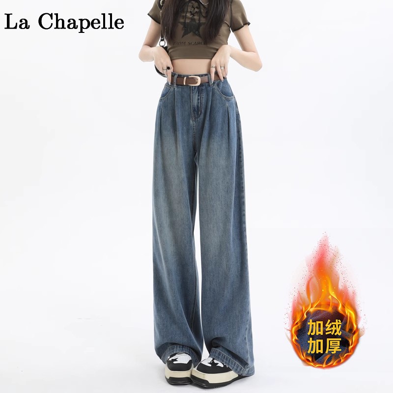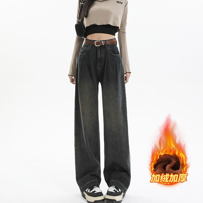 넓은 다리 청바지 여성의 가을과 겨울 2024 새로운 스타일 작은 게으른 높은 허리 레트로 느슨한 기모 스트레이트 바지