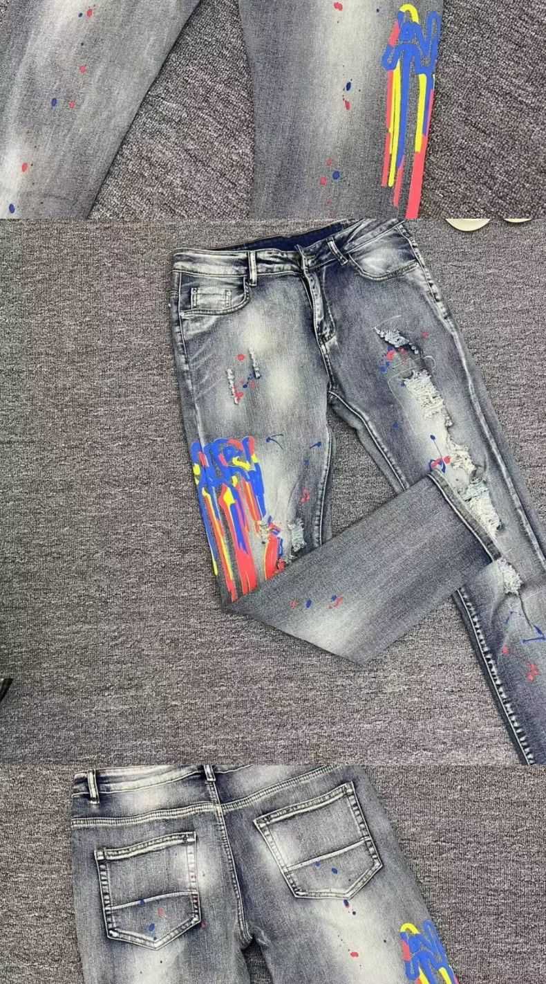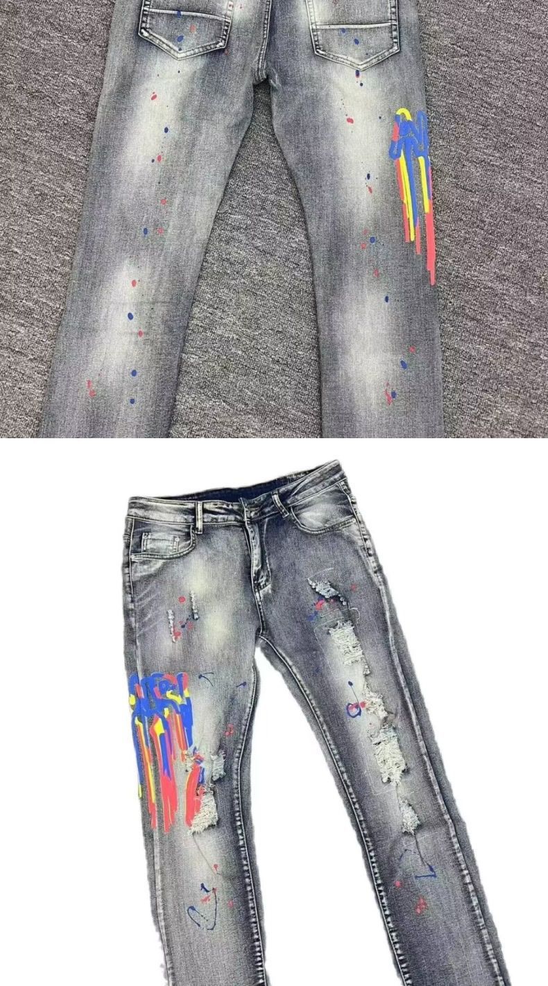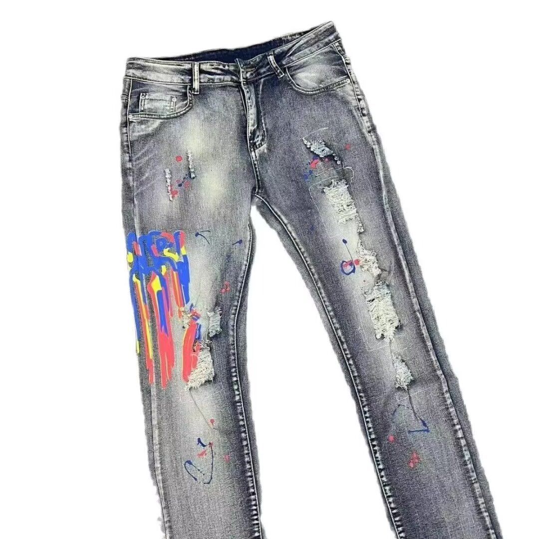 국경 청바지 남성 패션 브랜드 슬림 발 미국 하이 스트리트 잘 생긴 낙서 프린트 찢어진 바지 남성 패션 도매스토어 가기