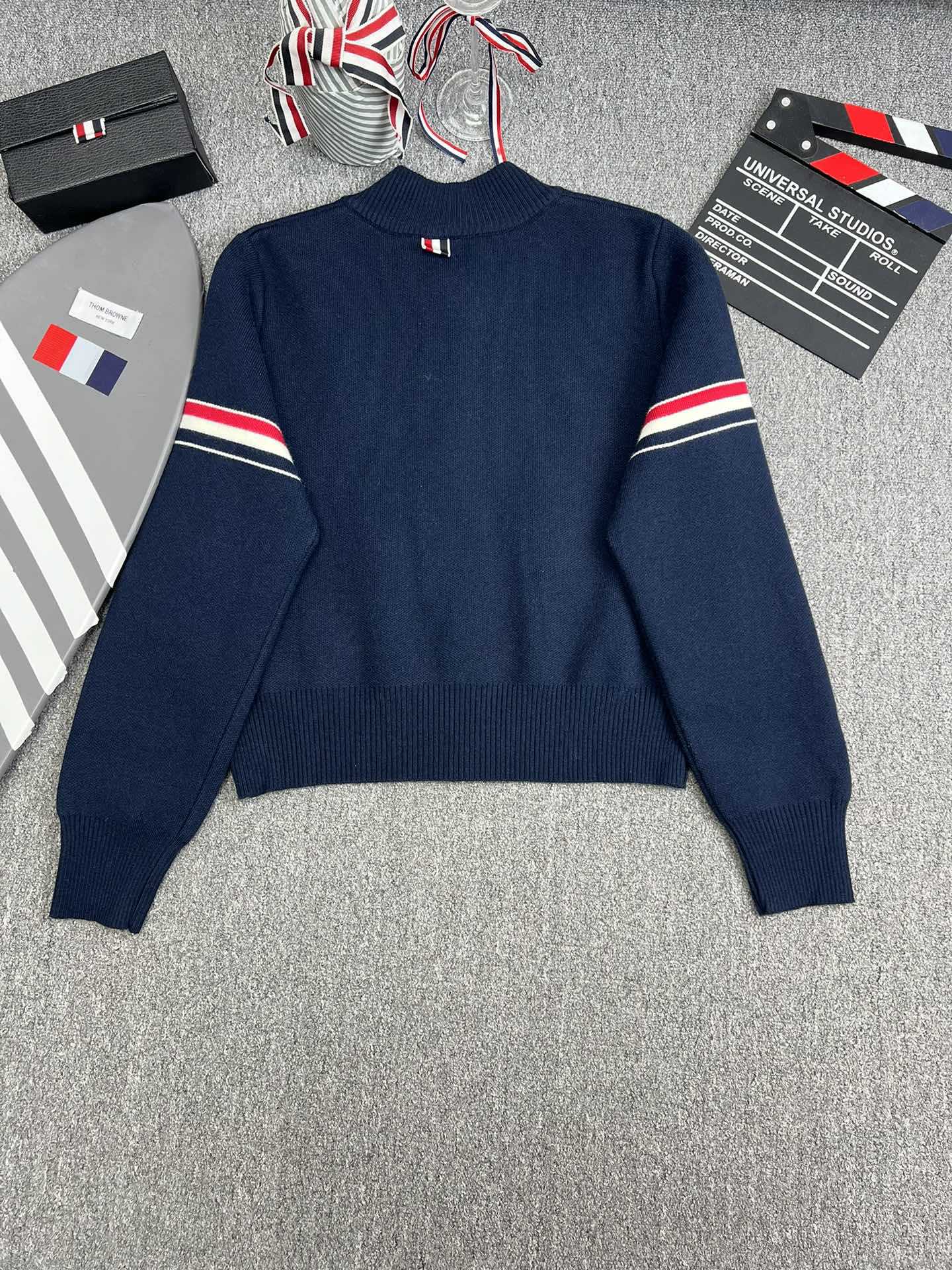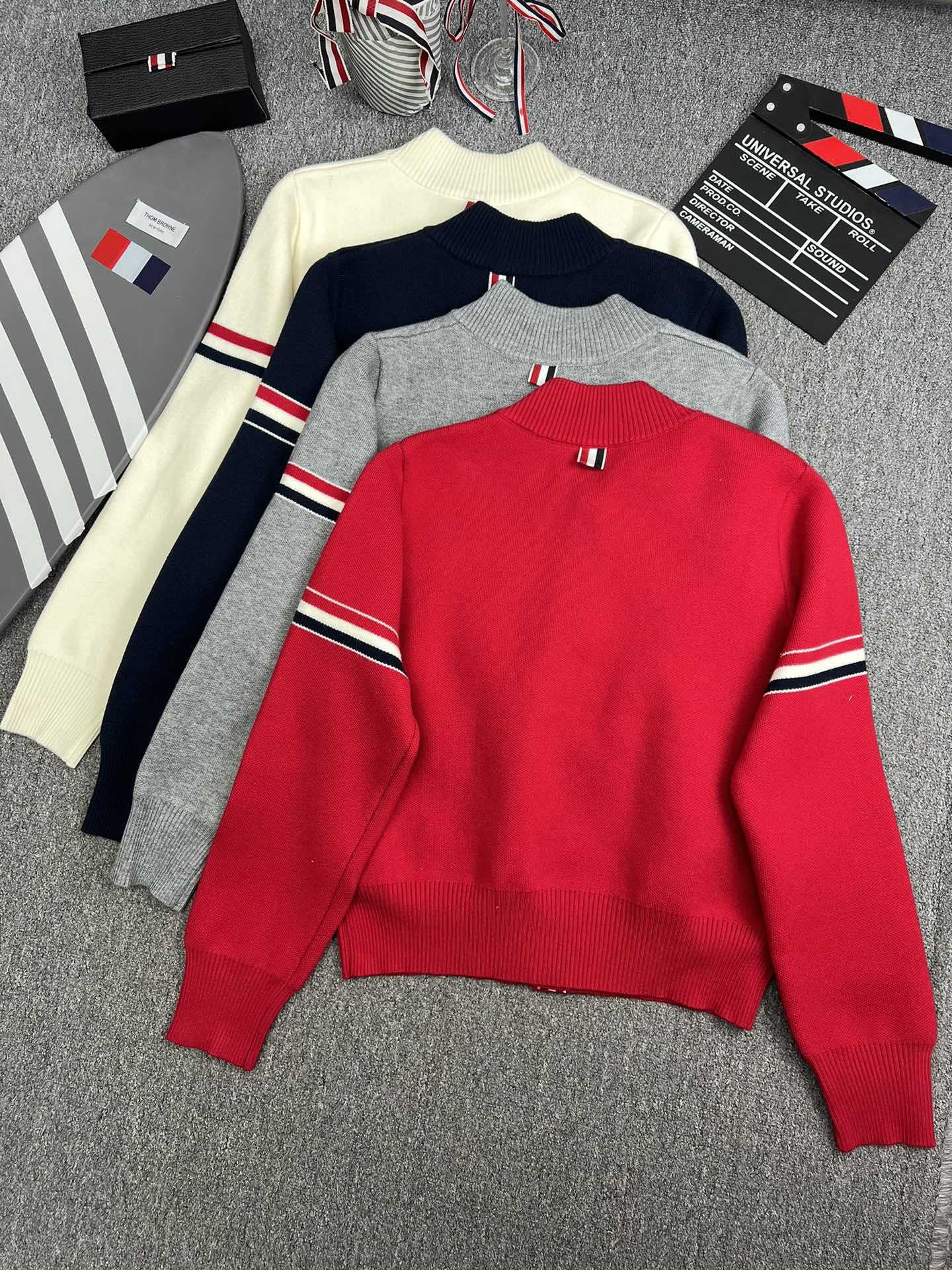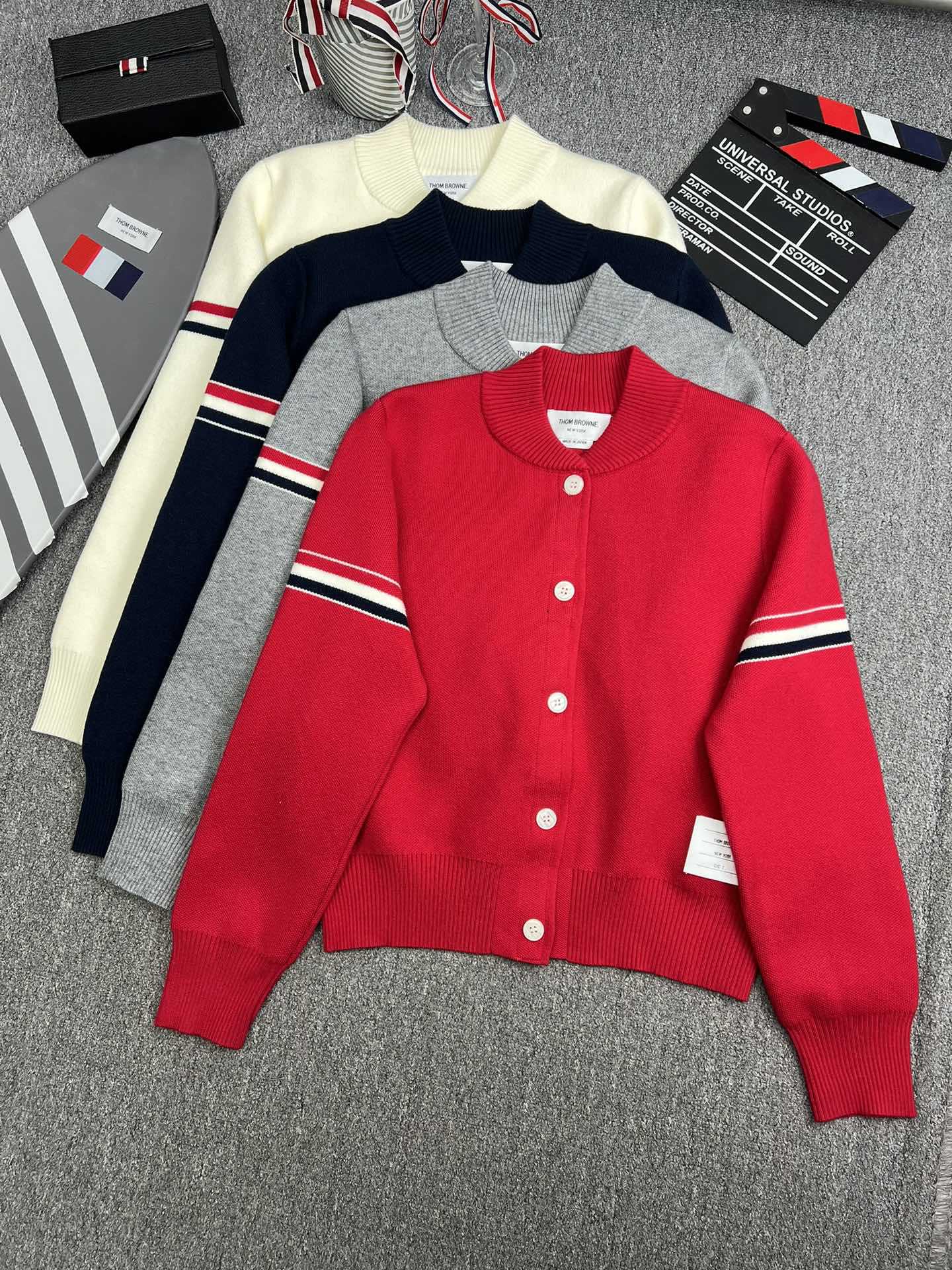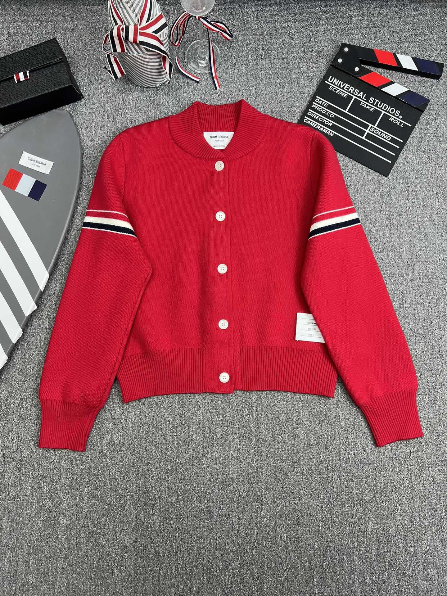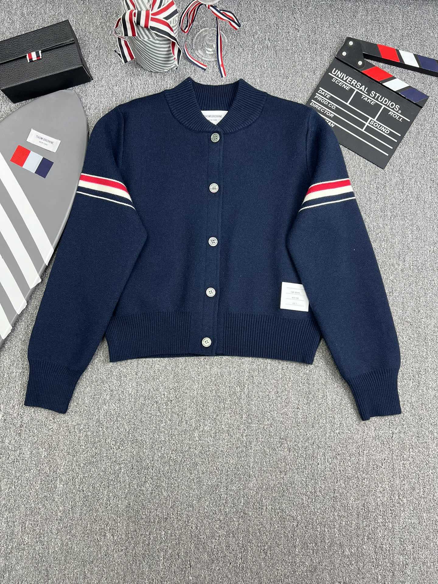 TB 공장 매장 하이 퀄리티 가을과 겨울 더블 소매 레드 화이트 블루 리본 스트라이프 긴 소매 칼라 여성 야구 세트 재킷스토어 가기