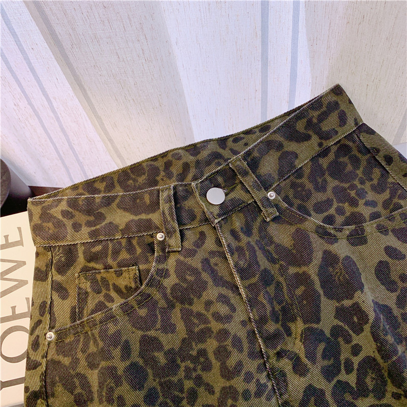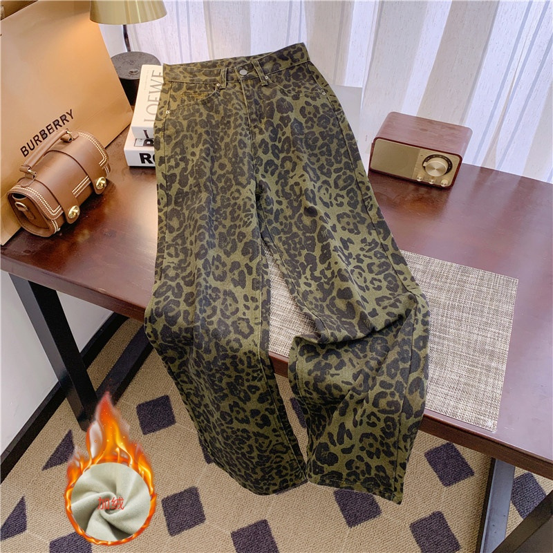 기모 아메리칸 스타일 높은 허리 레오파드 무늬 청바지 여성의 2024 가을 및 겨울 느슨한 하이 엔드 캐주얼 올 매치 와이드 레그 바지스토어 가기