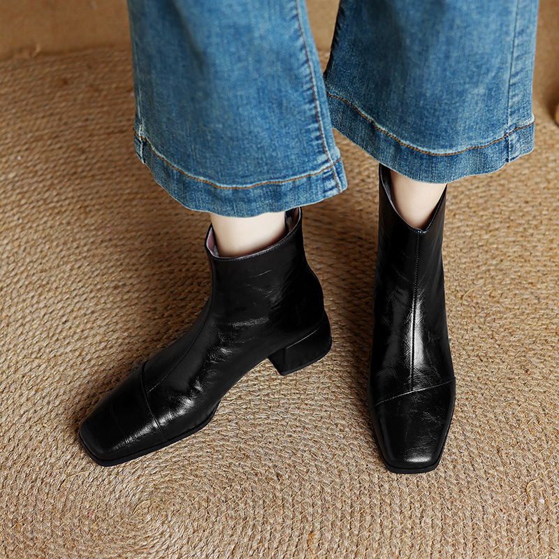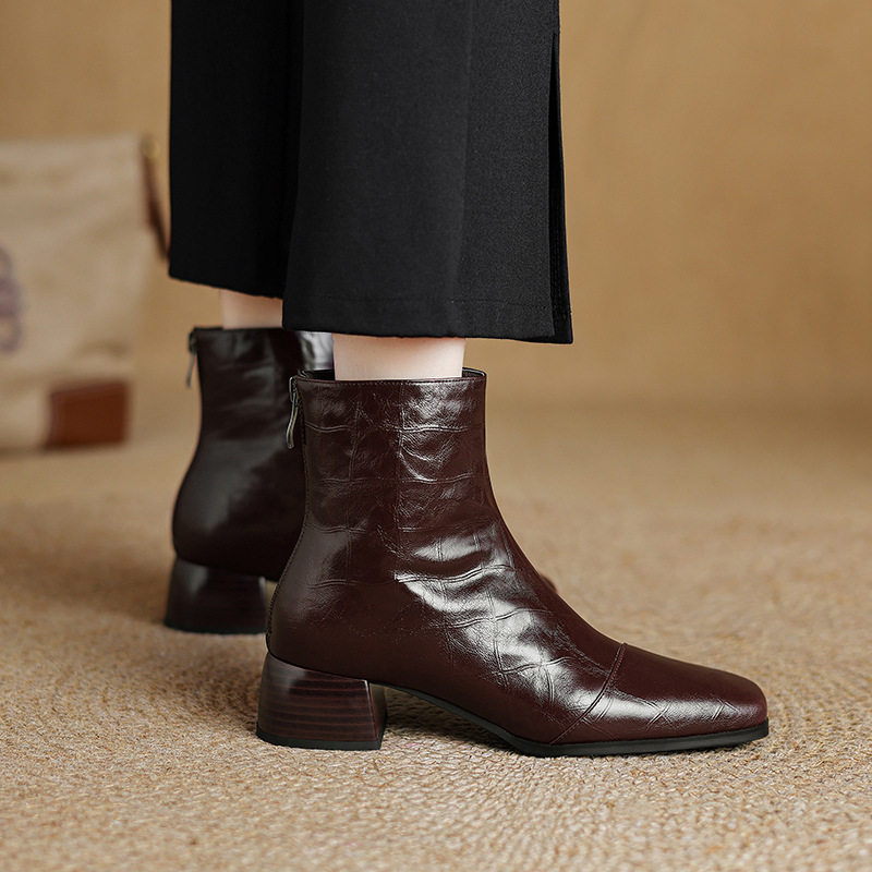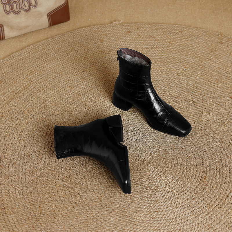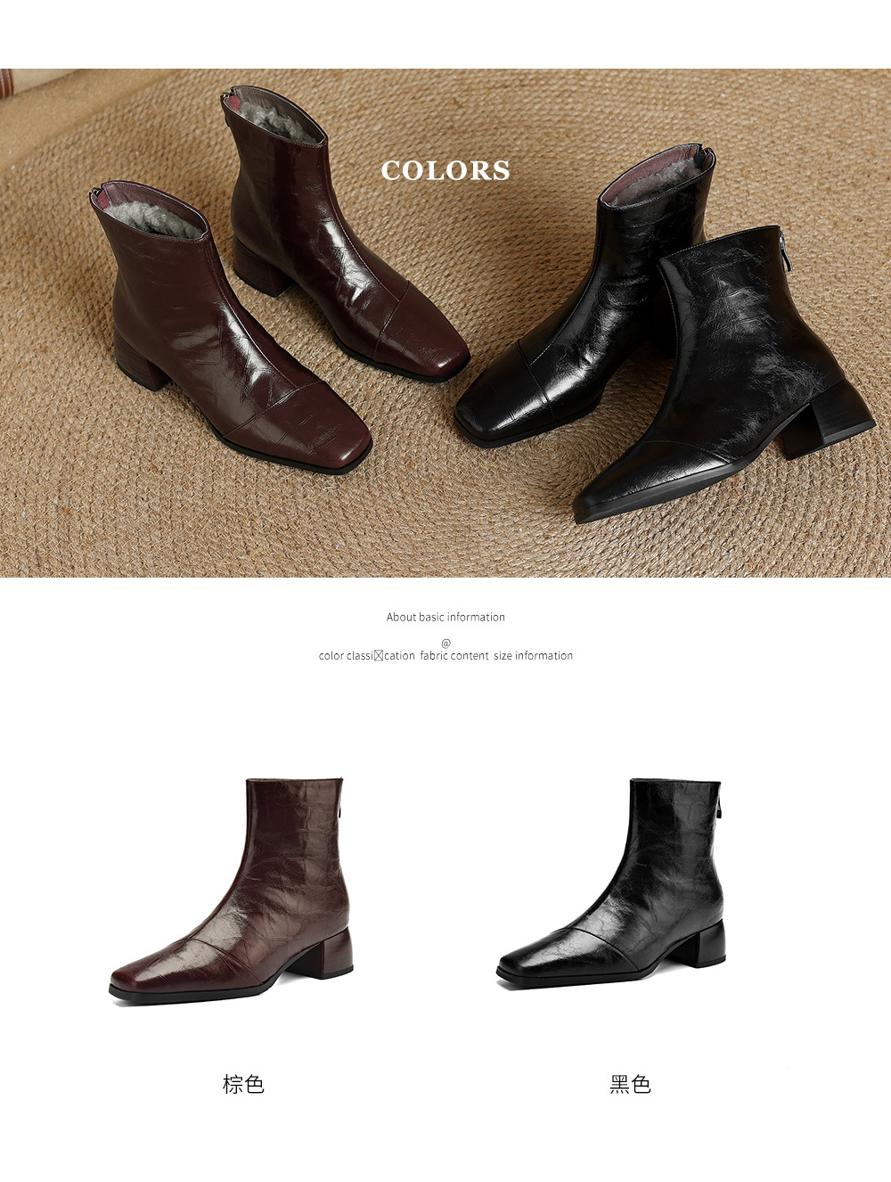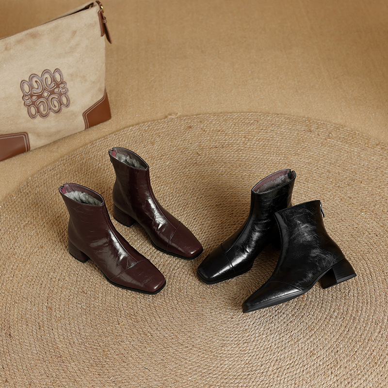 빈티지 거친 미드 힐 울 따뜻한 짧은 부츠 여성의 2024 년 겨울 새 마틴 부츠 Cowhide 리어 지퍼 스노우 부츠