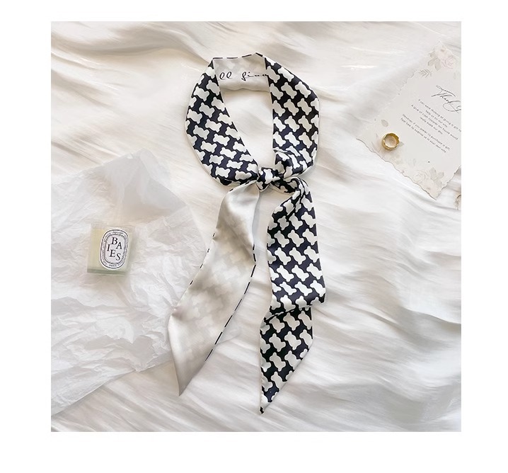 Ins 스타일 간단한 흑백 실크 스카프 줄무늬 격자 무늬 인쇄 헤어 밴드 헤어 타이 가방 리본 우아한 스카프 리본 여성용스토어 가기