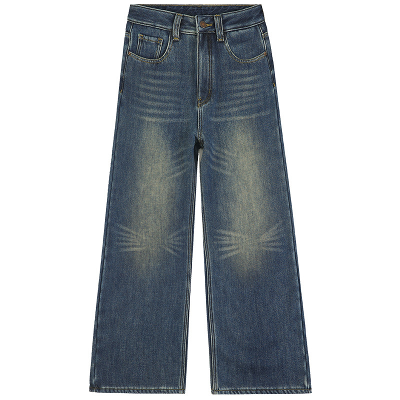 부미 하우스 # 느슨한 슬림 높은 허리 넓은 다리 바닥 바지 가을/겨울 중공업 세척 패턴 기모 여성용 두꺼운 청바지