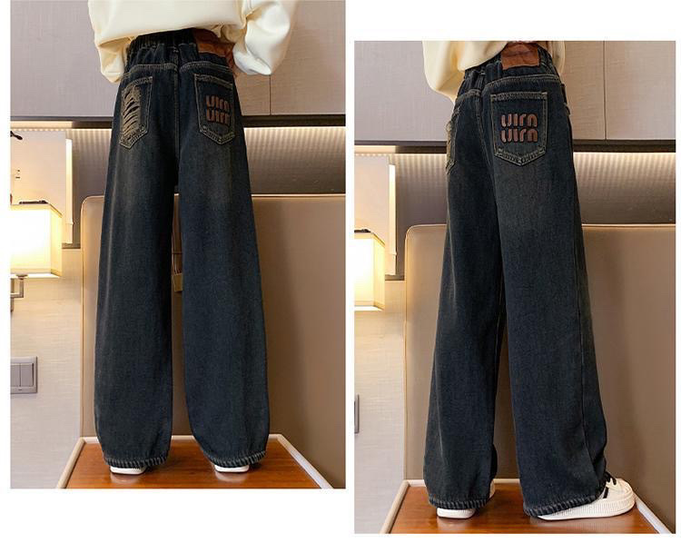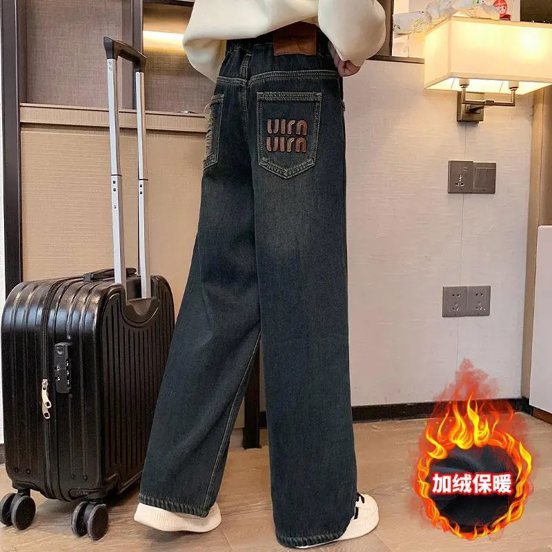 소녀 청바지 통합 기모 겨울 2024 새로운 느슨한 직선 넓은 다리 바지 큰 어린이 가을 긴 바지스토어 가기