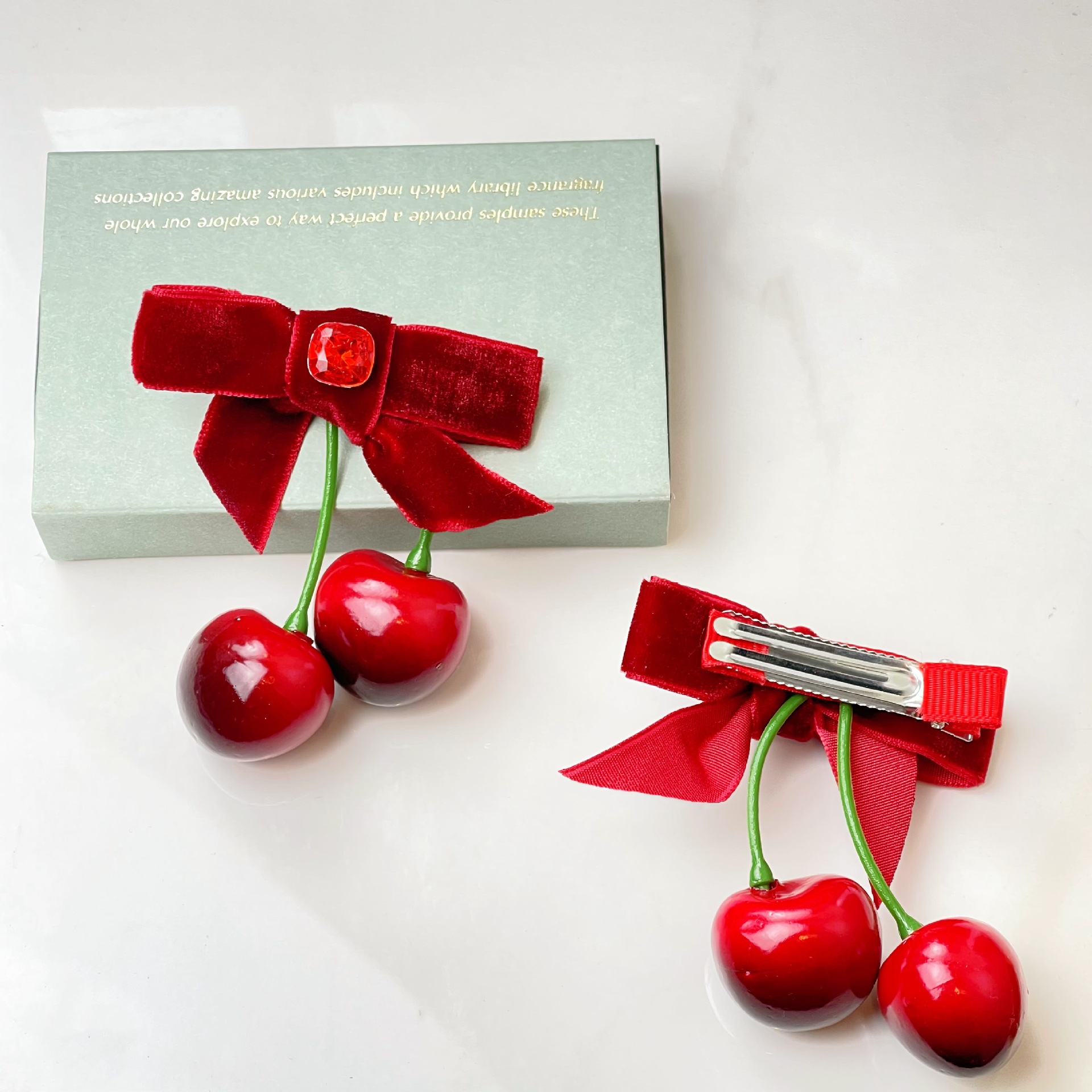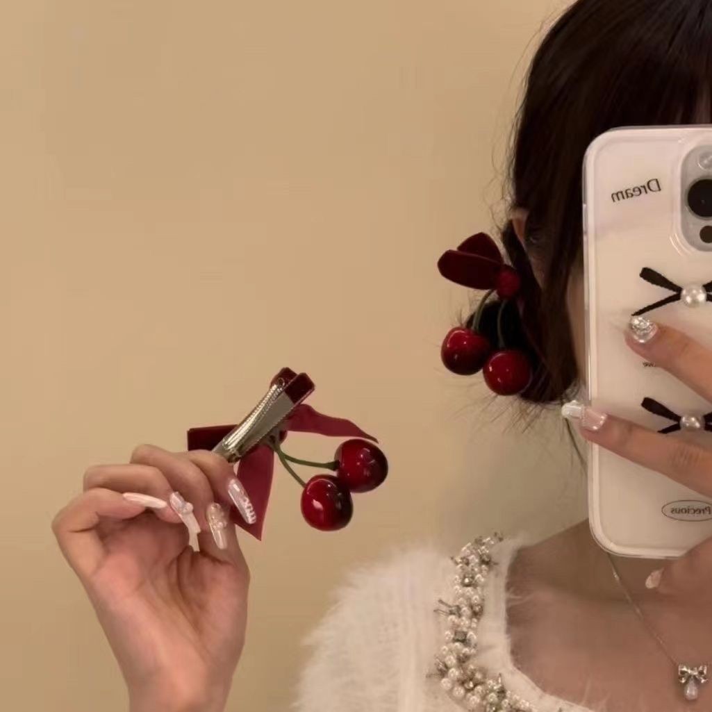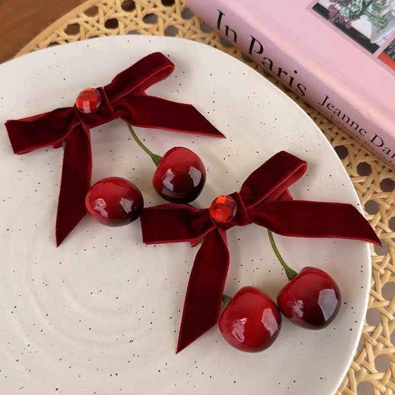 크로스보더 헤어 액세서리 레드 체리 벨벳 리본 헤어핀 사이드 클립 앞머리 핀 헤어 장식