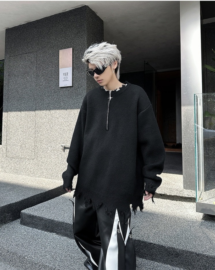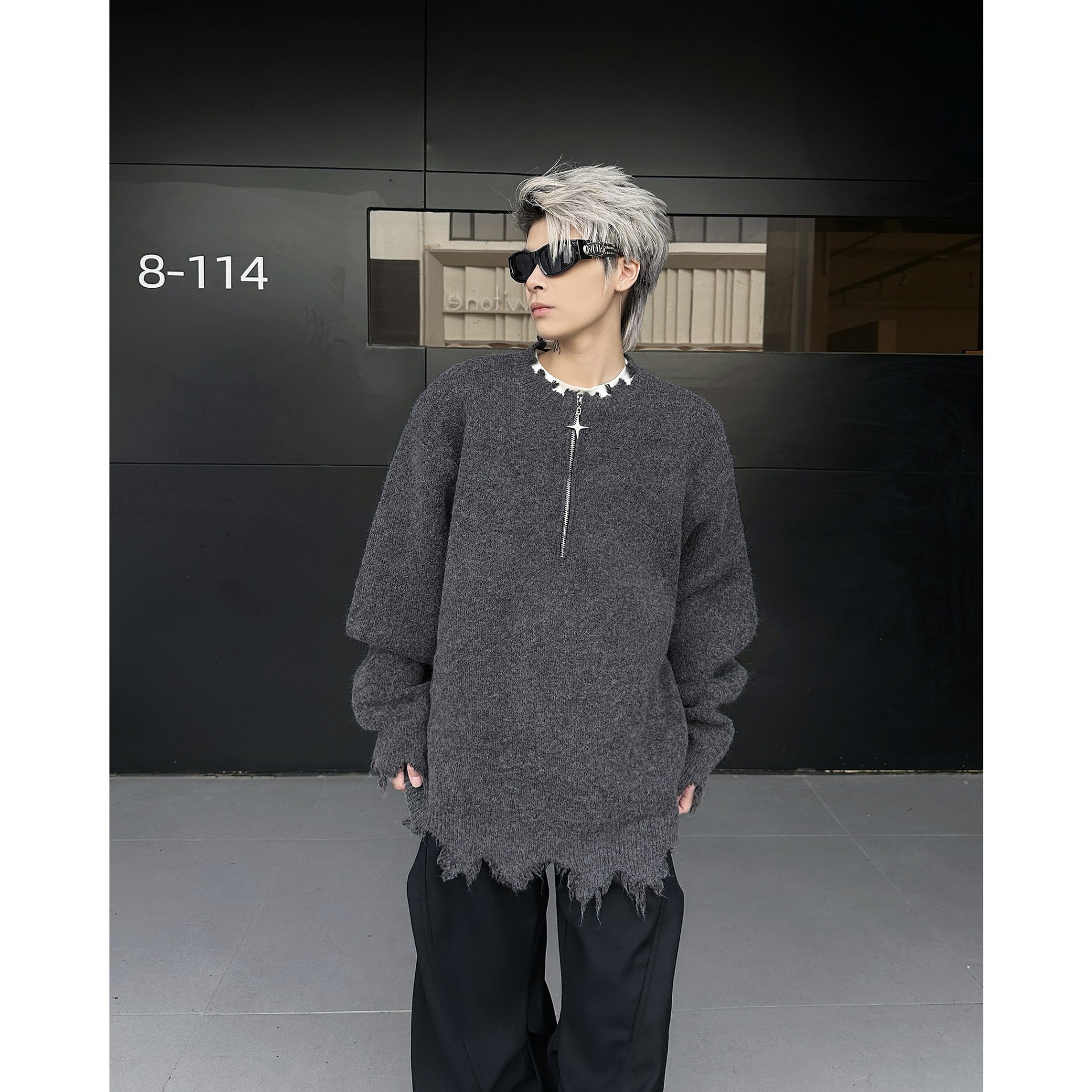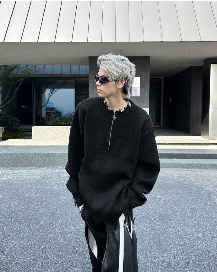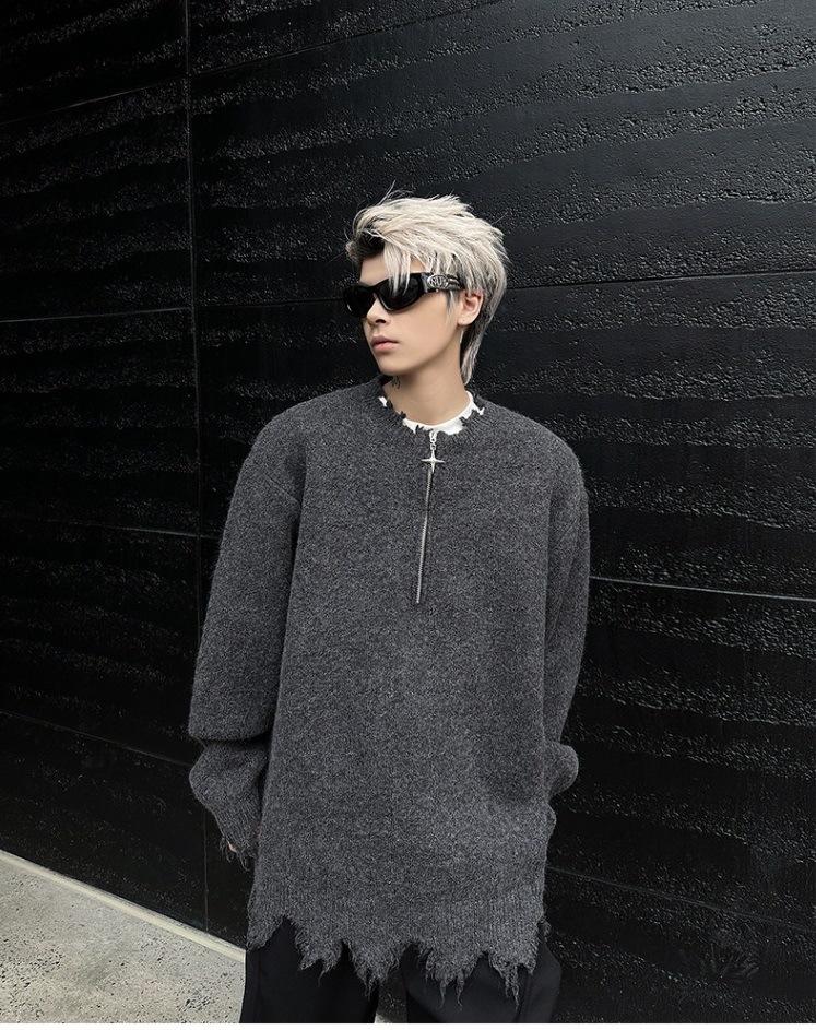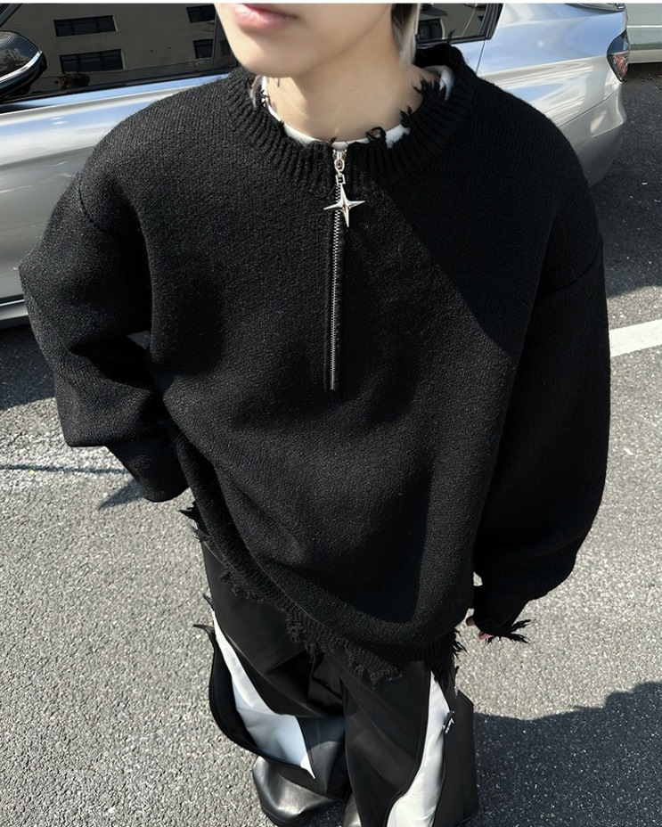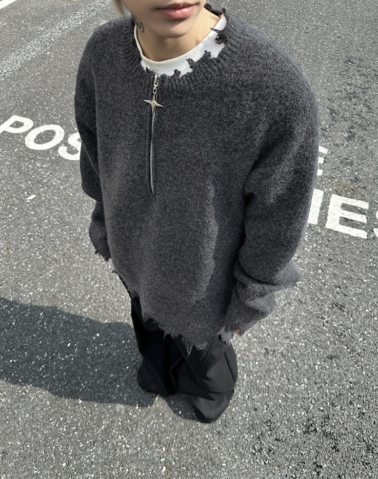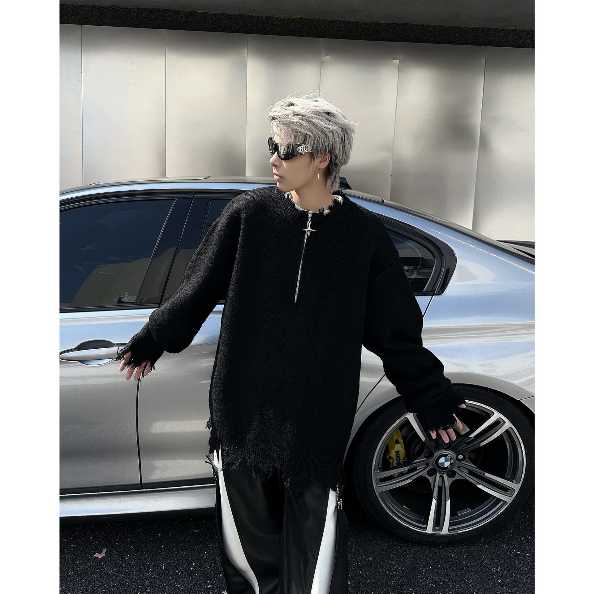 미국식 하이 스트리트 폐기물 토양 반 지퍼 깨진 풀오버 스웨터 남자의 가을과 겨울 느슨한 거리 디자인 센스 니트웨어