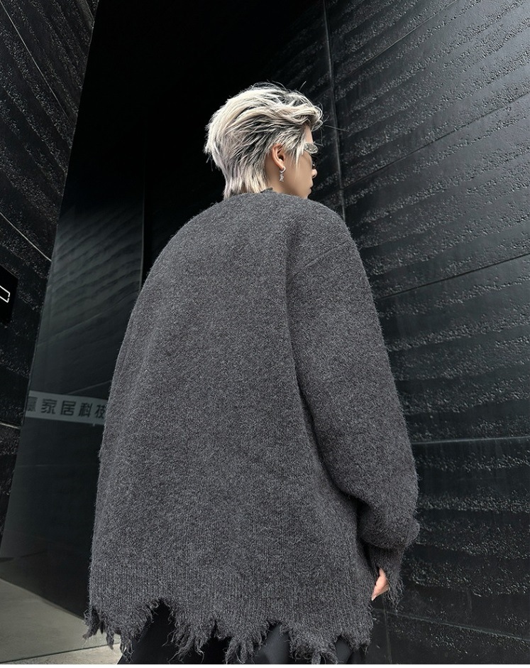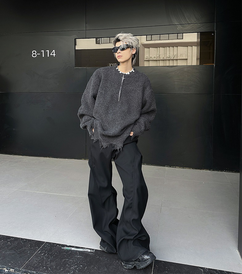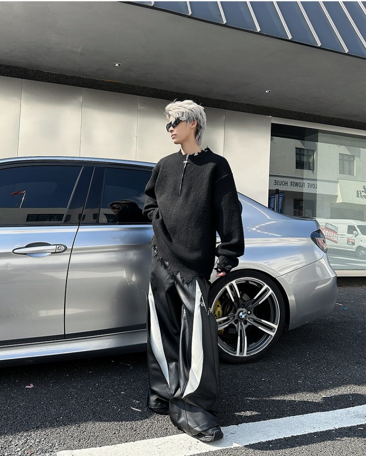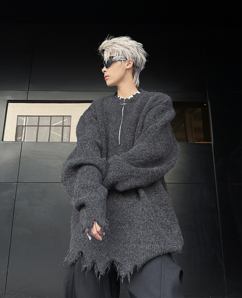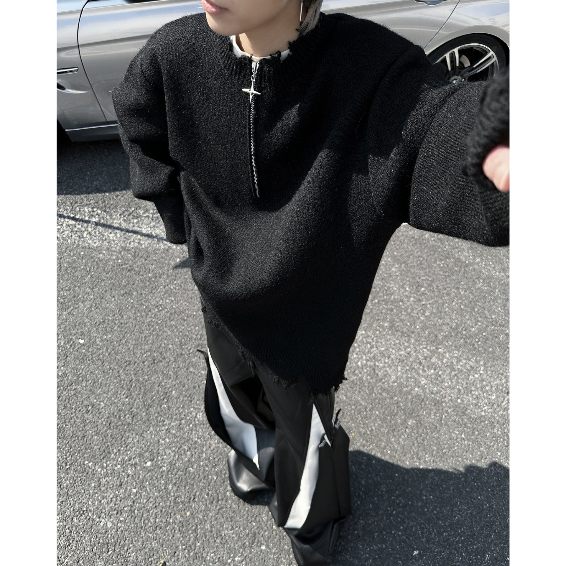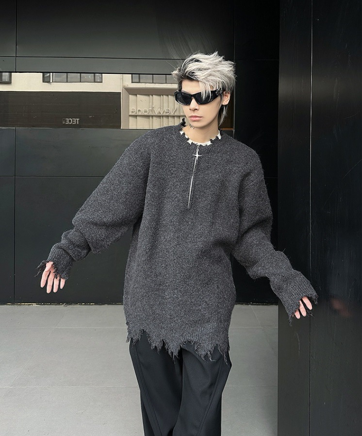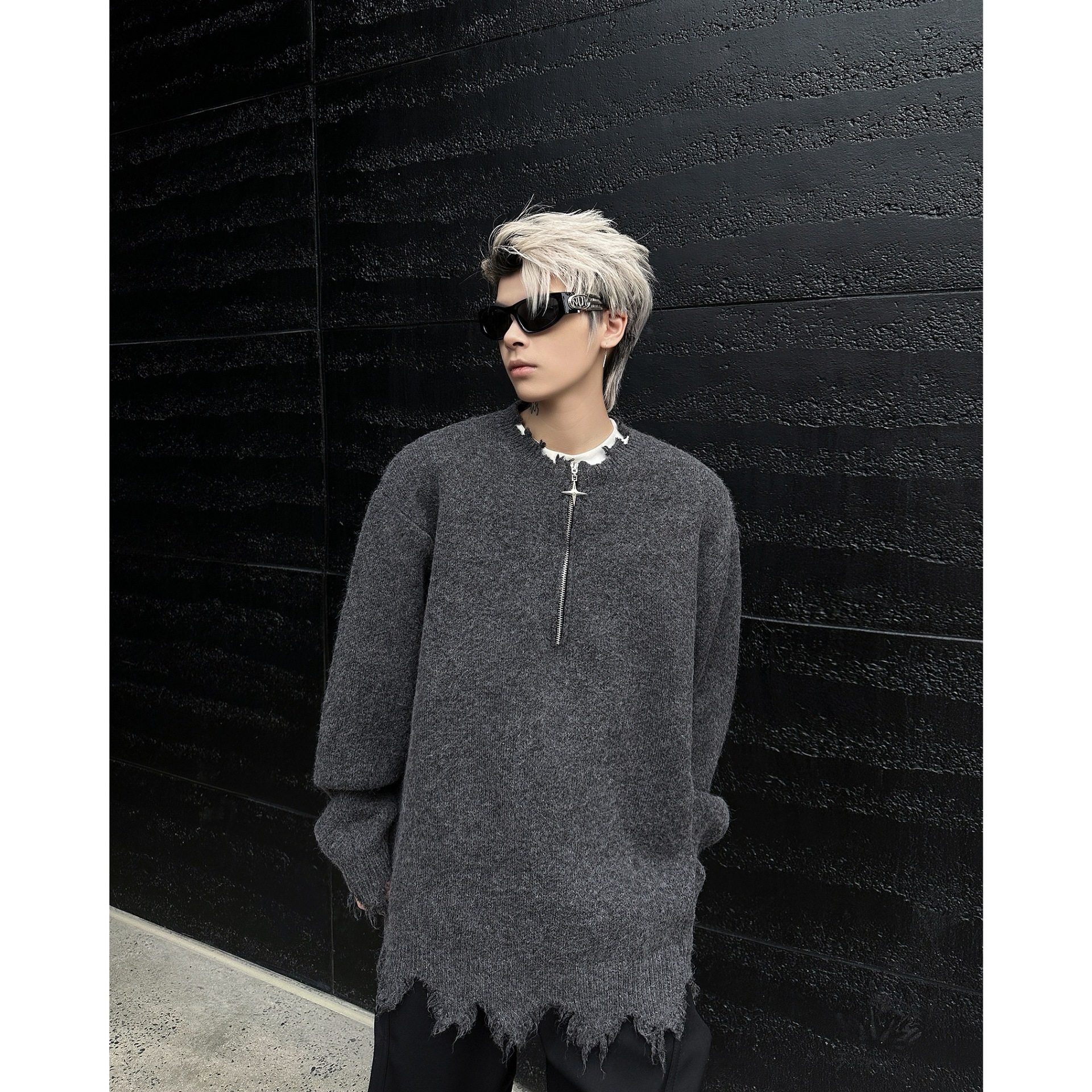 미국식 하이 스트리트 폐기물 토양 반 지퍼 깨진 풀오버 스웨터 남자의 가을과 겨울 느슨한 거리 디자인 센스 니트웨어