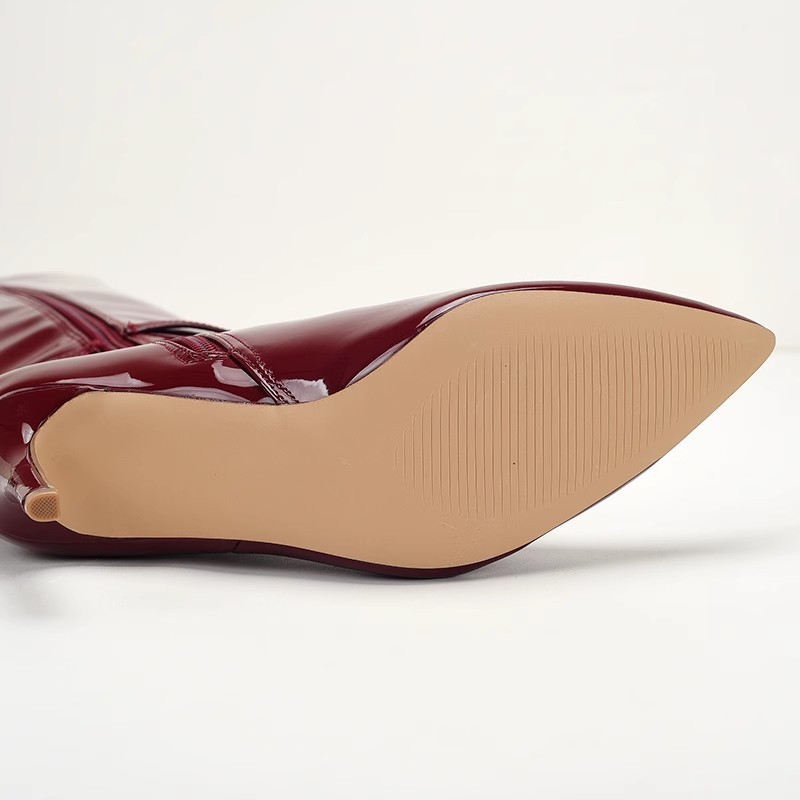 대외 무역 미국 오리지널 플러스 사이즈 4344 버건디 특허 가죽 뾰족한 하이힐 벨트 버클 지퍼 하이 부츠