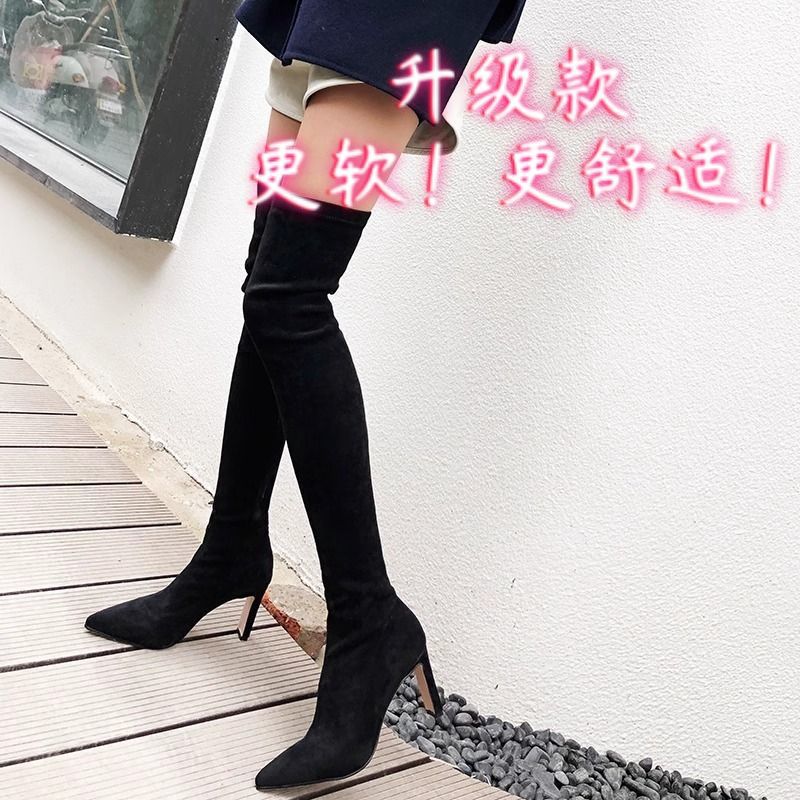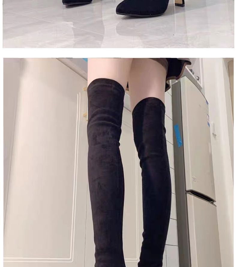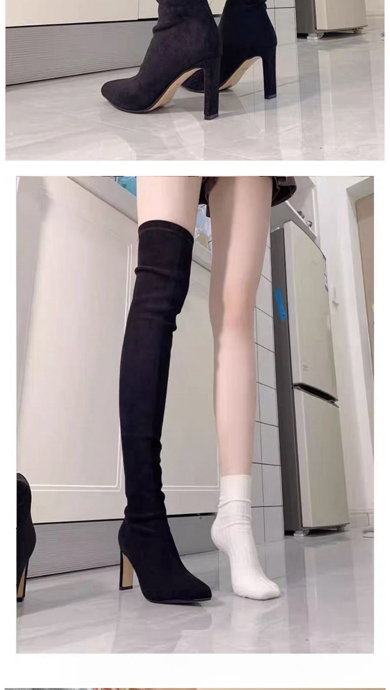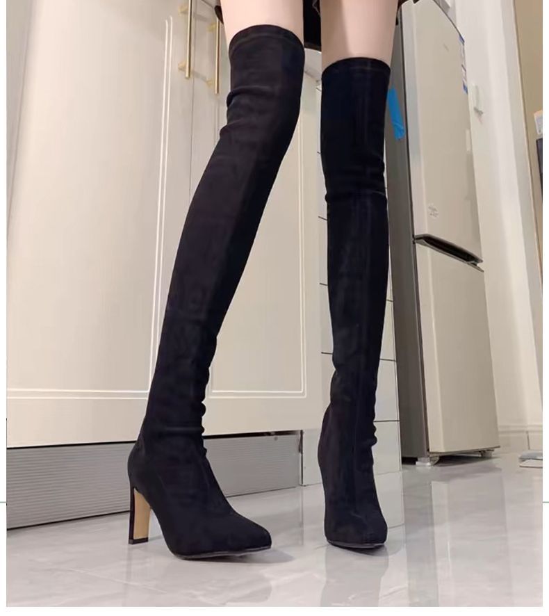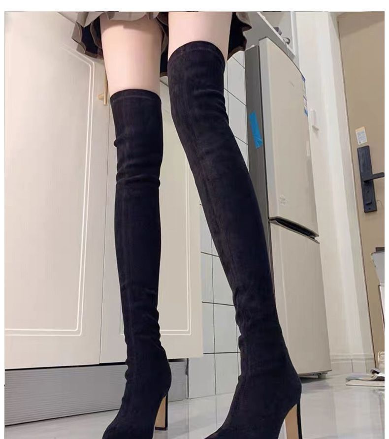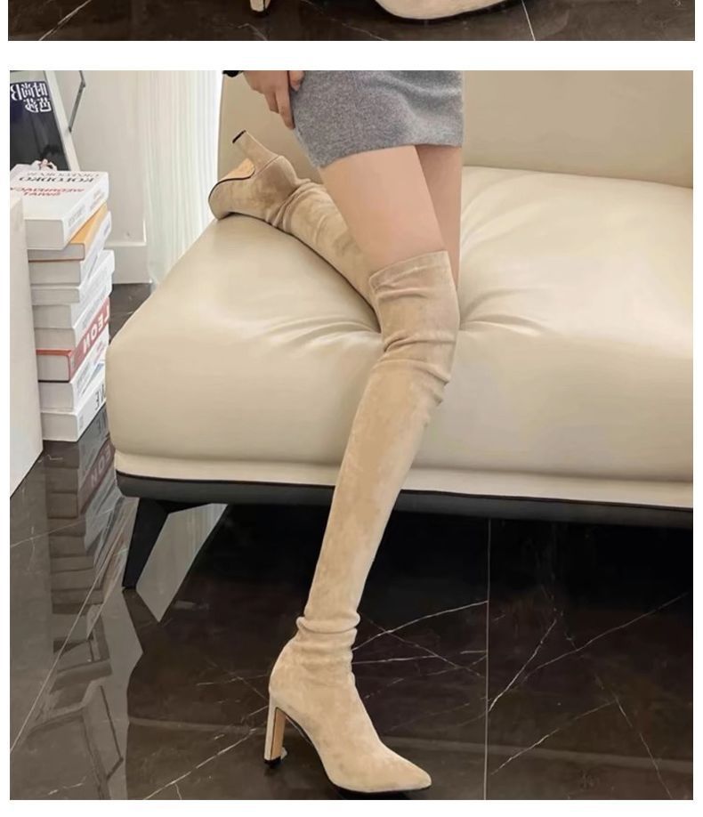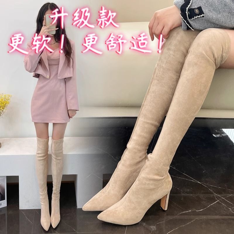 긴 무릎 긴 장화를 보여주는 슬리밍 여성용 2025 가을 및 겨울 양말 부츠 살구색 스웨이드 하이힐 스트레치 얇은 부츠스토어 가기