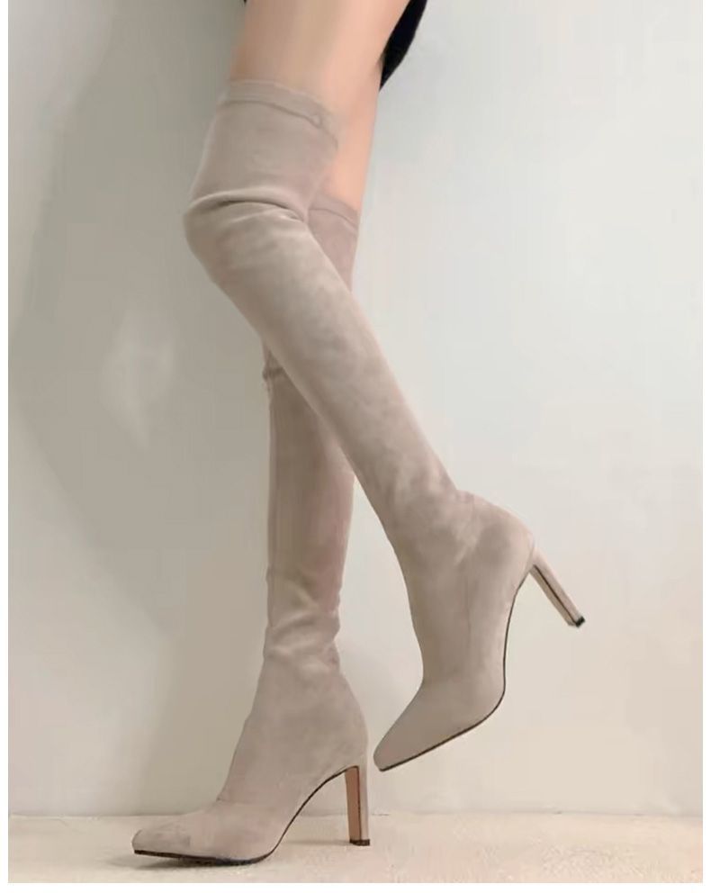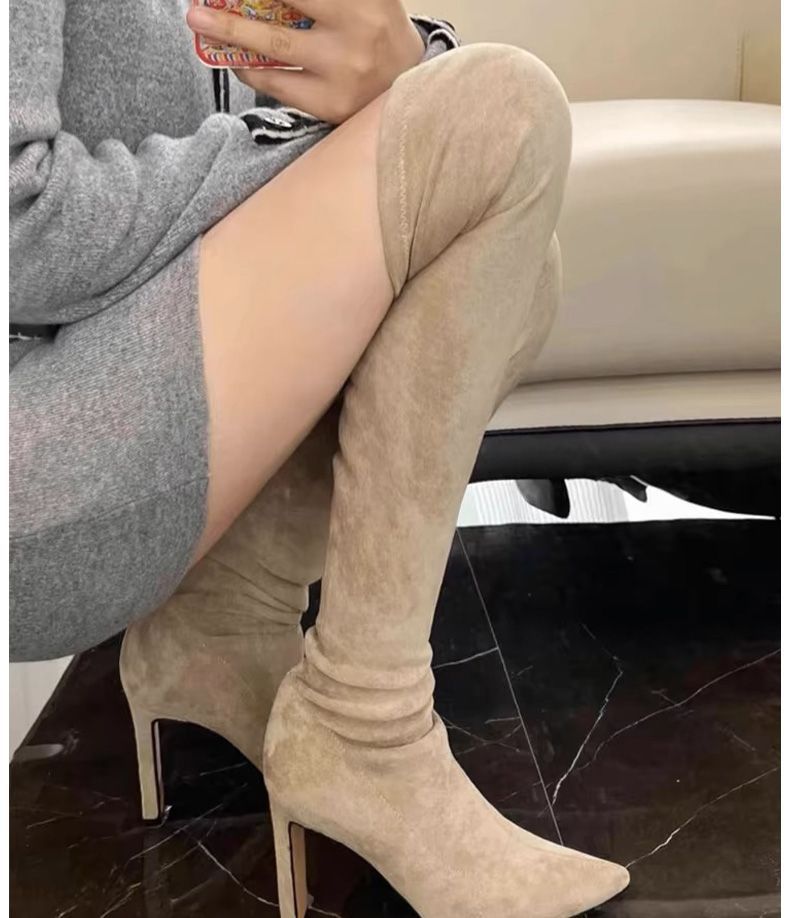 긴 무릎 긴 장화를 보여주는 슬리밍 여성용 2025 가을 및 겨울 양말 부츠 살구색 스웨이드 하이힐 스트레치 얇은 부츠