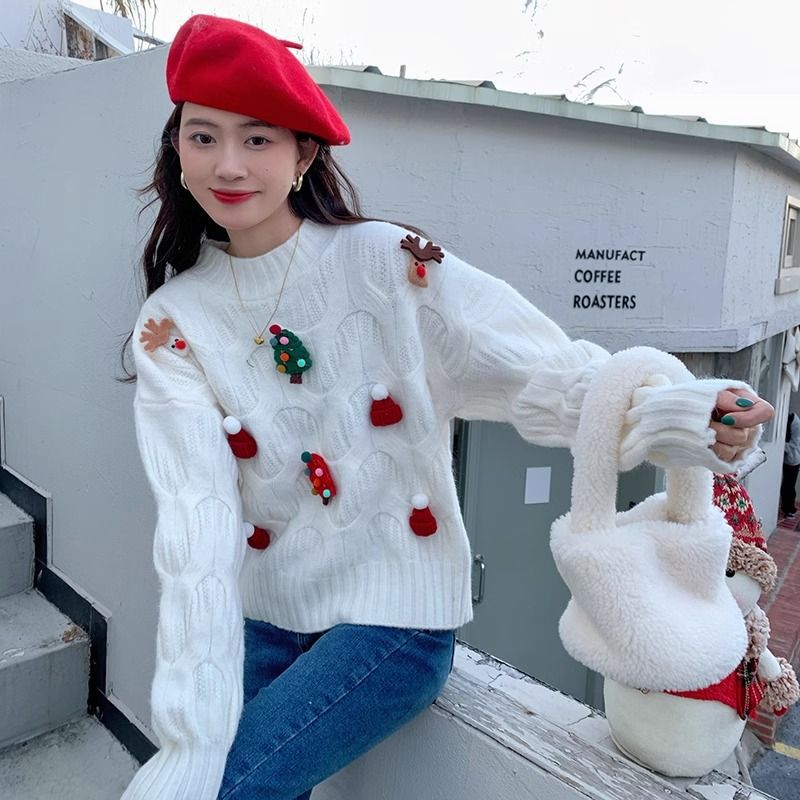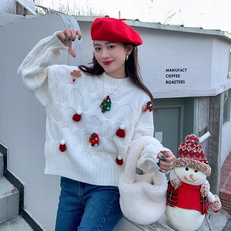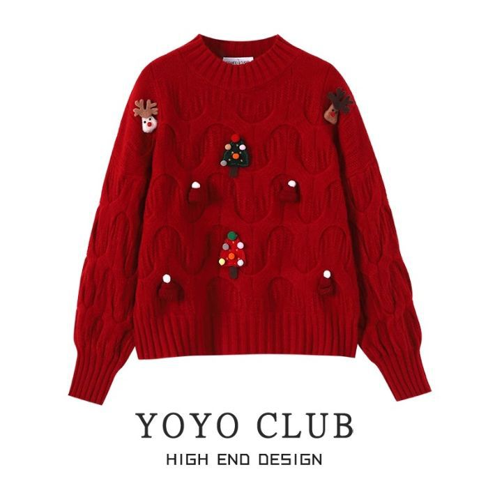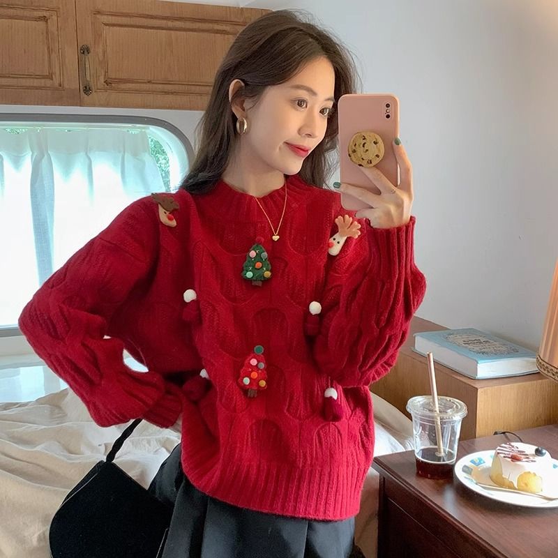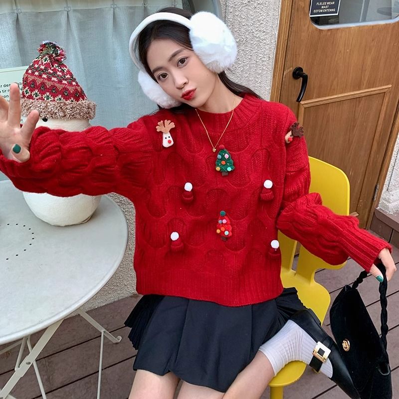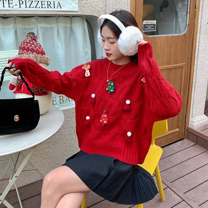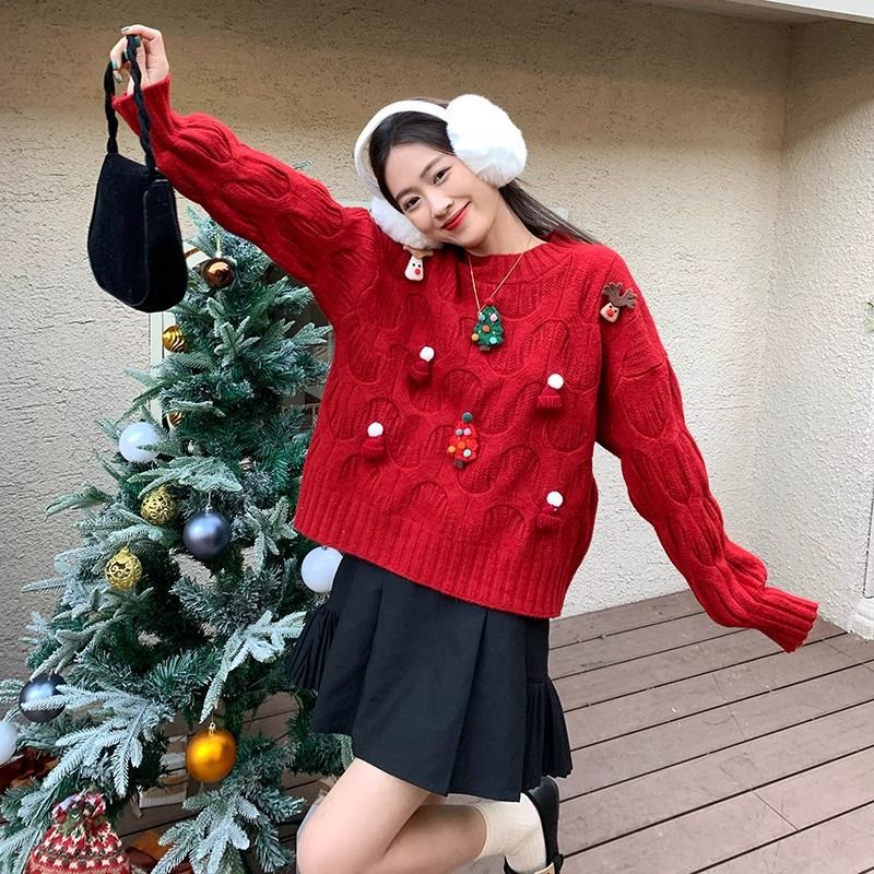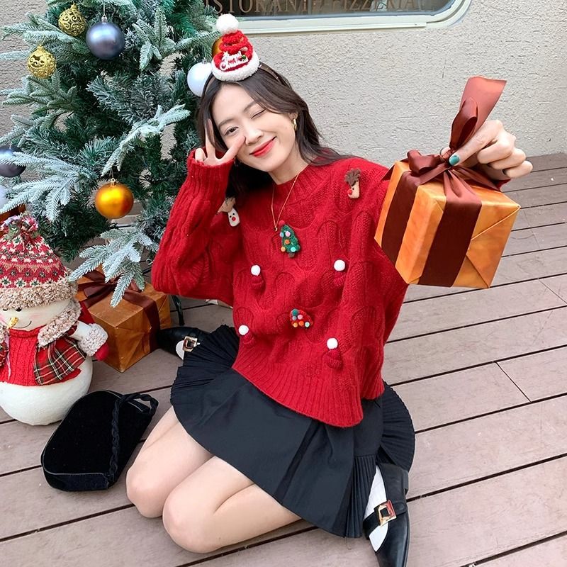 크리스마스 유럽 상품 작은 향기로운 스타일의 풀오버 레드 스웨터 여성의 가을과 겨울 짧은 두꺼운 크리스마스 코트 스웨터 도매스토어 가기
