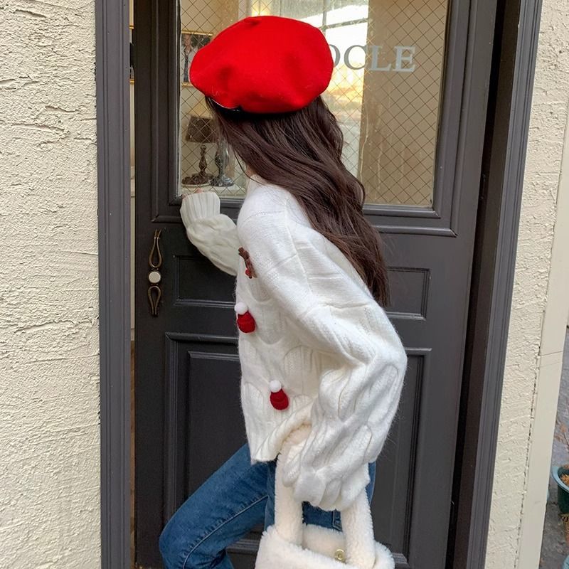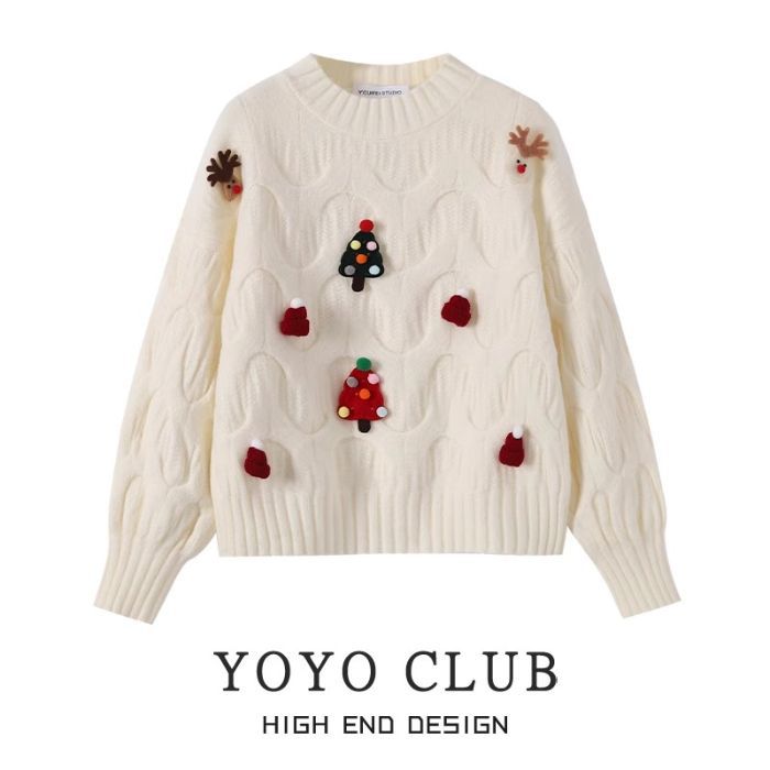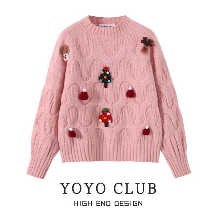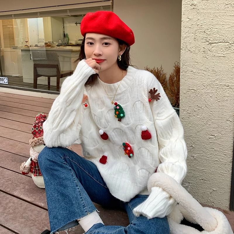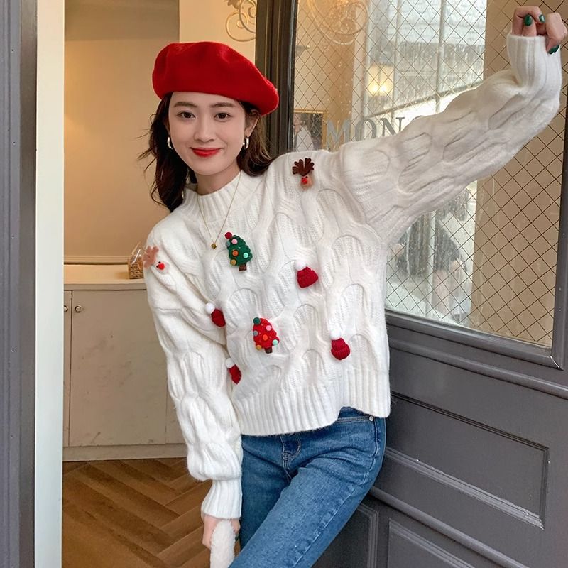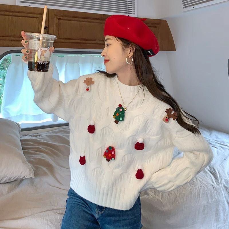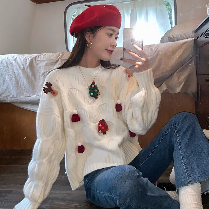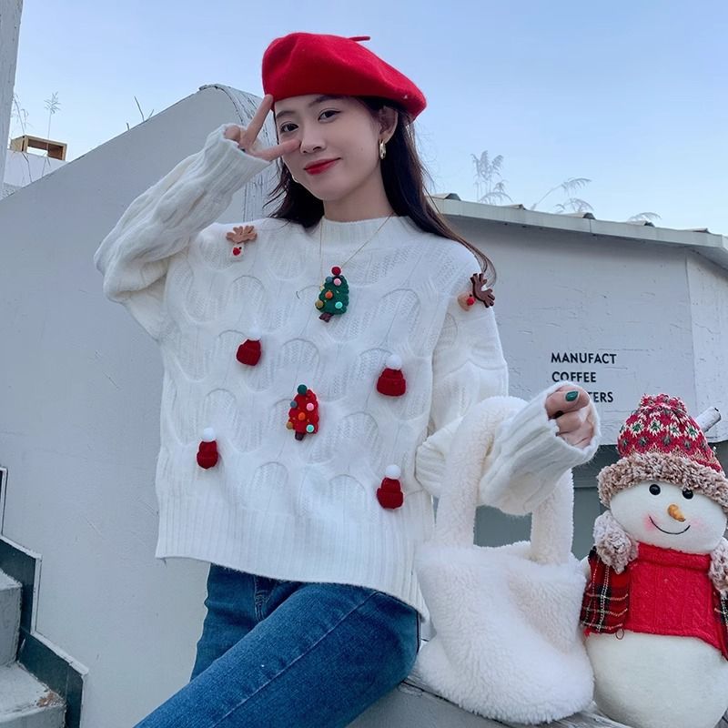 크리스마스 유럽 상품 작은 향기로운 스타일의 풀오버 레드 스웨터 여성의 가을과 겨울 짧은 두꺼운 크리스마스 코트 스웨터 도매스토어 가기