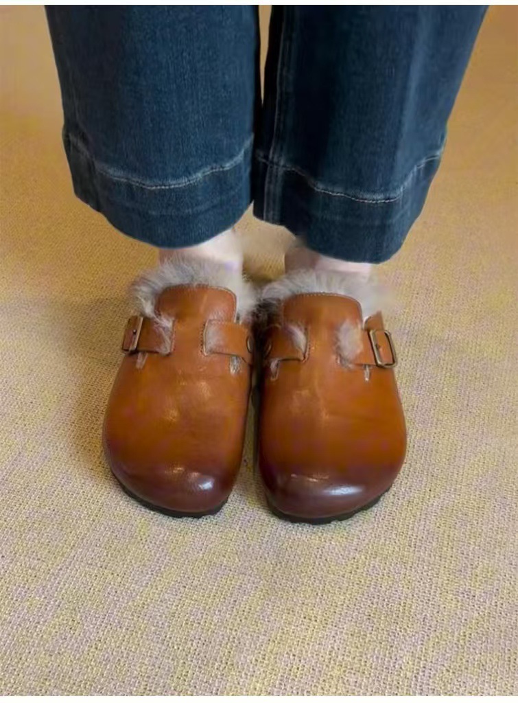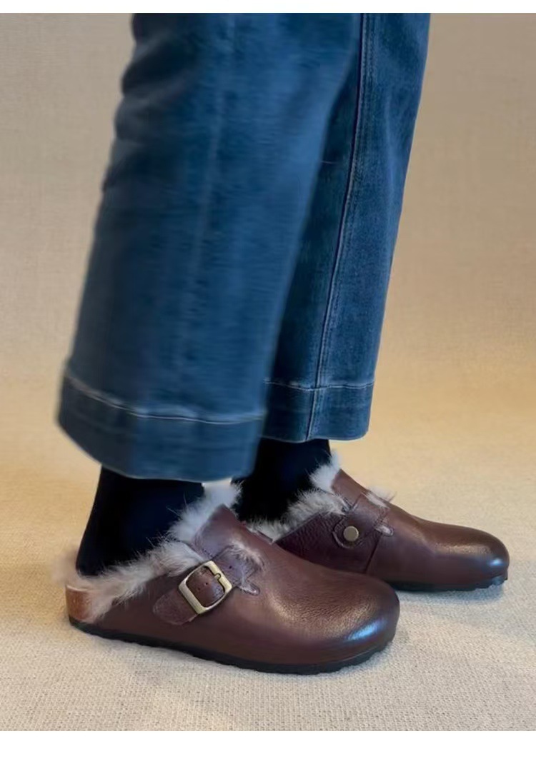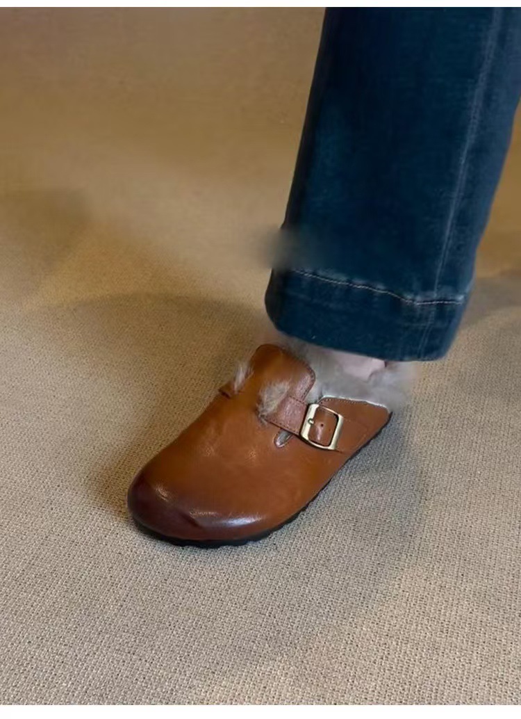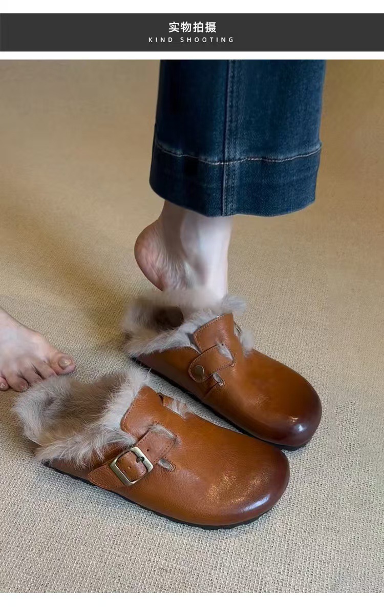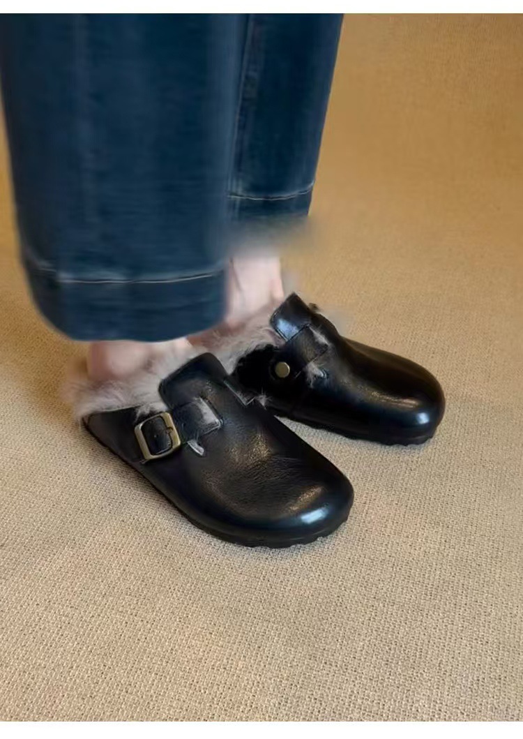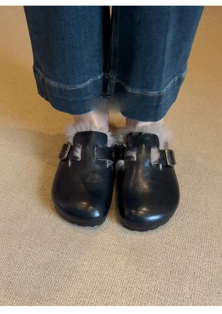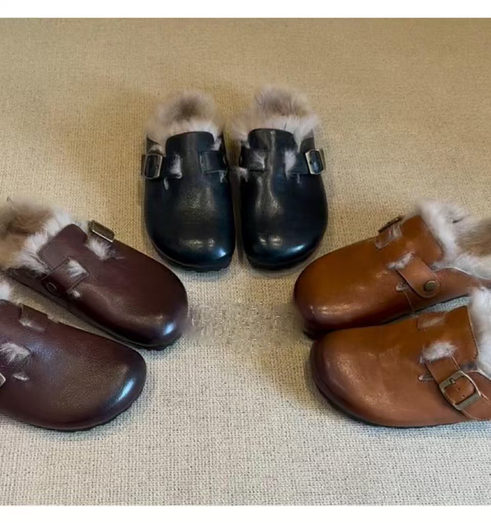 빈티지 기모 Birkenstock 신발 여성용 두꺼운 플랫 아웃웨어 슬립 온 푹신한 신발 겨울 여성 신발 따뜻한 Baotou 하프 슬리퍼
