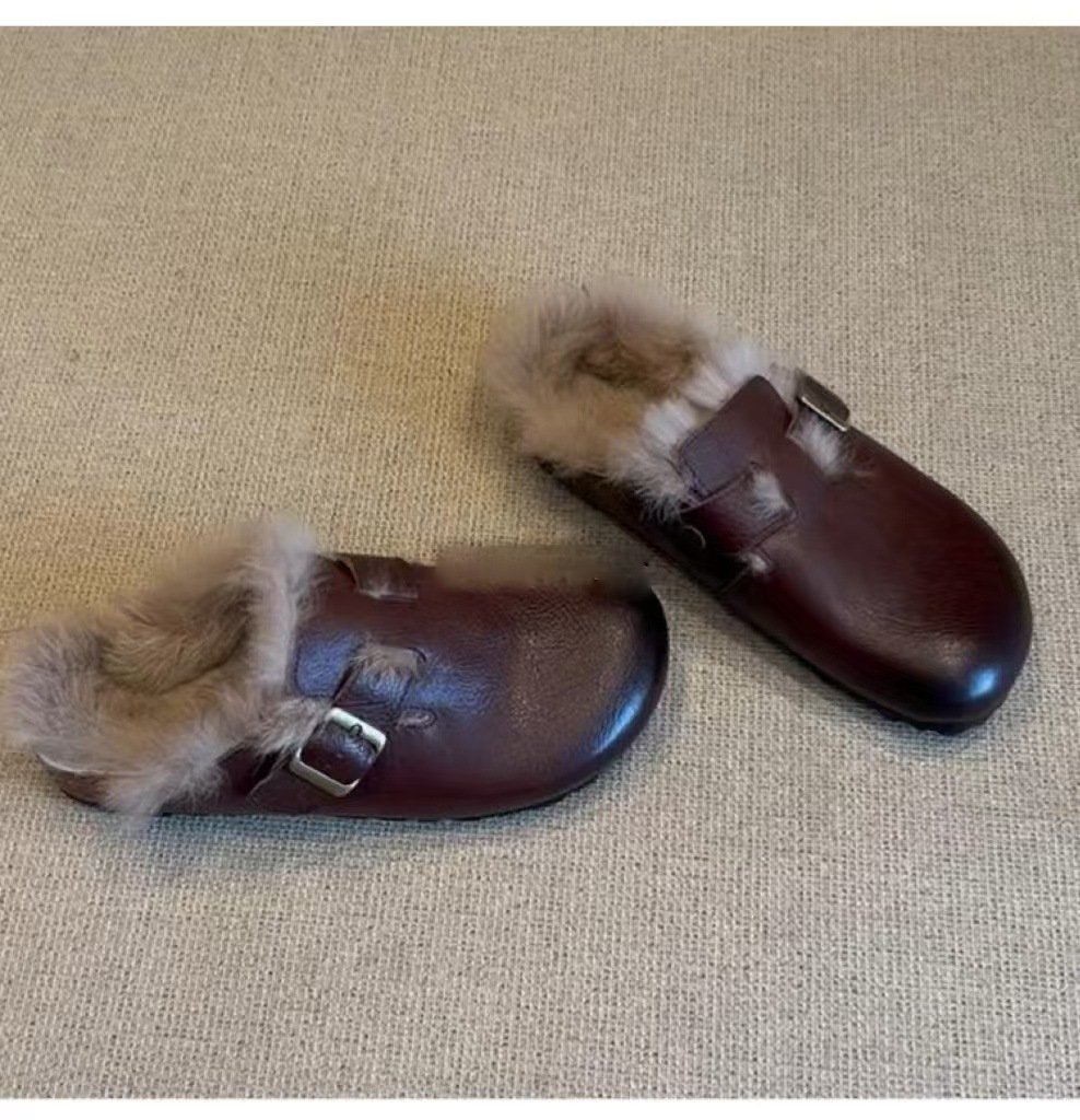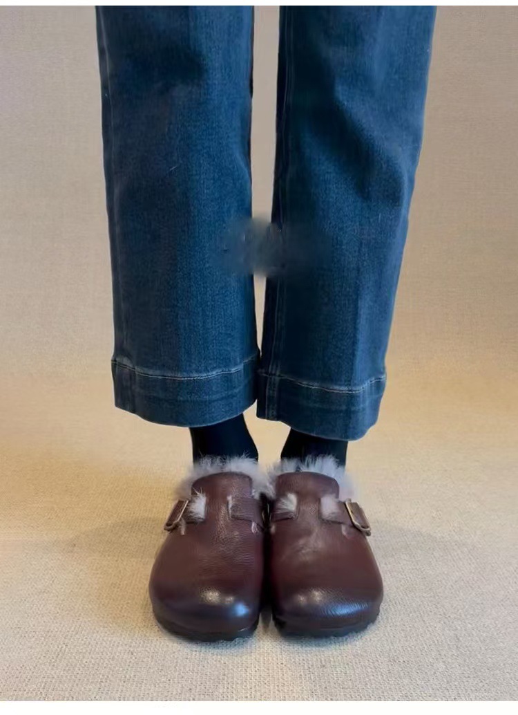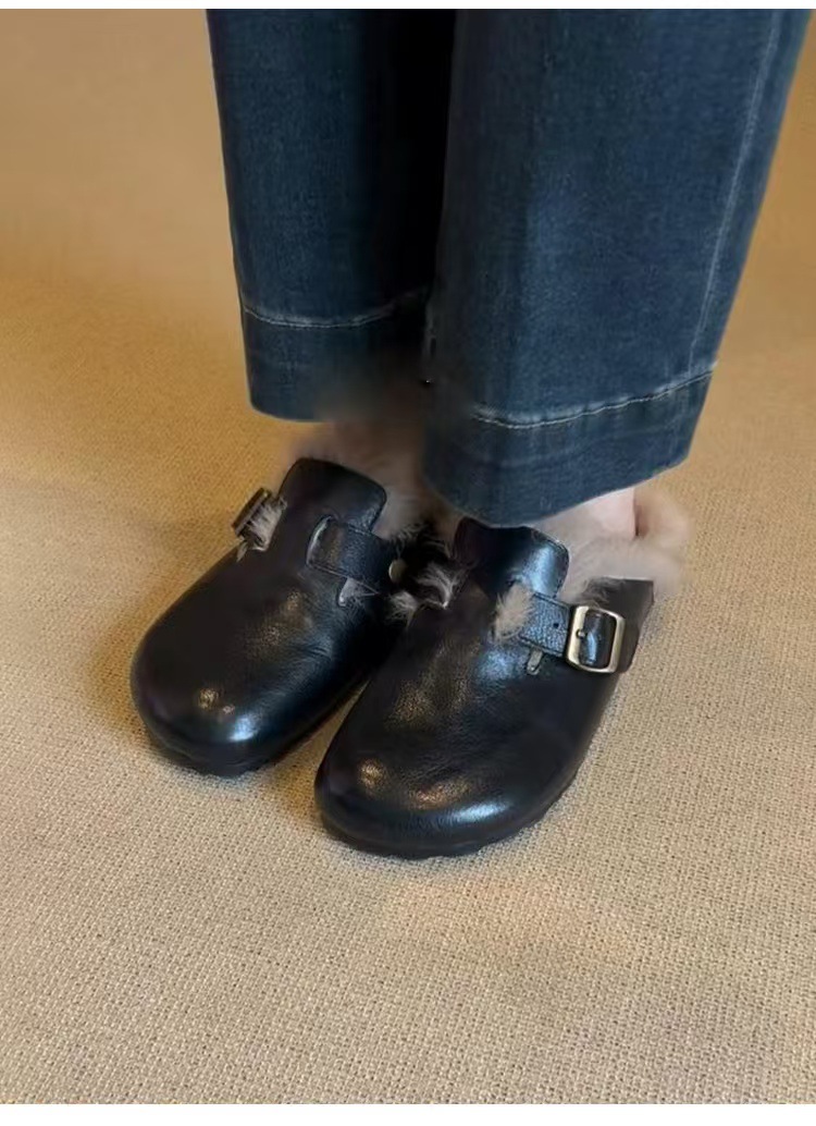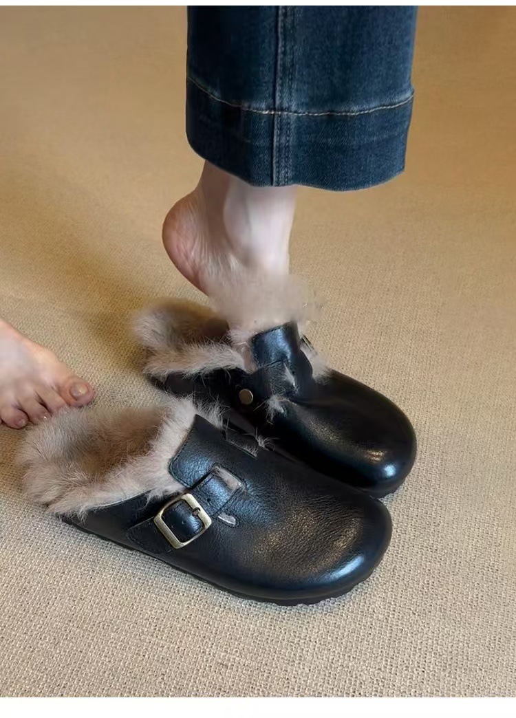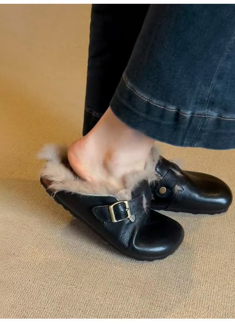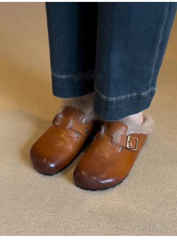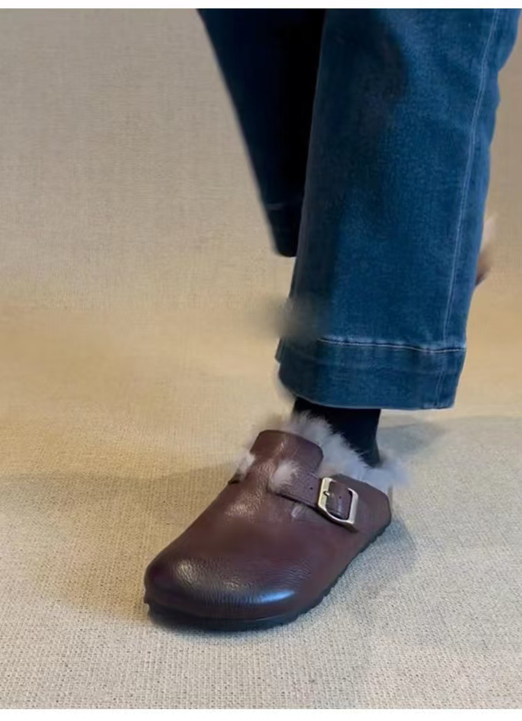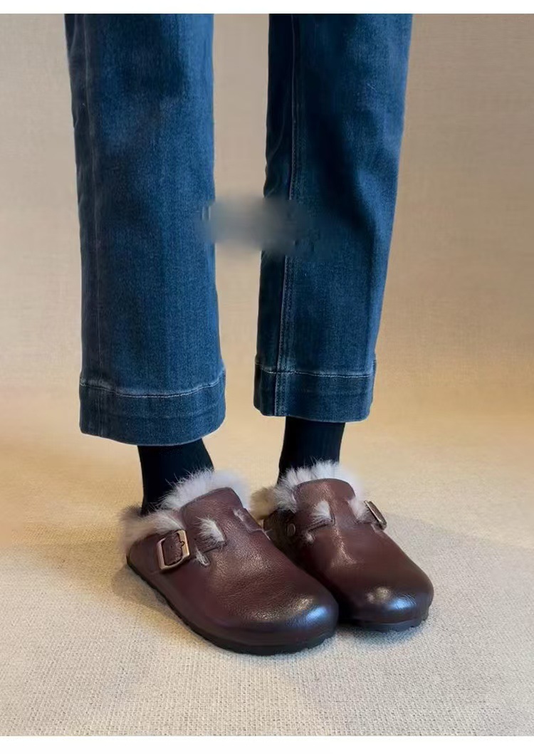 빈티지 기모 Birkenstock 신발 여성용 두꺼운 플랫 아웃웨어 슬립 온 푹신한 신발 겨울 여성 신발 따뜻한 Baotou 하프 슬리퍼
