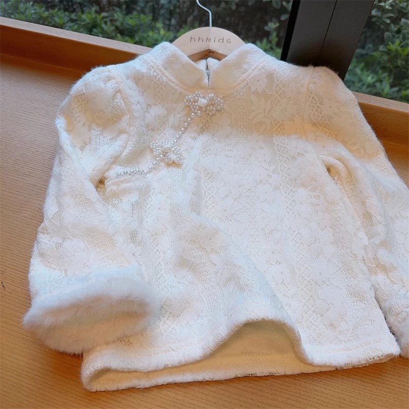 2024 서양식 소녀의 골동품 긴 소매 따뜻한 탑 겨울 새로운 중국 스타일 버클 기모 레이스베이스 셔츠