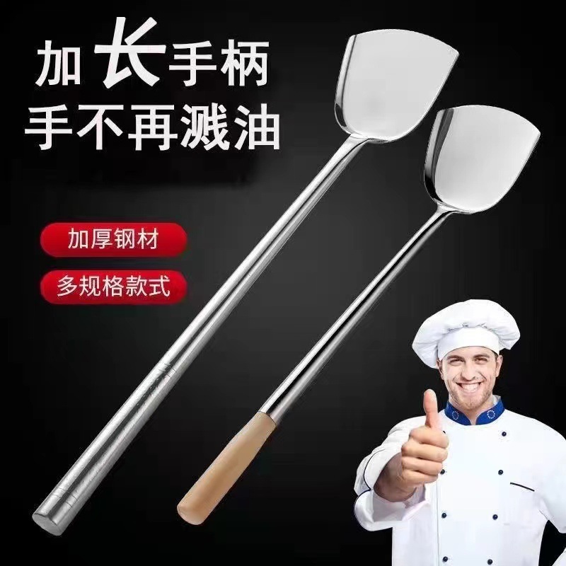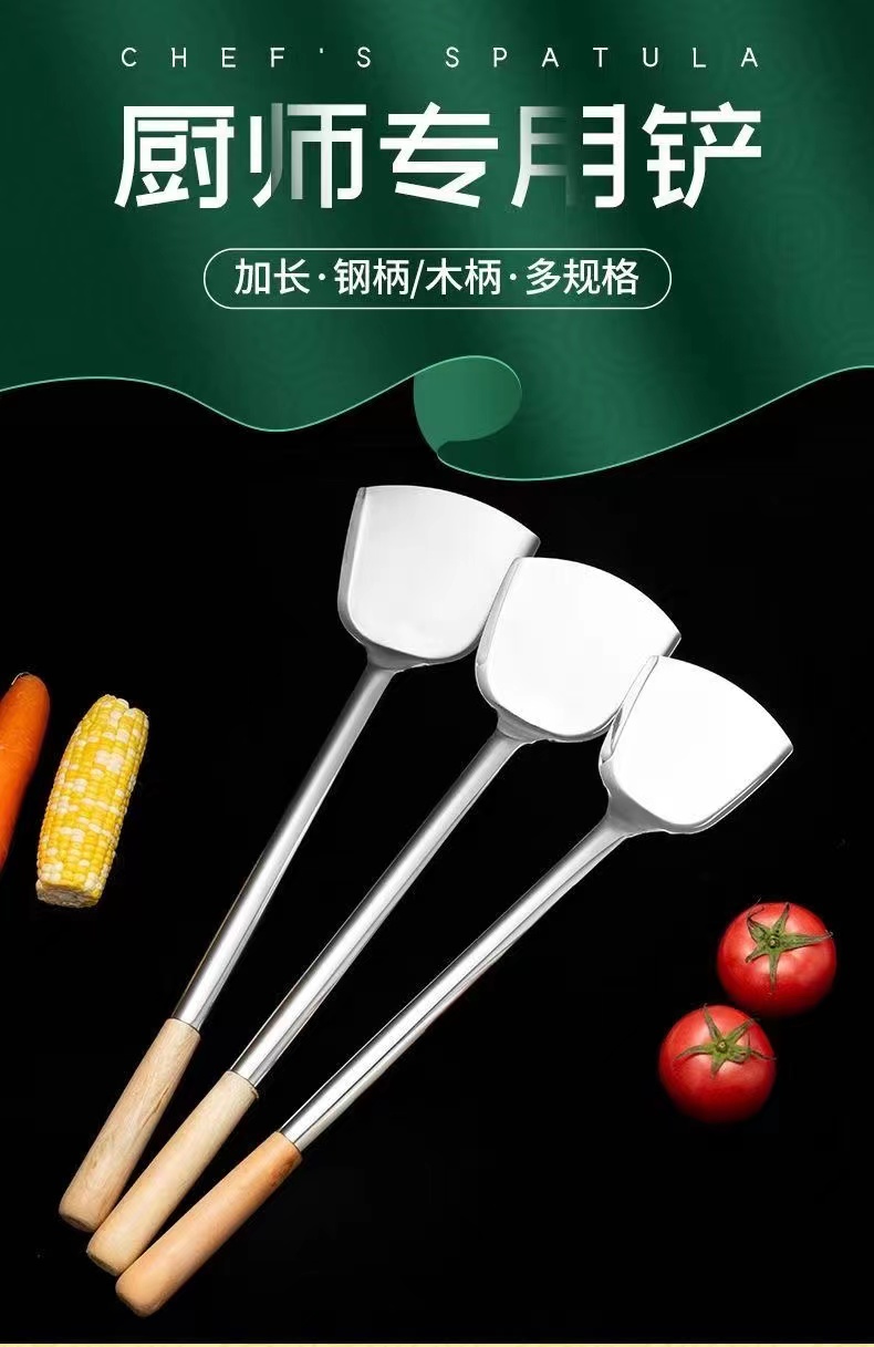 요리사 주걱 스테인리스 스틸 호텔 주방 접시 주걱 나무 강철 손잡이 긴 손잡이 프라이팬 큰 주걱 튀김 접시 철 중간 높이스토어 가기