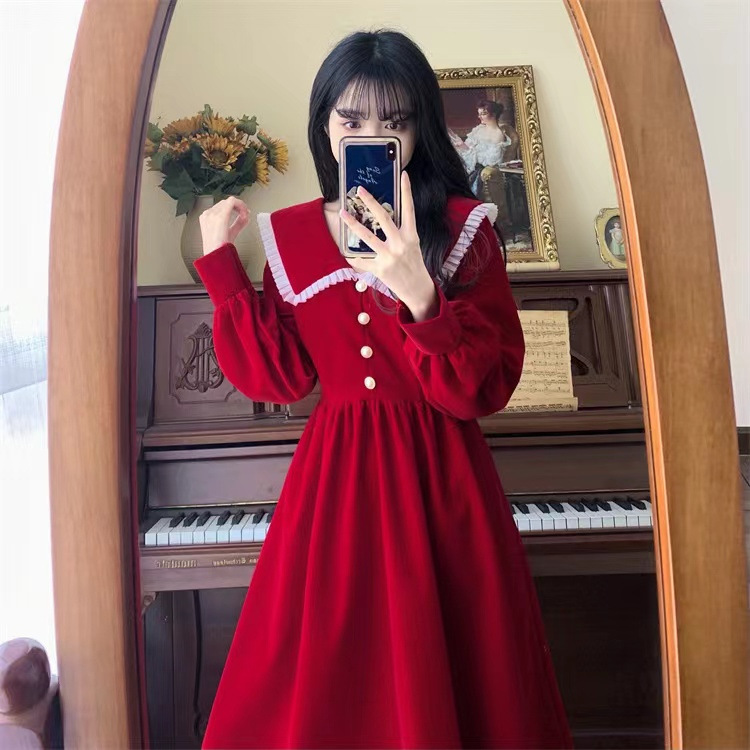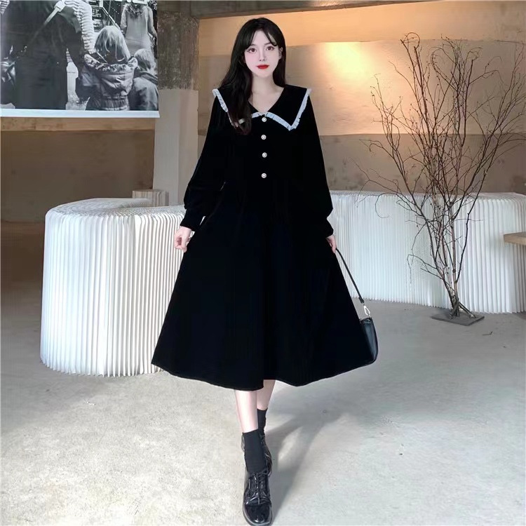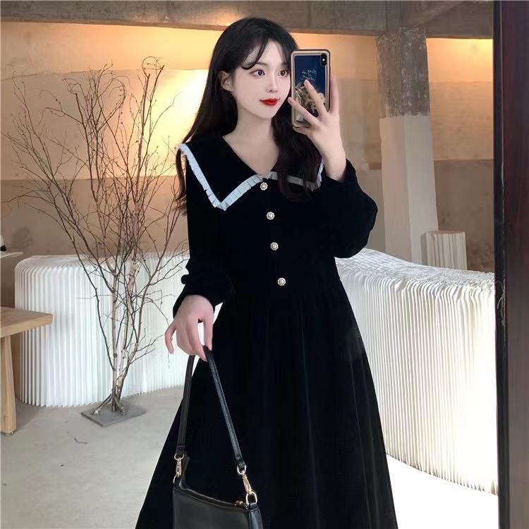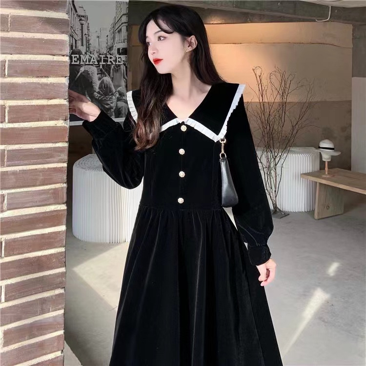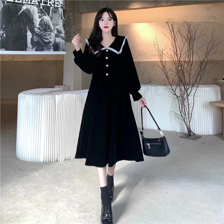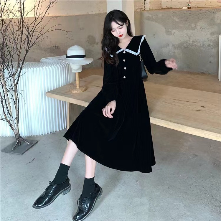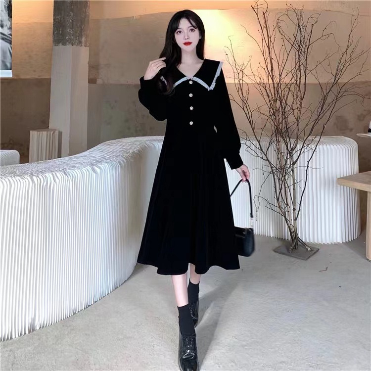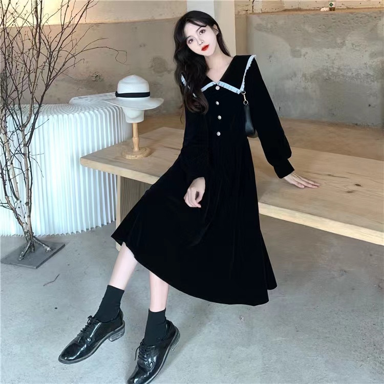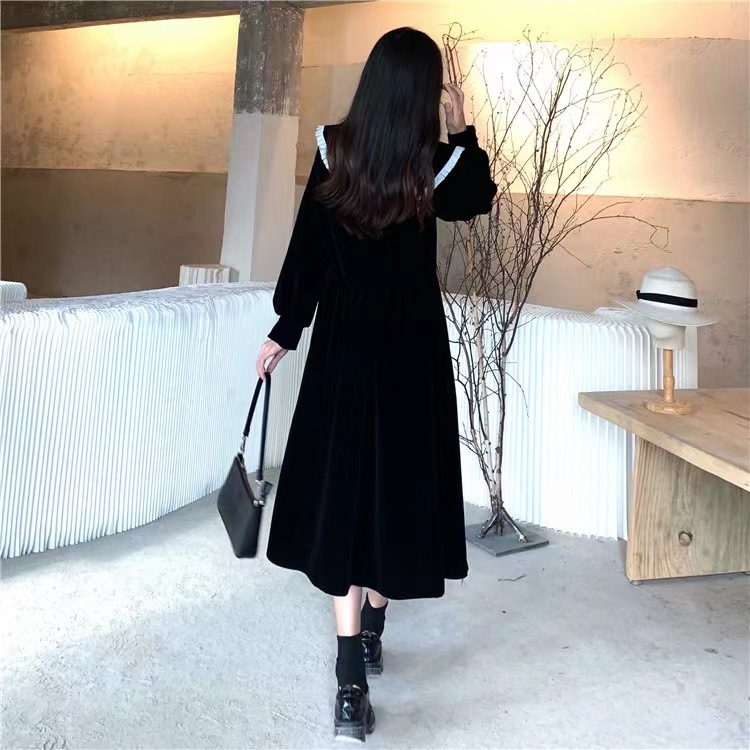 가을과 겨울 새로운 프랑스 헵번 스타일 레트로 작은 검은 원피스 기본 골드 벨벳 원피스 작은 남성을위한 여성의 긴 원피스스토어 가기