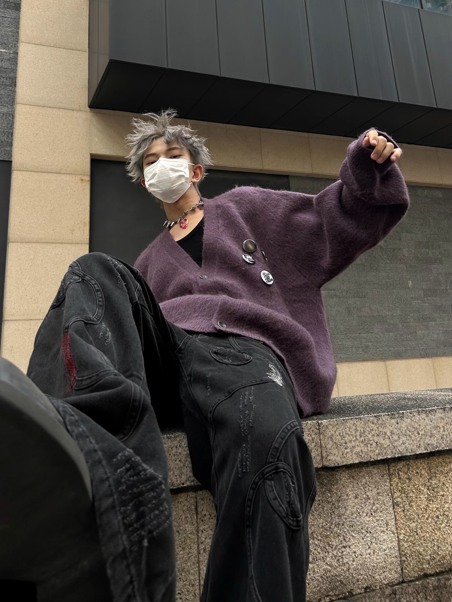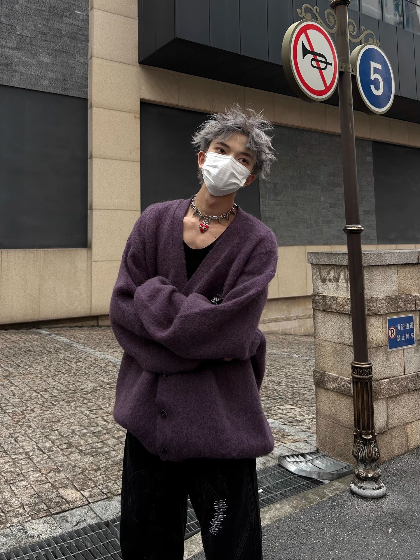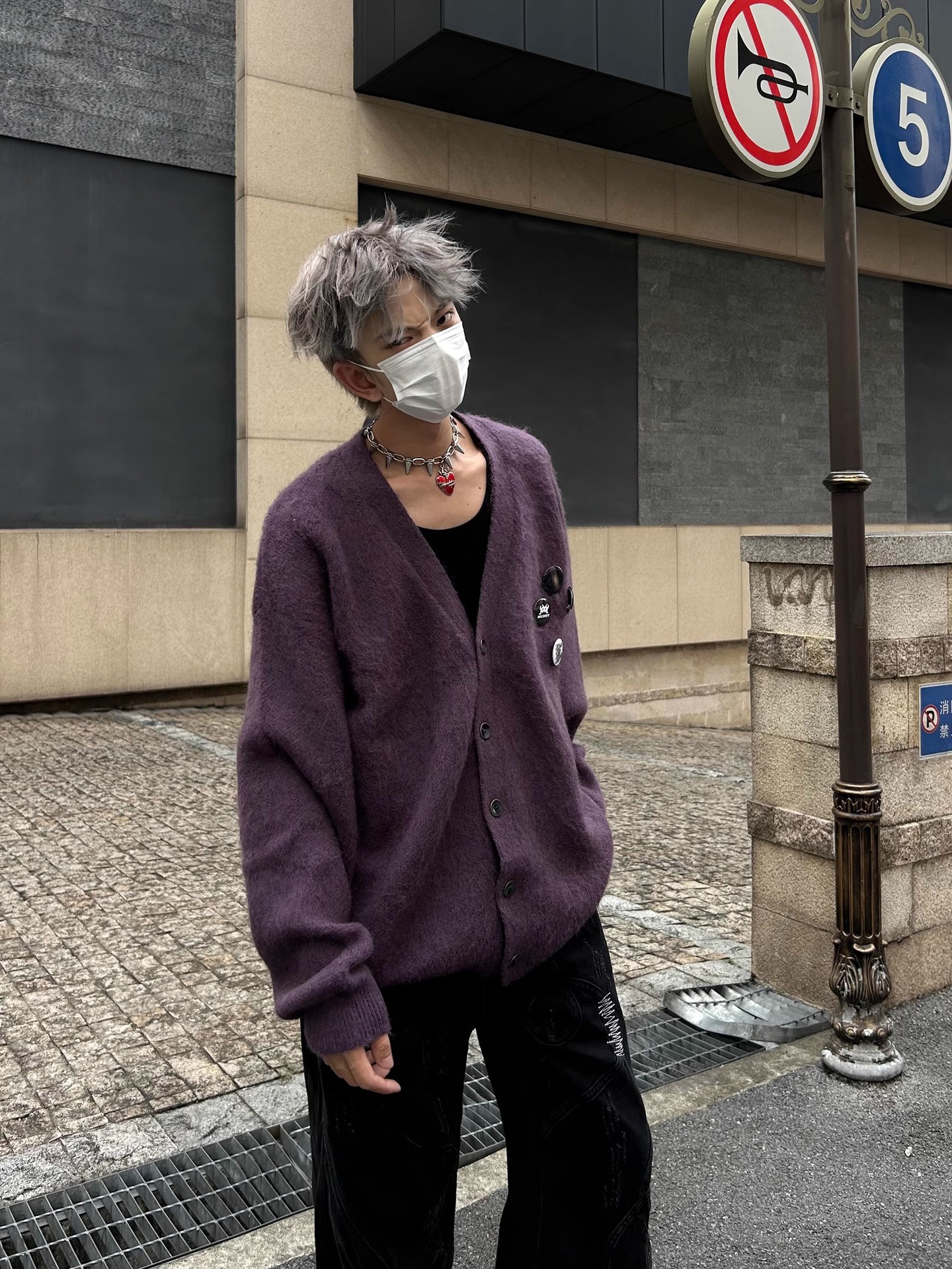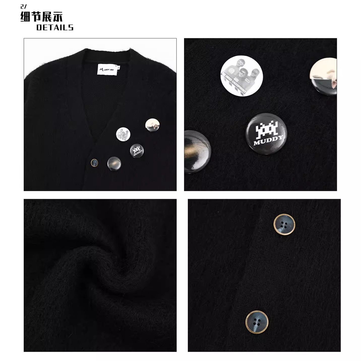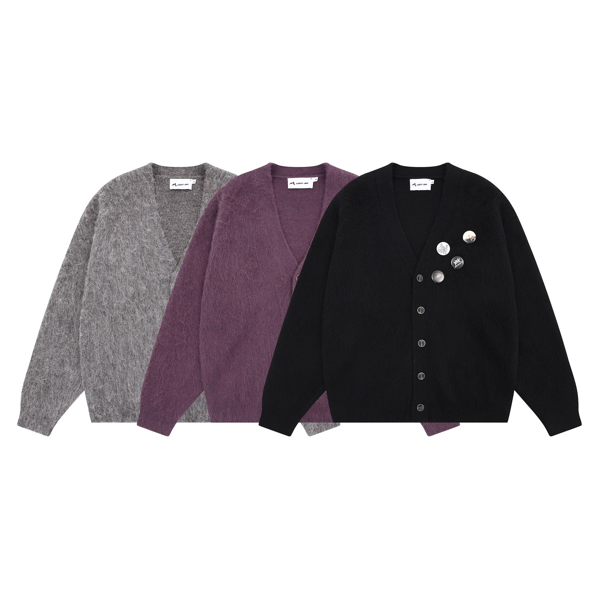 새로운 루즈핏 퍼플 다용도 브이넥 니트 가디건, 새로운 브로치 장식 루즈하고 여유로운 스타일의 스웨터 재킷, 가을 겨울용스토어 가기