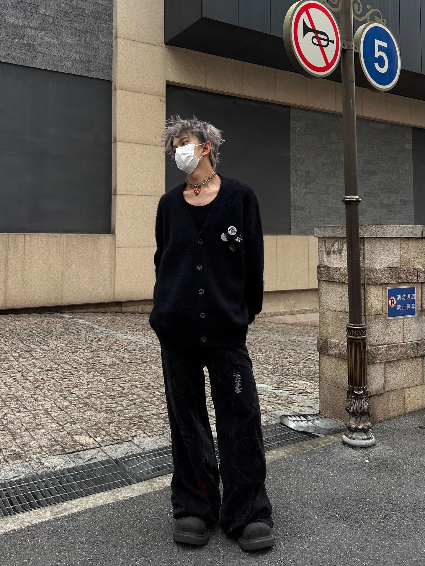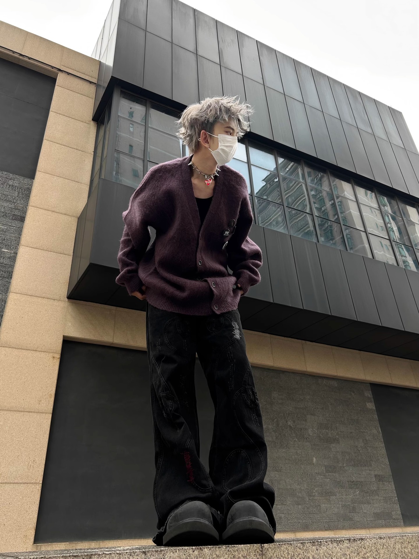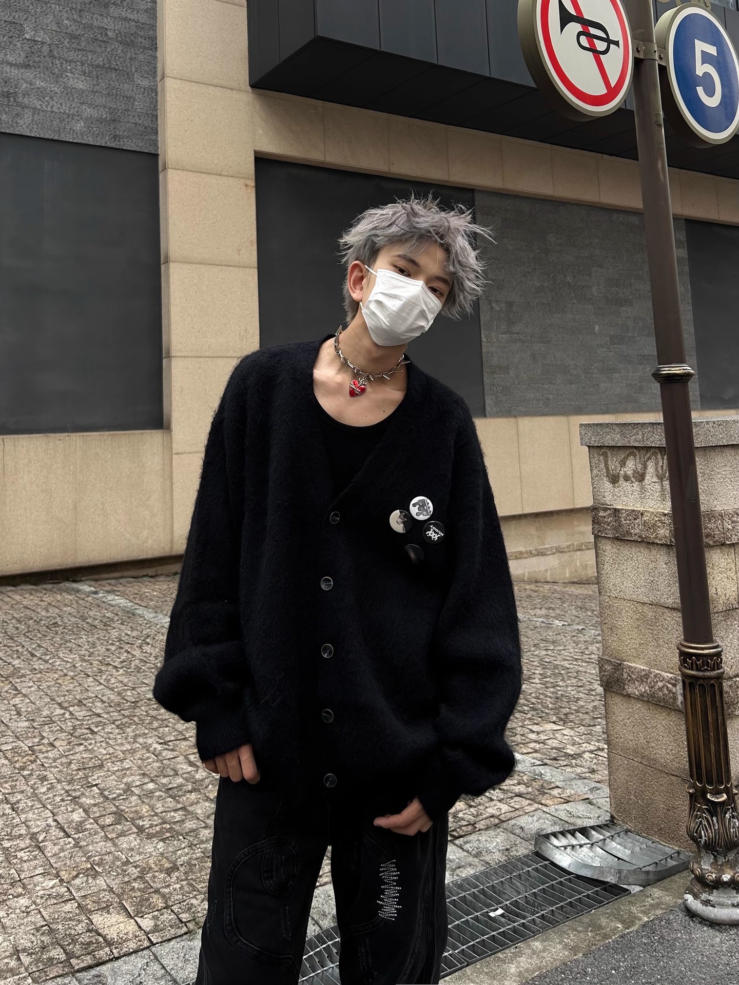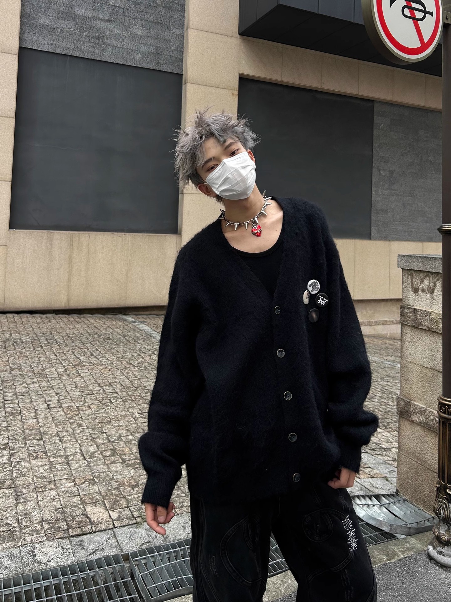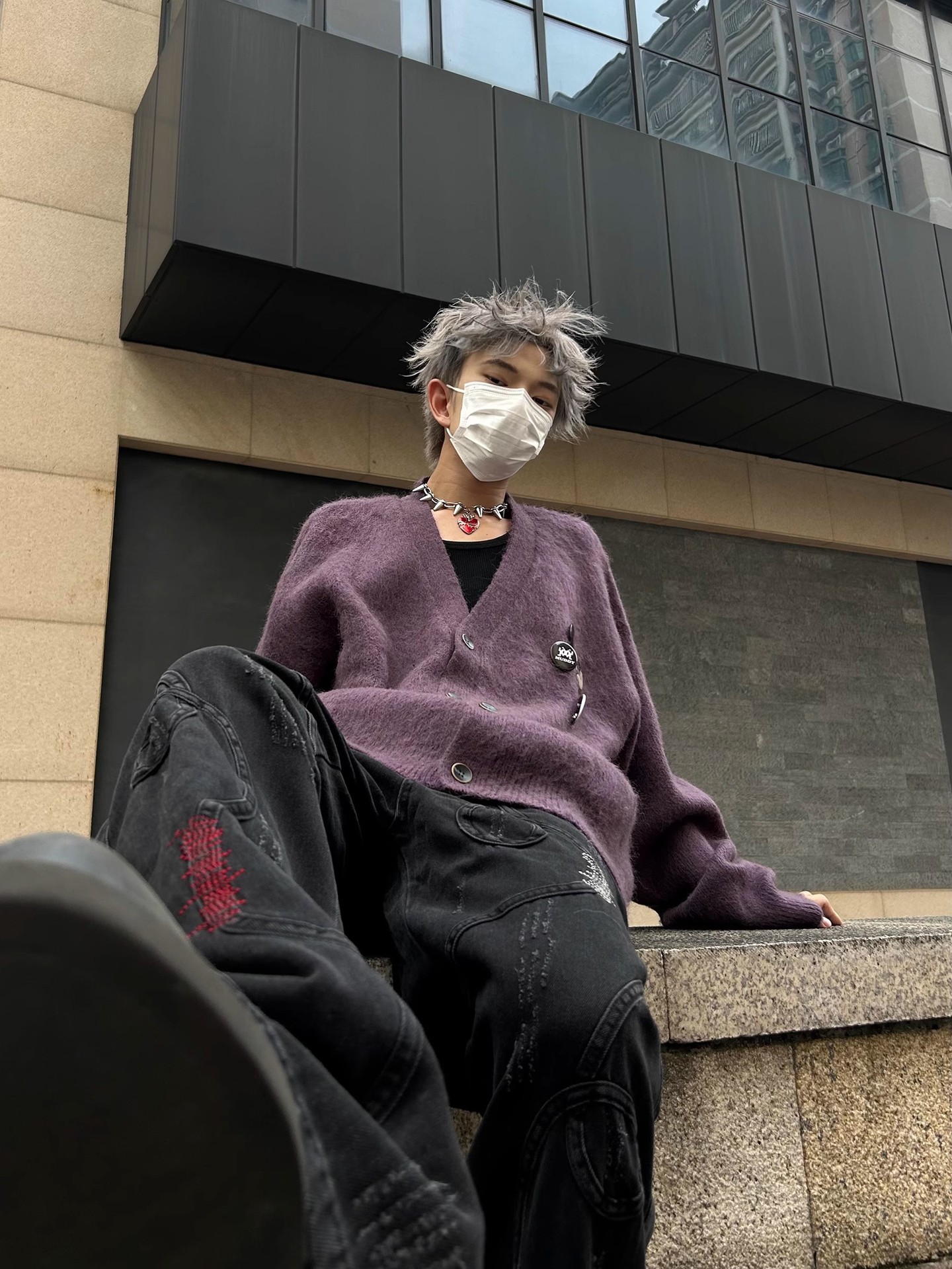 새로운 루즈핏 퍼플 다용도 브이넥 니트 가디건, 새로운 브로치 장식 루즈하고 여유로운 스타일의 스웨터 재킷, 가을 겨울용스토어 가기