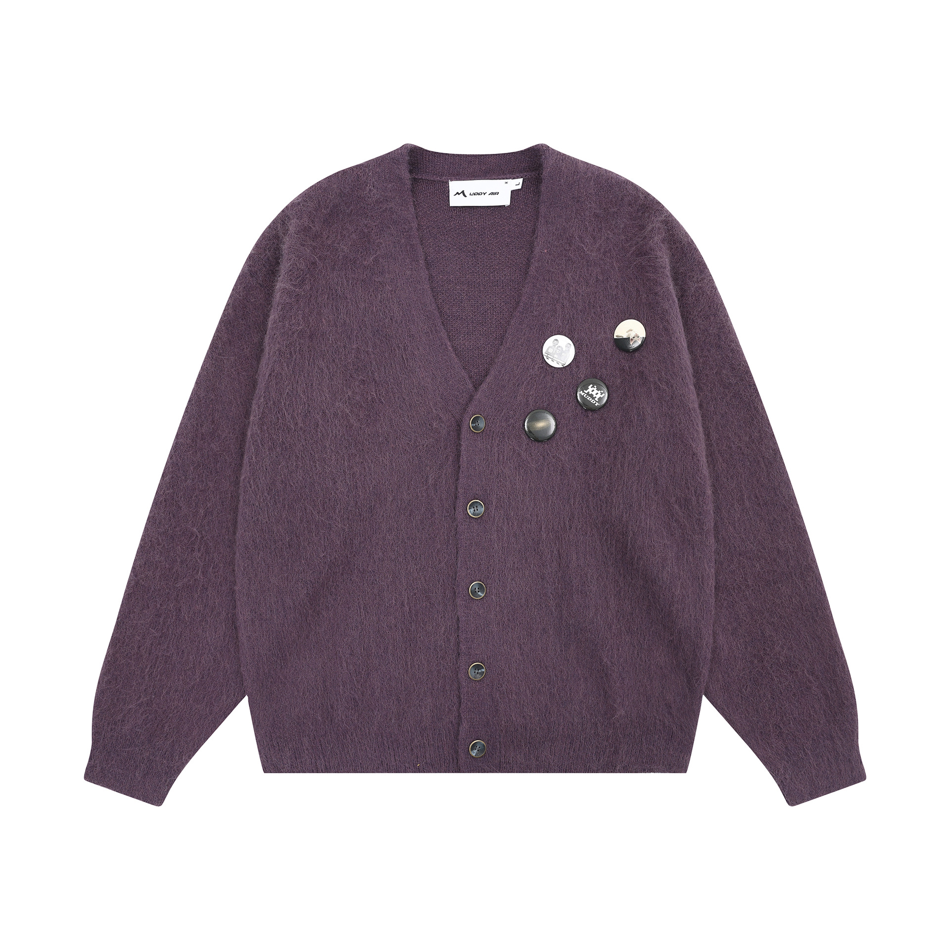 새로운 루즈핏 퍼플 다용도 브이넥 니트 가디건, 새로운 브로치 장식 루즈하고 여유로운 스타일의 스웨터 재킷, 가을 겨울용