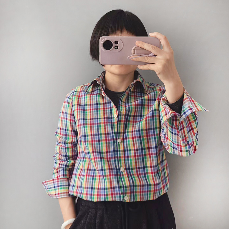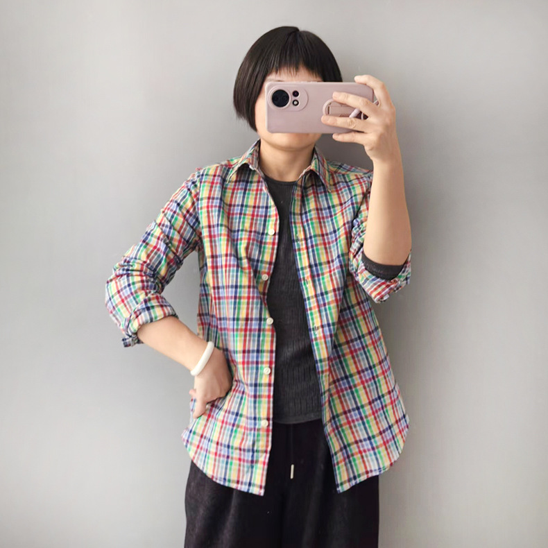 컬러풀한 면 체크 셔츠, 일본식 레트로 스타일, 라펠 칼라, 긴팔, 캐주얼 루즈핏, 스트라이프 체크 셔츠, 캐주얼하고 다용도로 활용 가능
