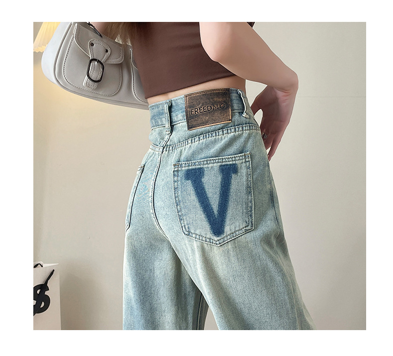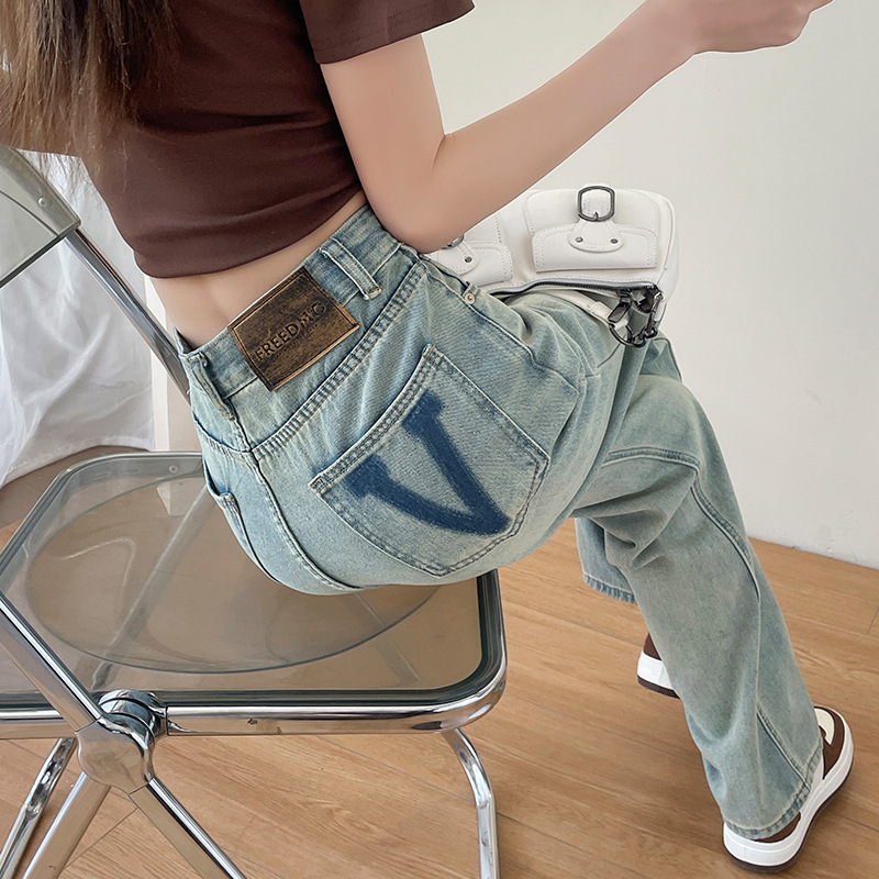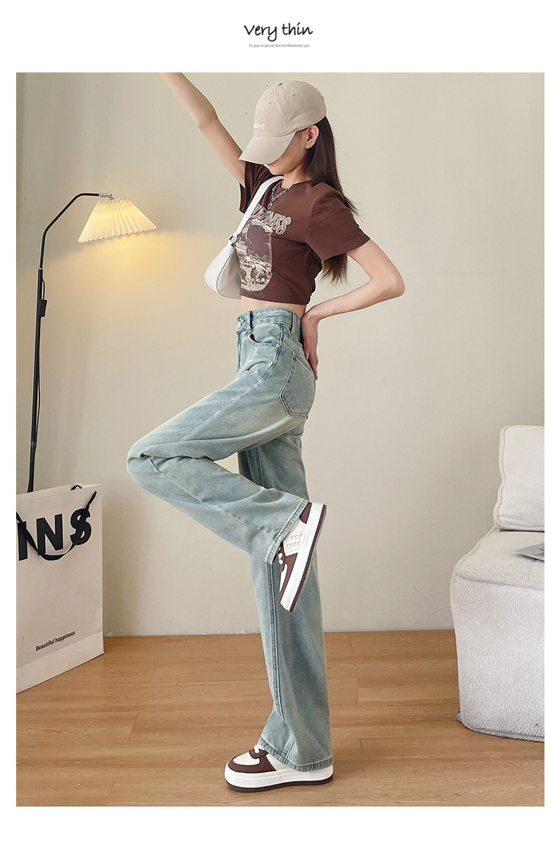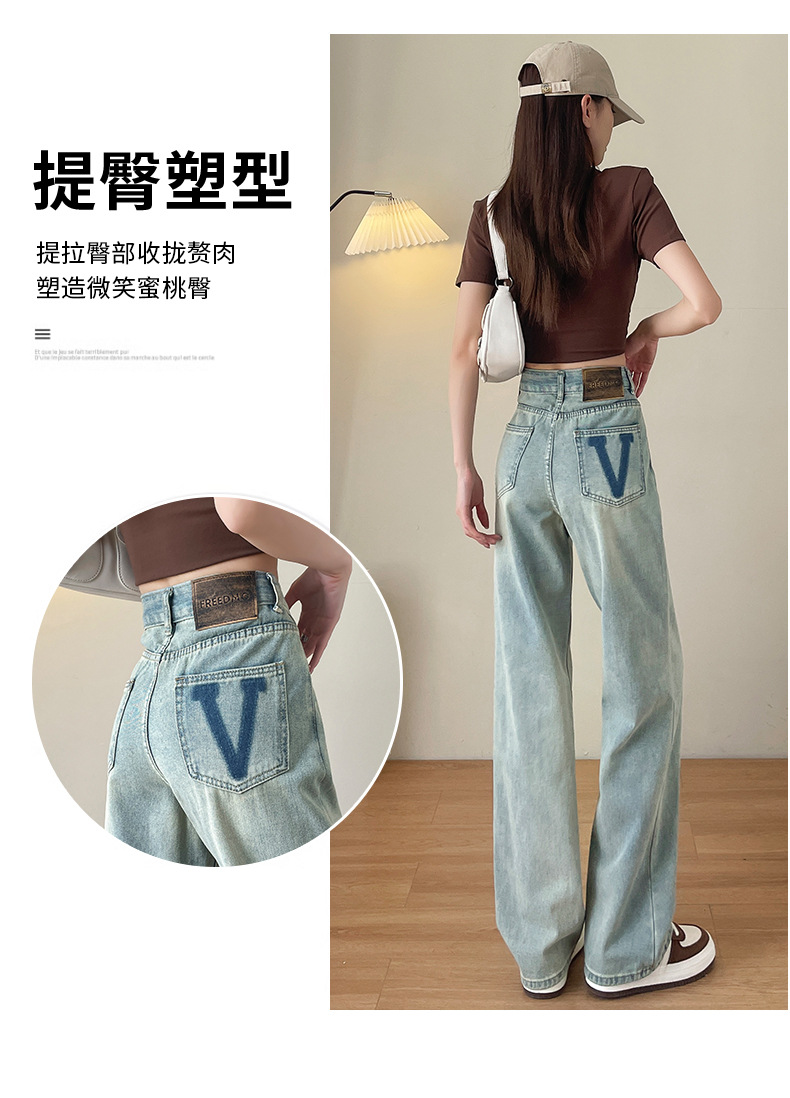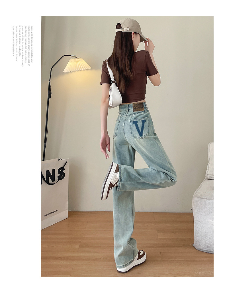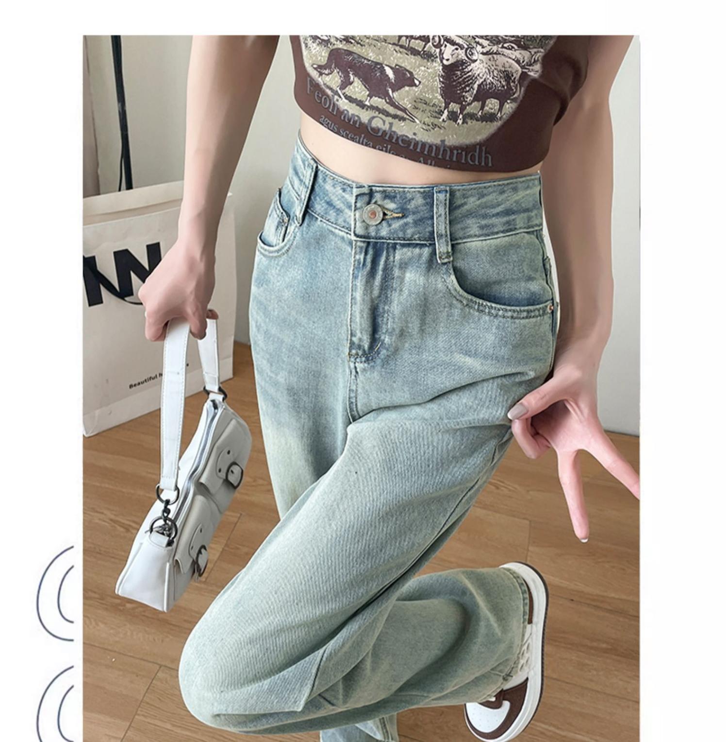 높은 허리 좁은 직선 청바지 여성의 가을과 겨울 2024 유행 새로운 밝은 색상 디자인 센스 작은 넓은 다리 바지스토어 가기
