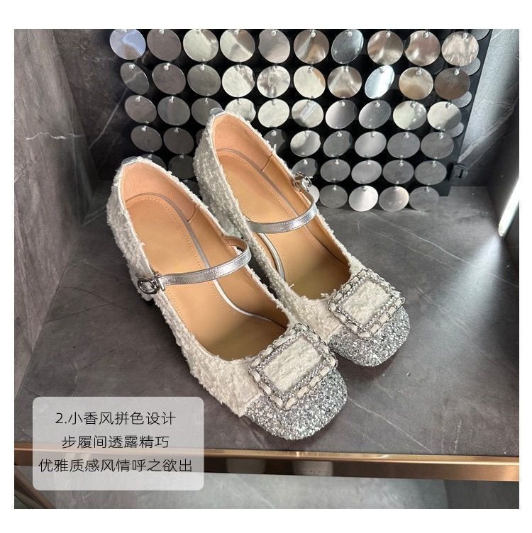 여성용 프렌치 얕은 입 하이힐 슈즈 청키 힐 슈즈 샤넬 스타일 라인스톤 스퀘어 헤드 새로운 봄과 가을 2024스토어 가기