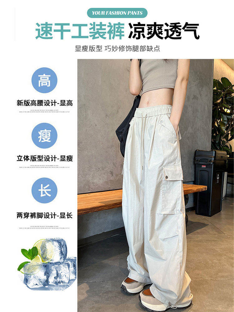 블랙 아메리칸 스타일 낙하산 공예 바지 여성 여름 2024 새로운 높은 허리 넓은 다리 봄과 가을 등산 바지 빠른 건조 스포츠 바지