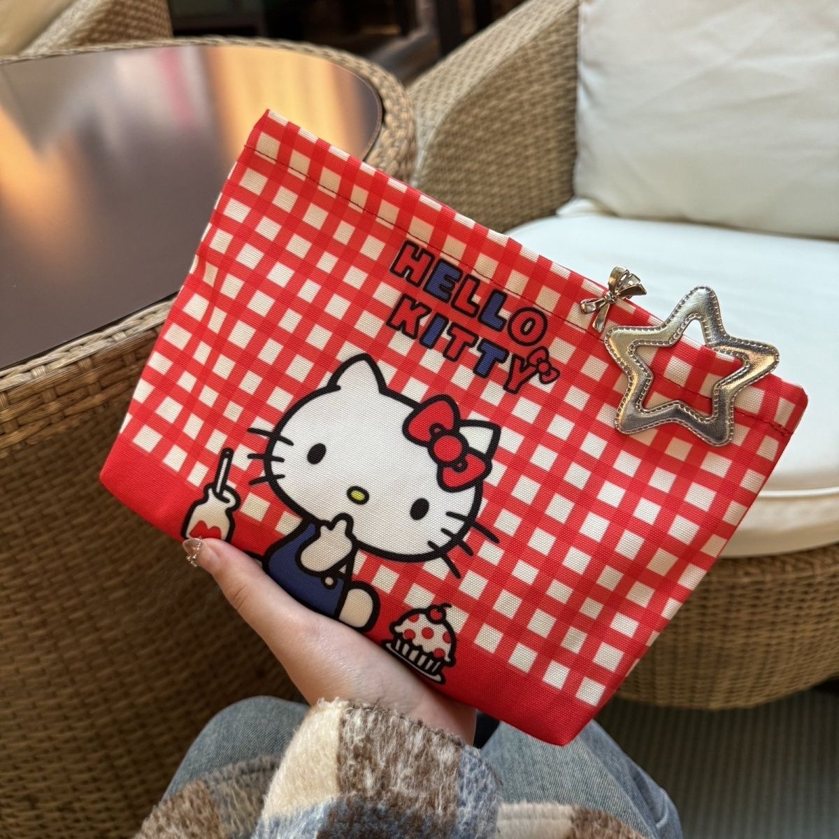 새로운 빨간 격자 무늬 키티 휴대용 화장품 가방 보관 손 만화 귀여운 대용량 3 차원 작은 가방스토어 가기
