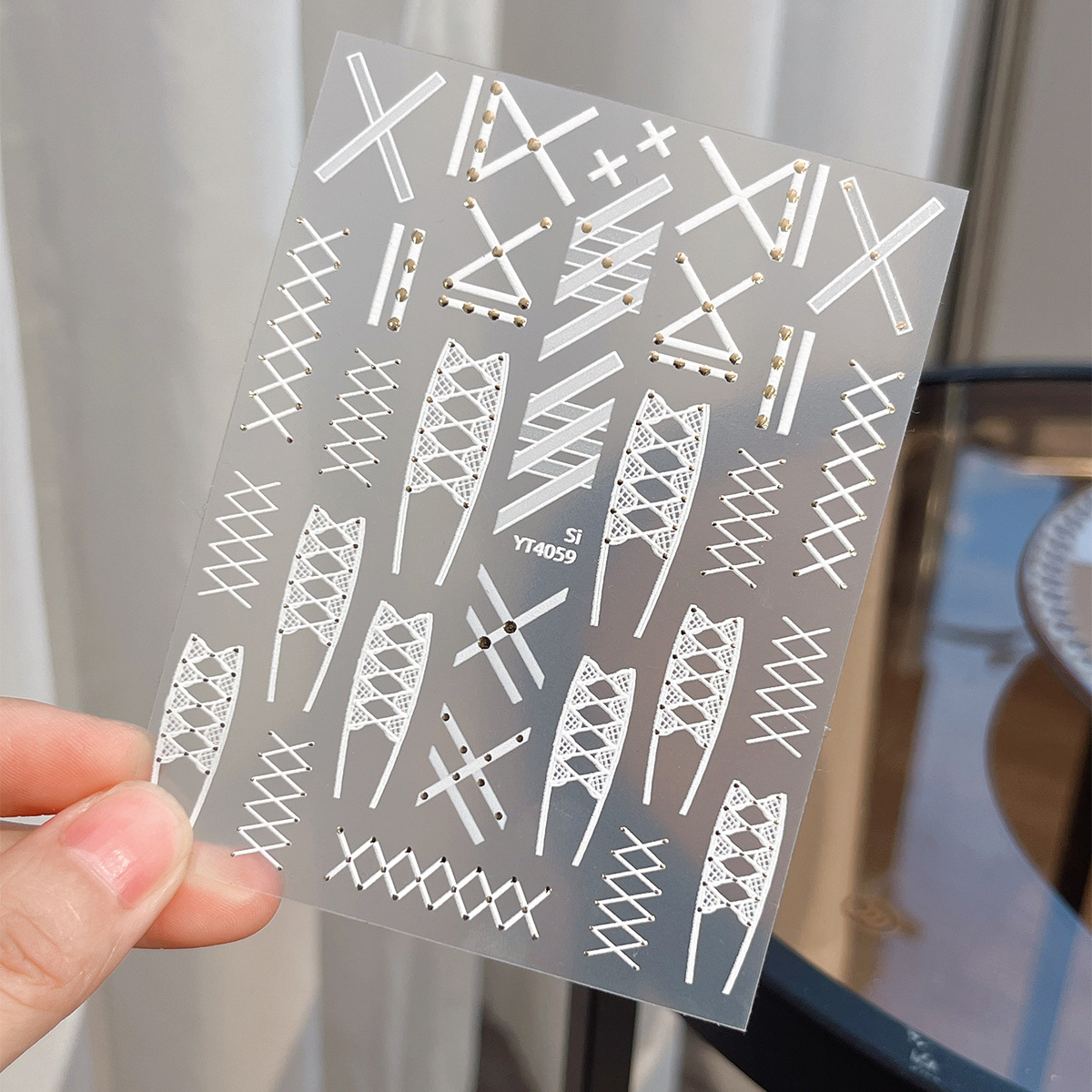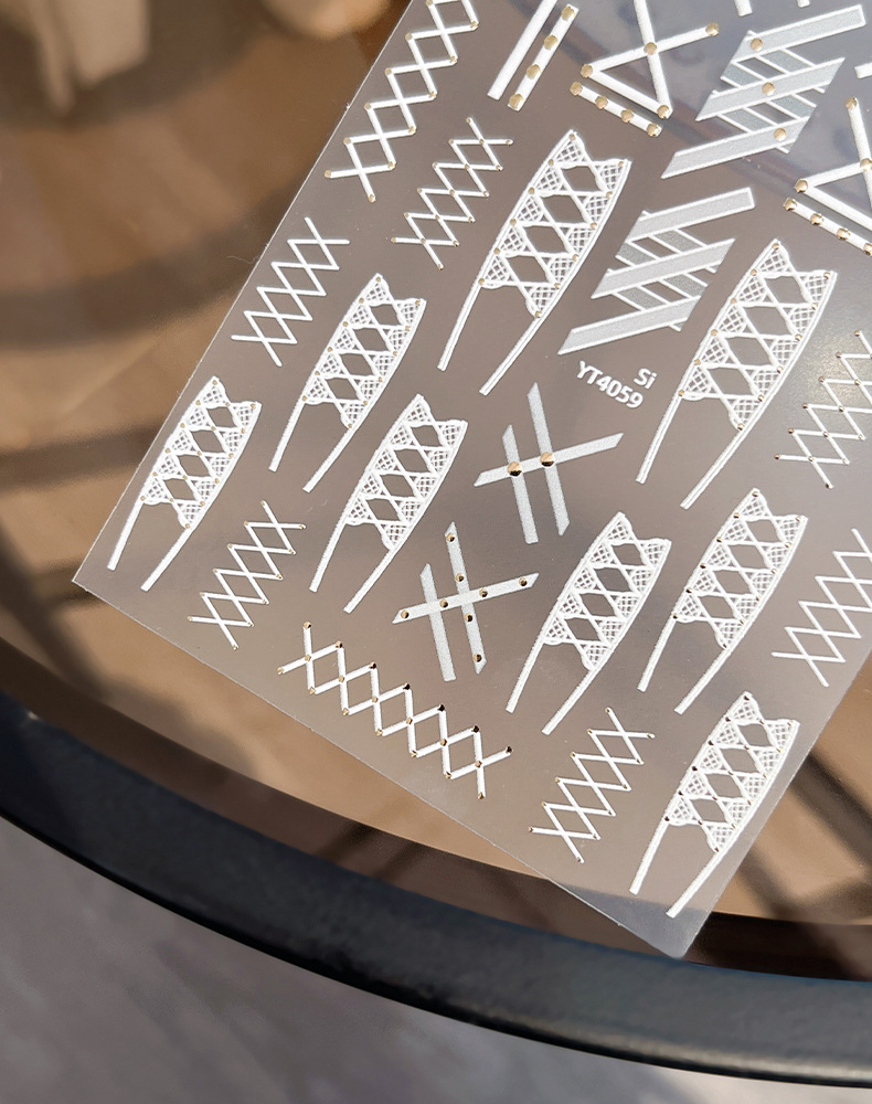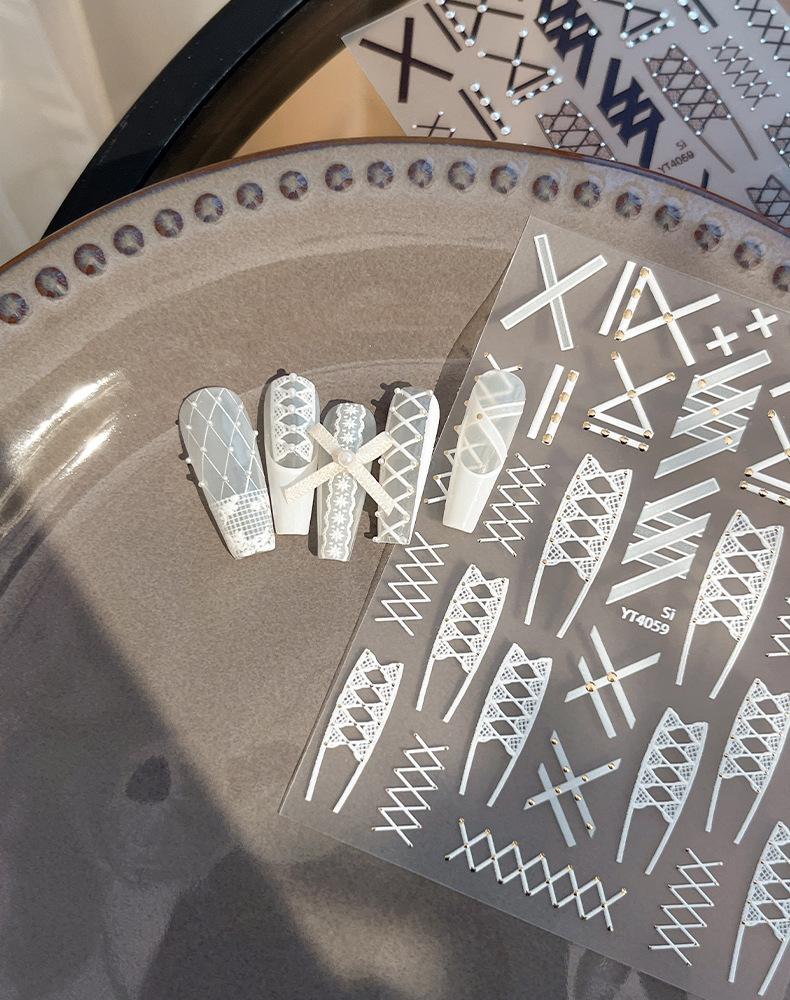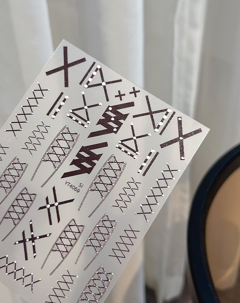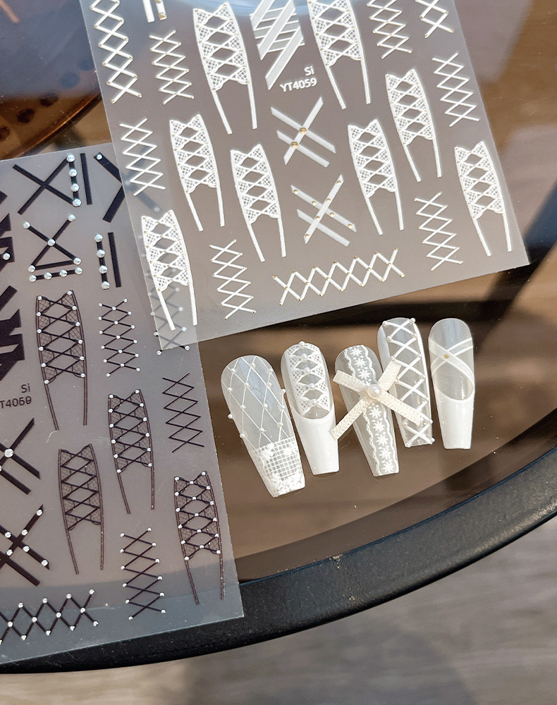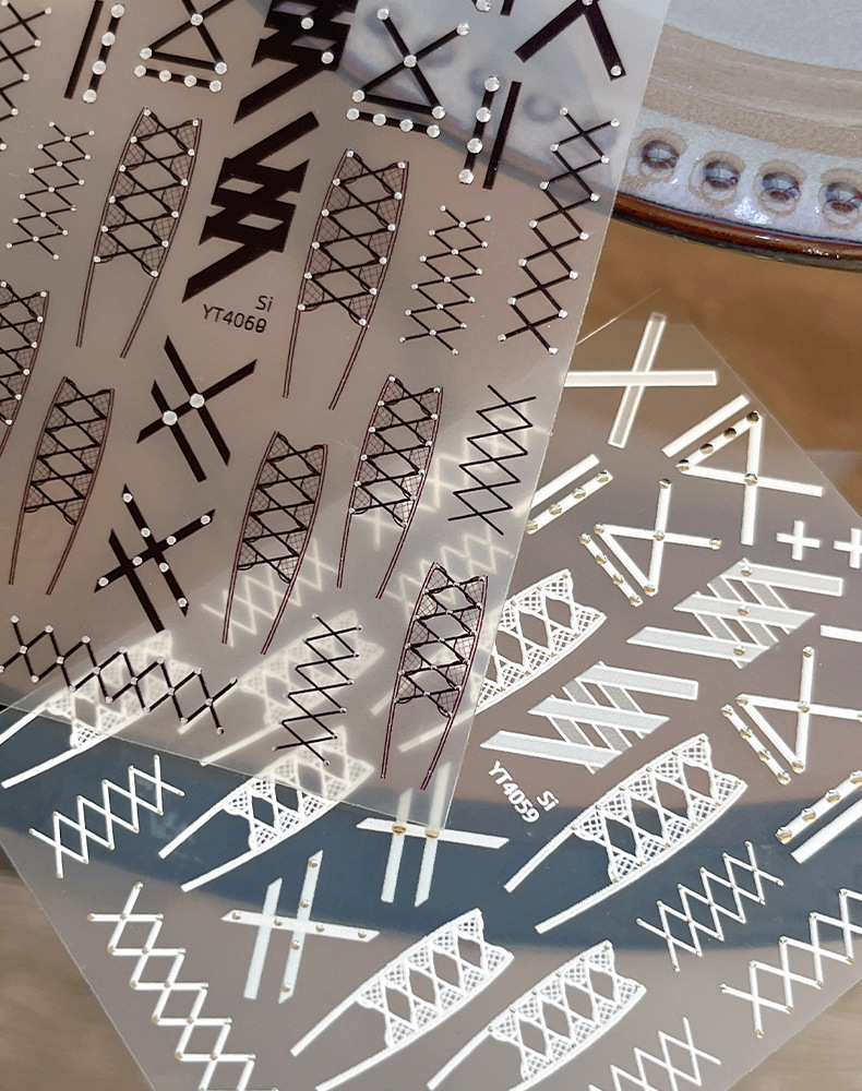 새로운 핫 실버 리벳 레이스 스트랩 네일 아트 스티커 흑백 절묘한 격자 무늬 접착제 네일 장식 도매