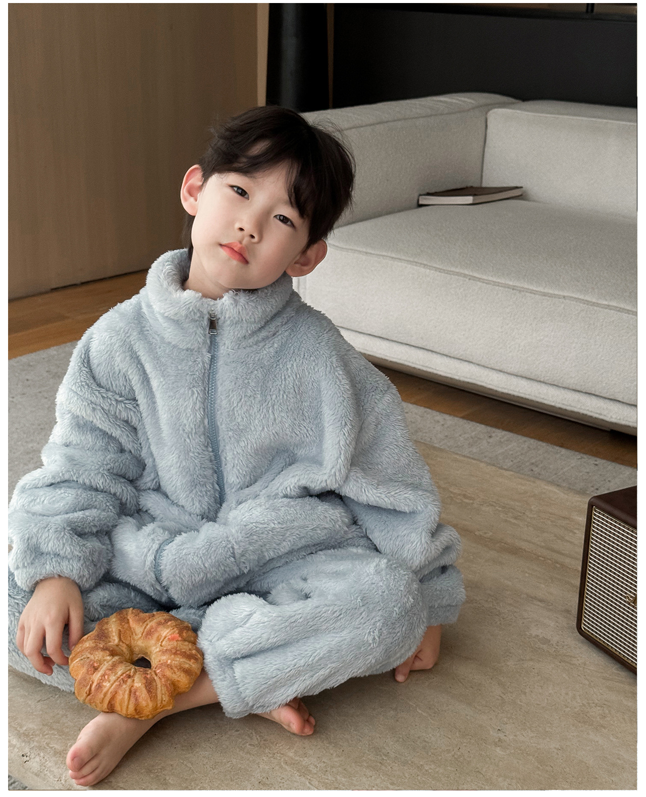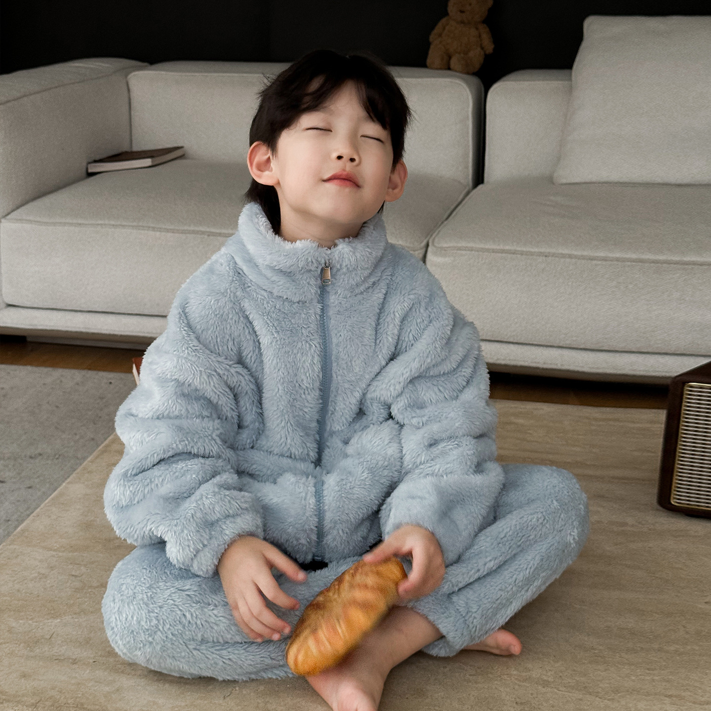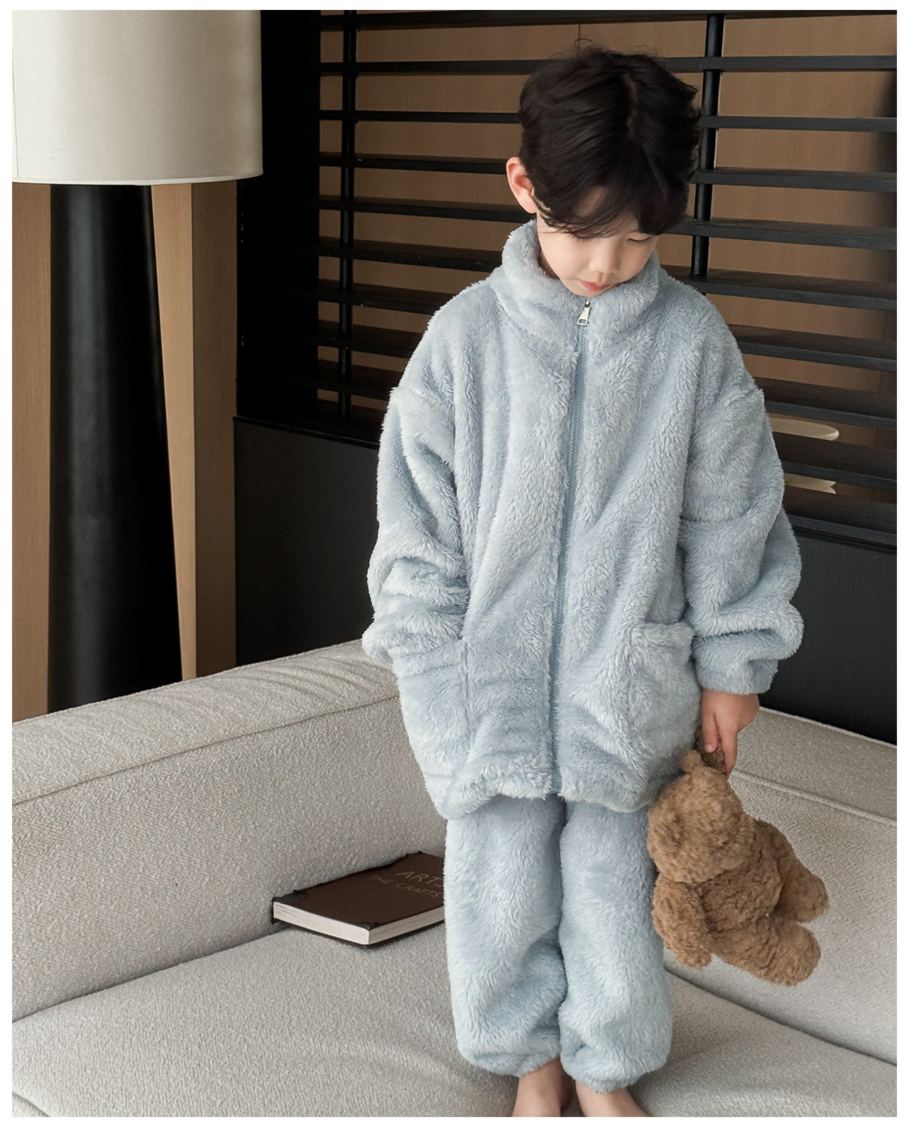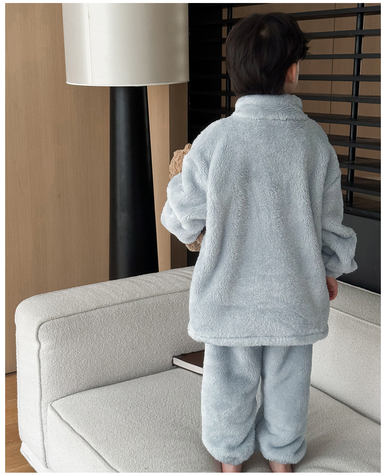 【겨울 특가 클리어런스】완투 어린이 겨울용 단색 양면 빗질된 면 벨벳 홈웨어 남아용 잠옷 세트스토어 가기