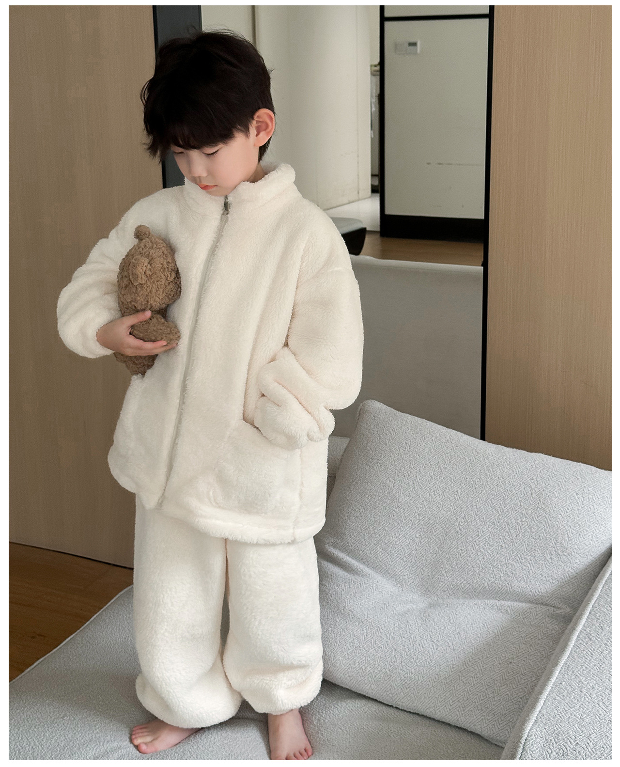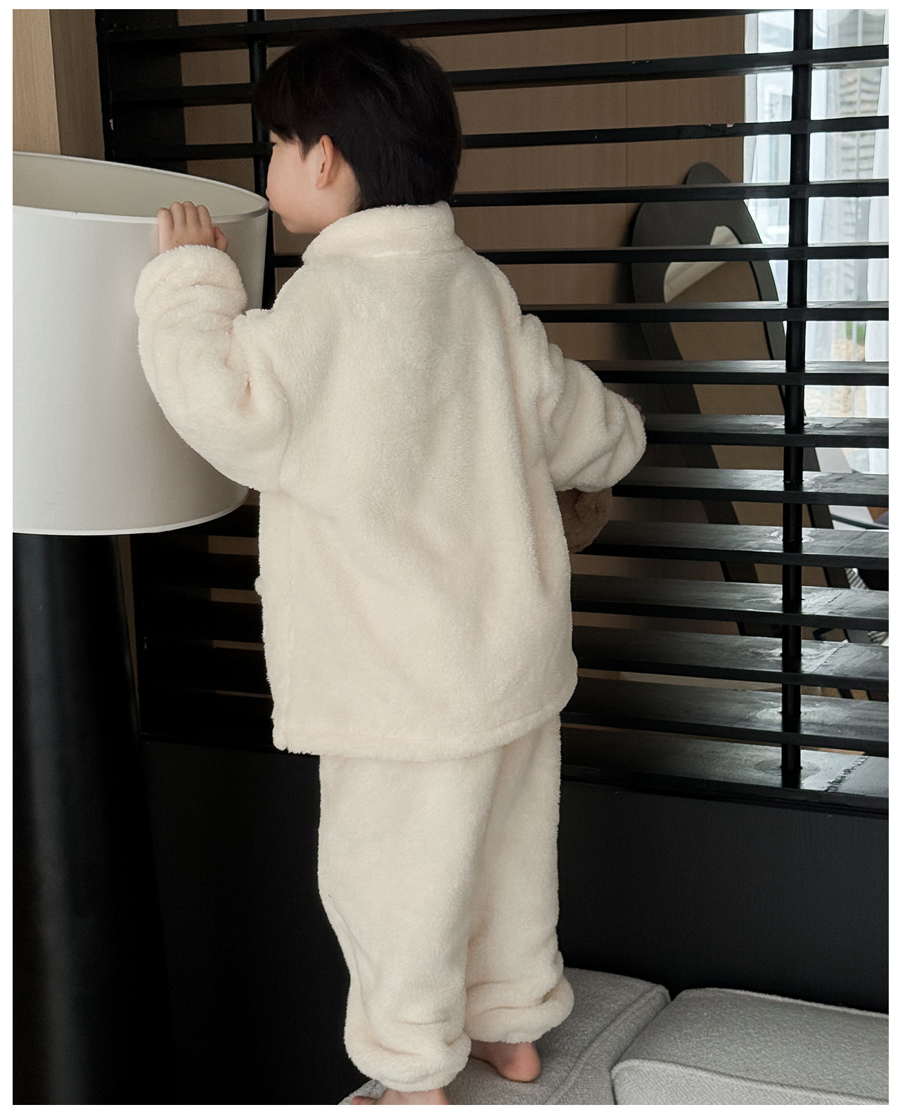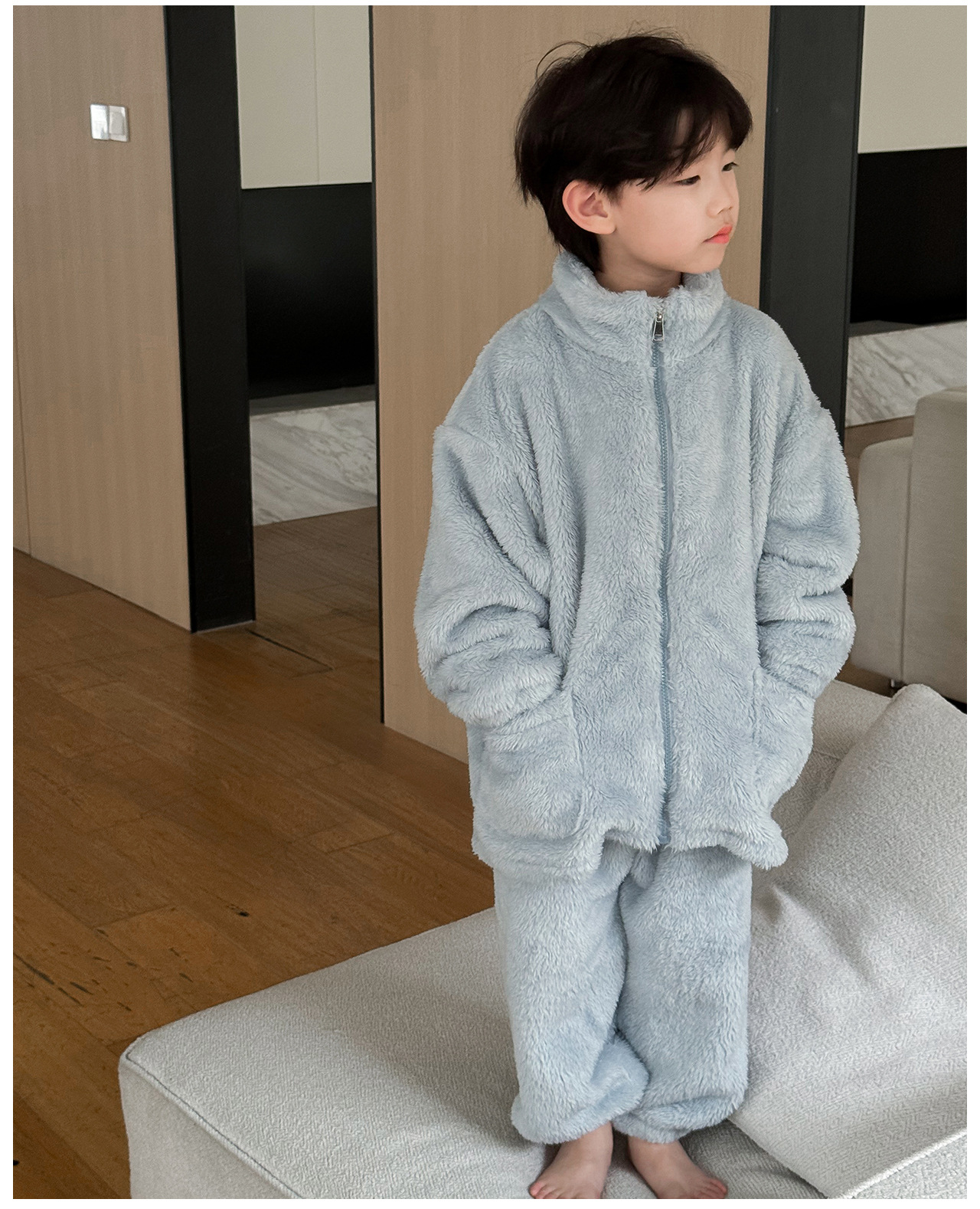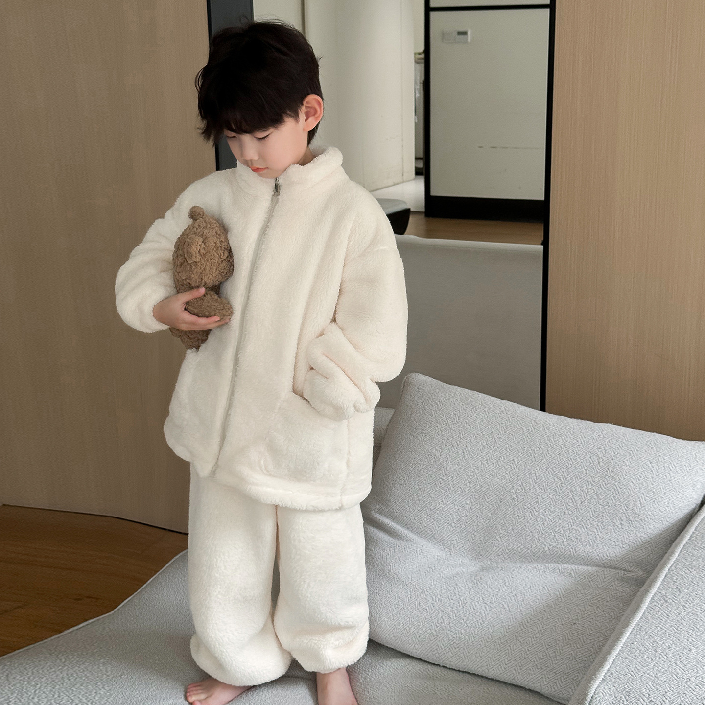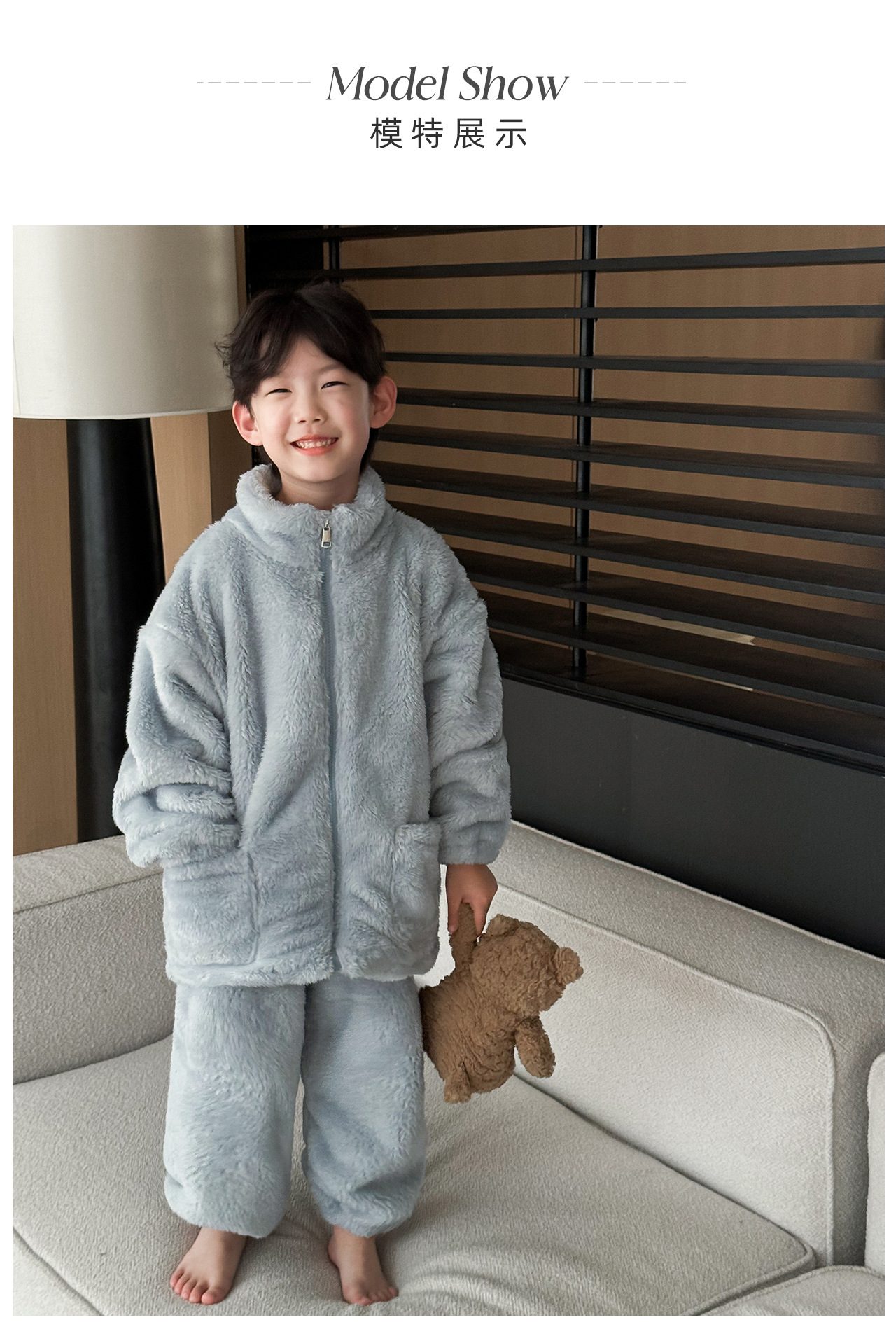 【겨울 특가 클리어런스】완투 어린이 겨울용 단색 양면 빗질된 면 벨벳 홈웨어 남아용 잠옷 세트스토어 가기