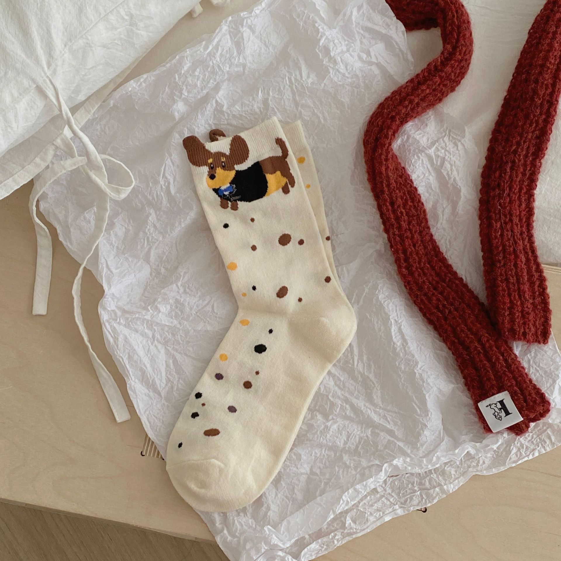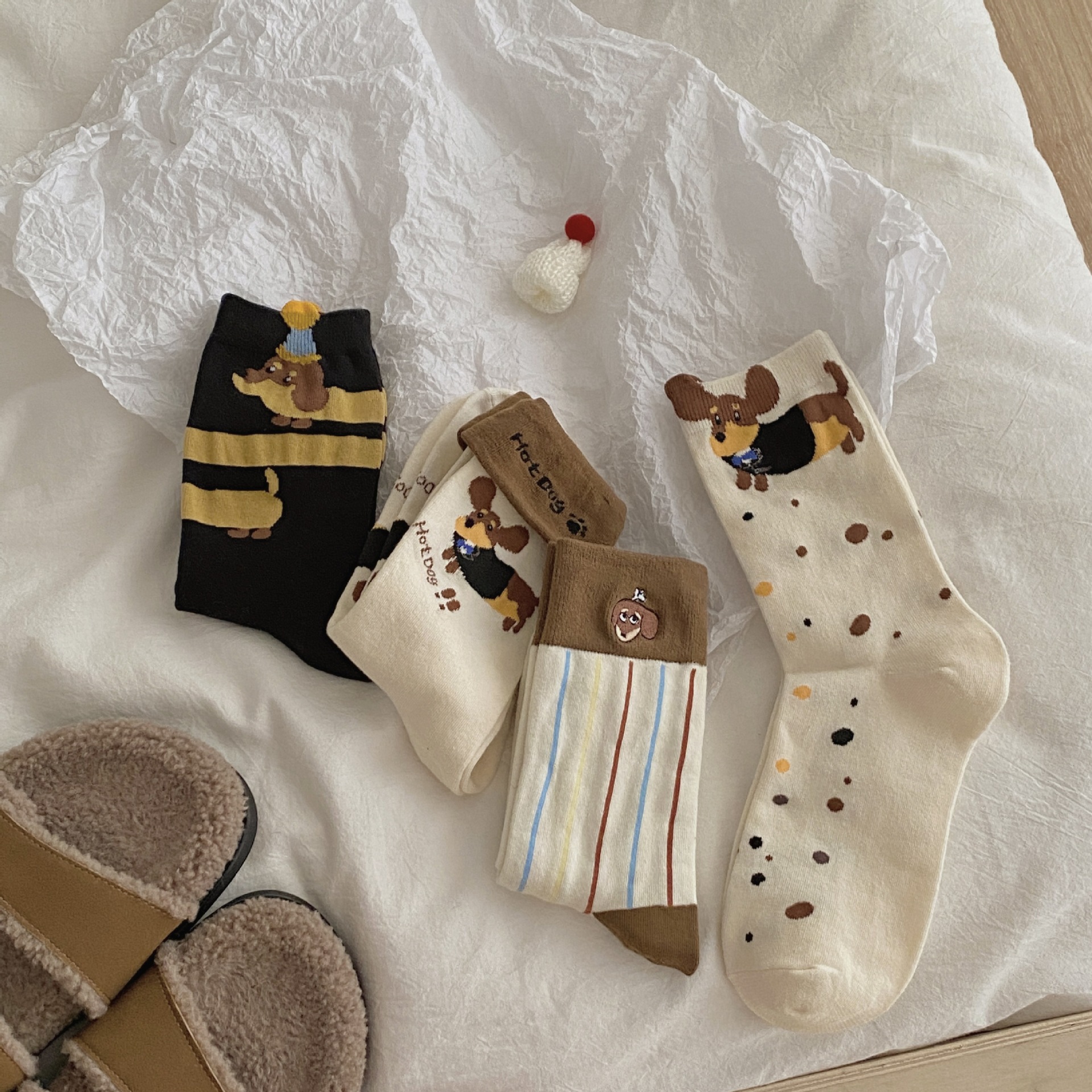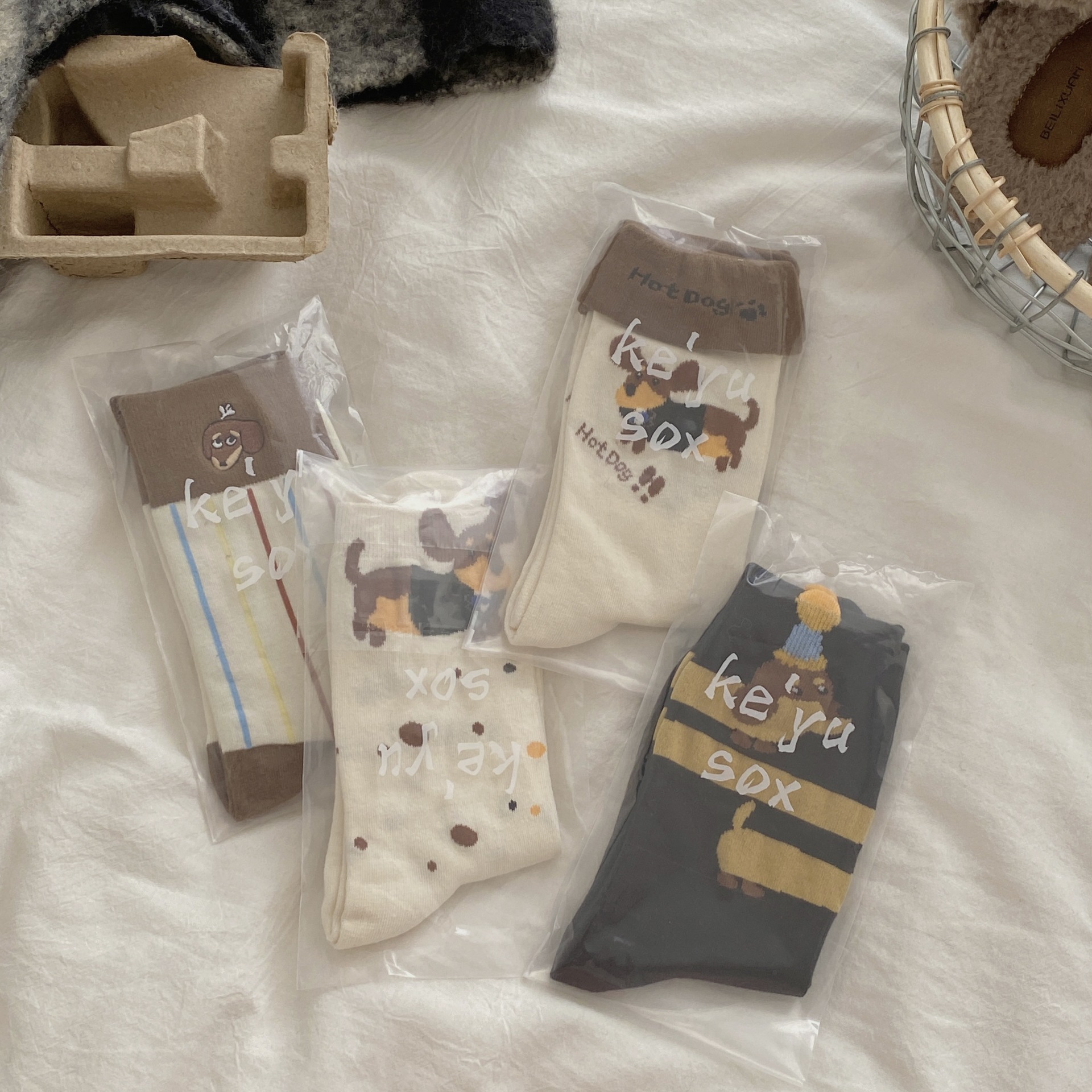 빈티지 컬러 매칭 3 차원 강아지 ~ 귀여운 자수 폴로 도트 수직 스트립 양말 여성의 가을과 겨울 일본 다크 브라운 양말 순면스토어 가기