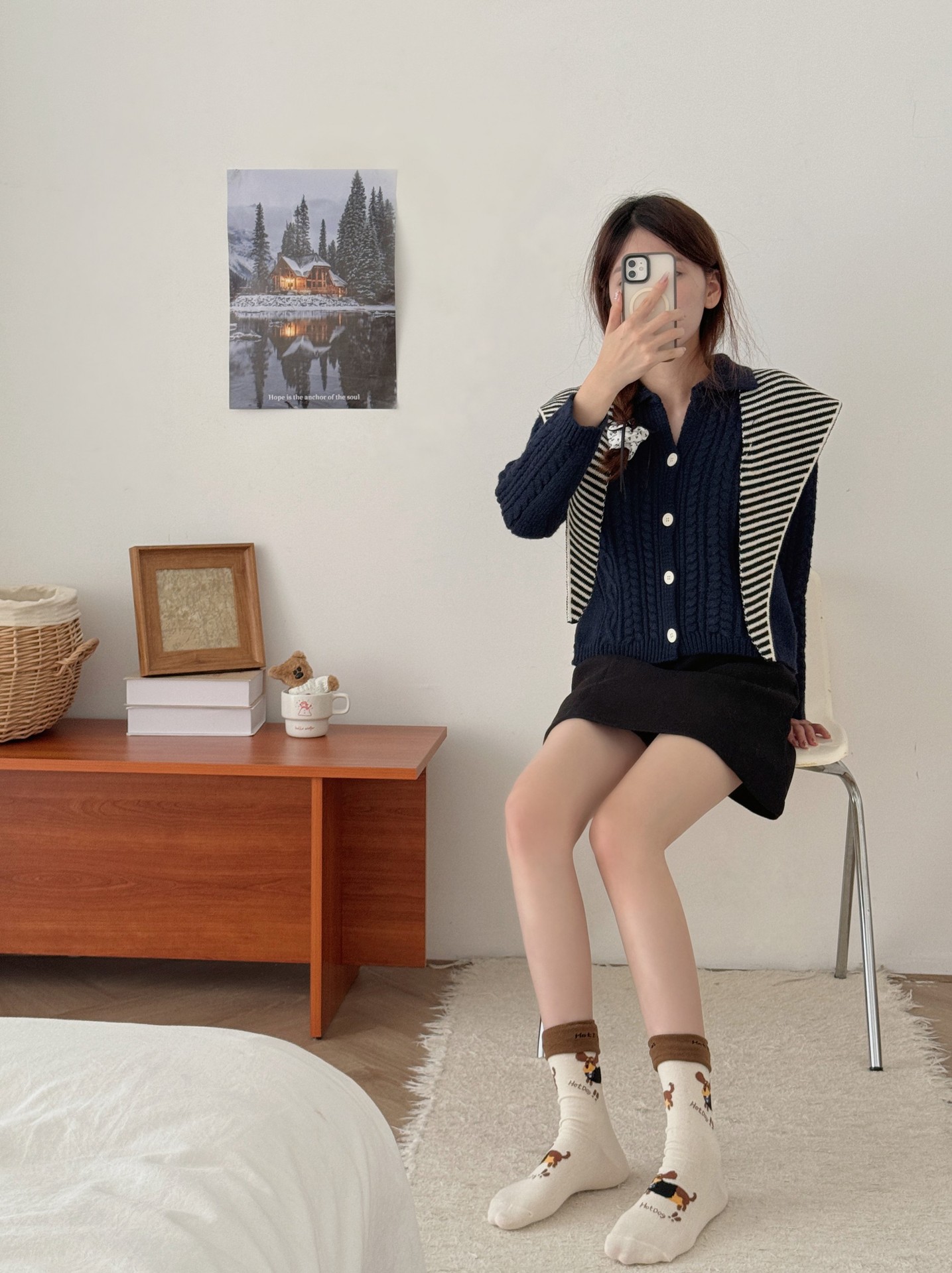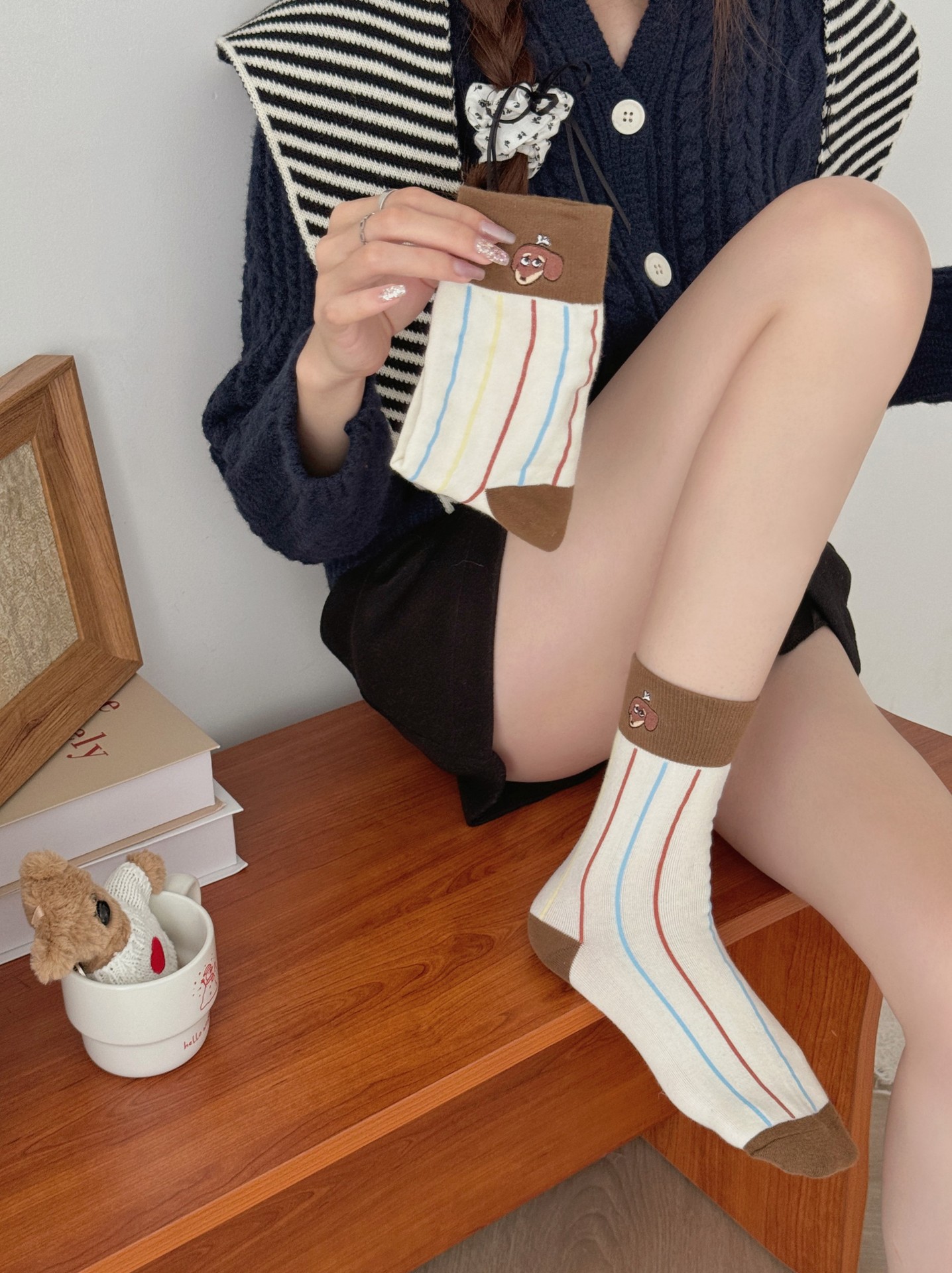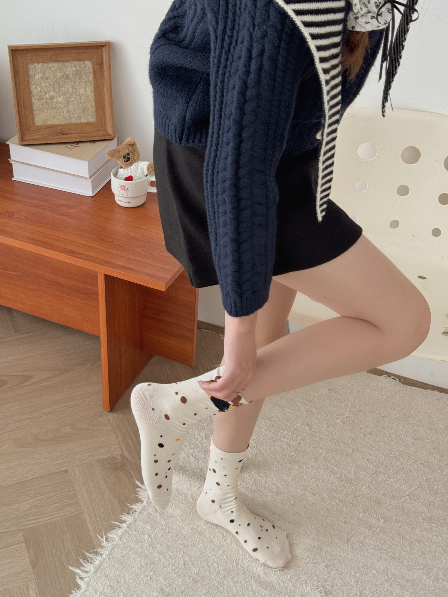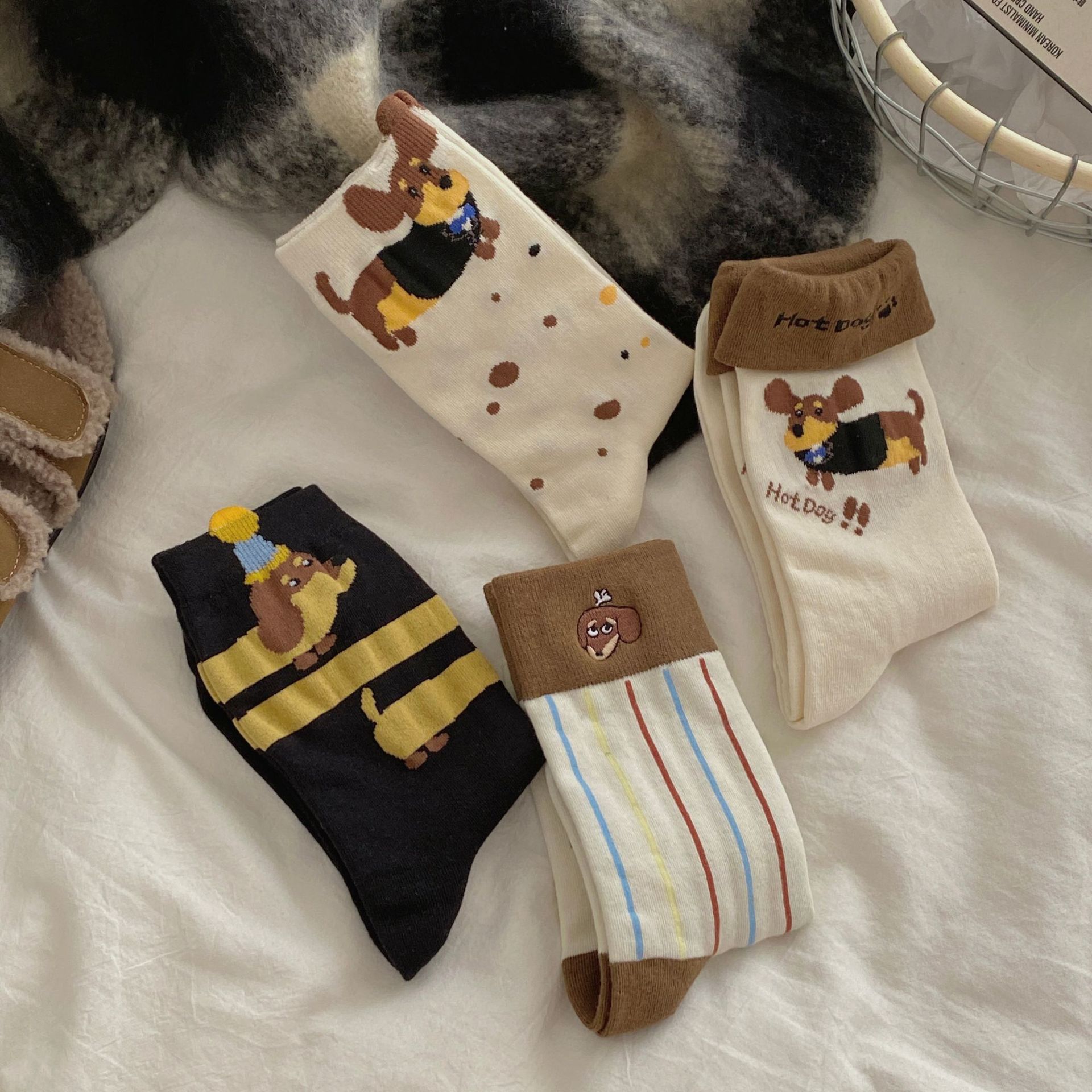 빈티지 컬러 매칭 3 차원 강아지 ~ 귀여운 자수 폴로 도트 수직 스트립 양말 여성의 가을과 겨울 일본 다크 브라운 양말 순면스토어 가기