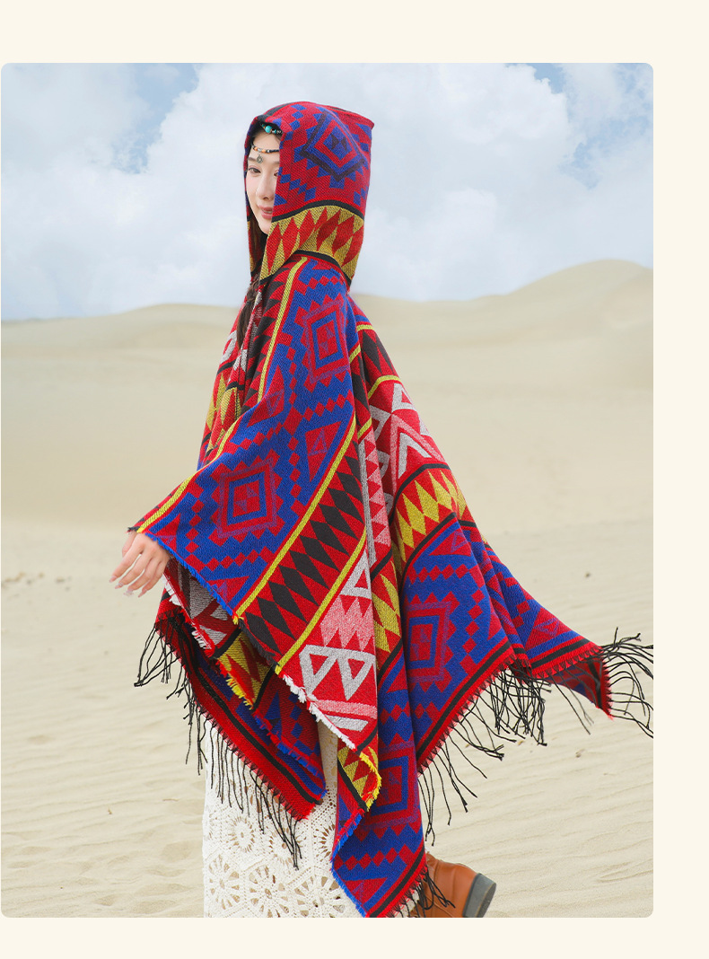 민족 스타일 후드 목도리 망토 리장 신장 티베트 북서 관광복 사진 따뜻한 외투를 입고