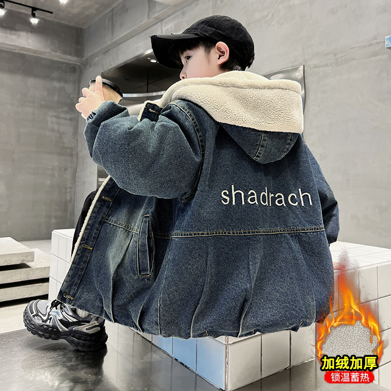 소년 벨벳 재킷 어린이 2024 새로운 가을과 겨울 유행 두꺼운 후드 자켓 빅 보이의 데님 탑스토어 가기