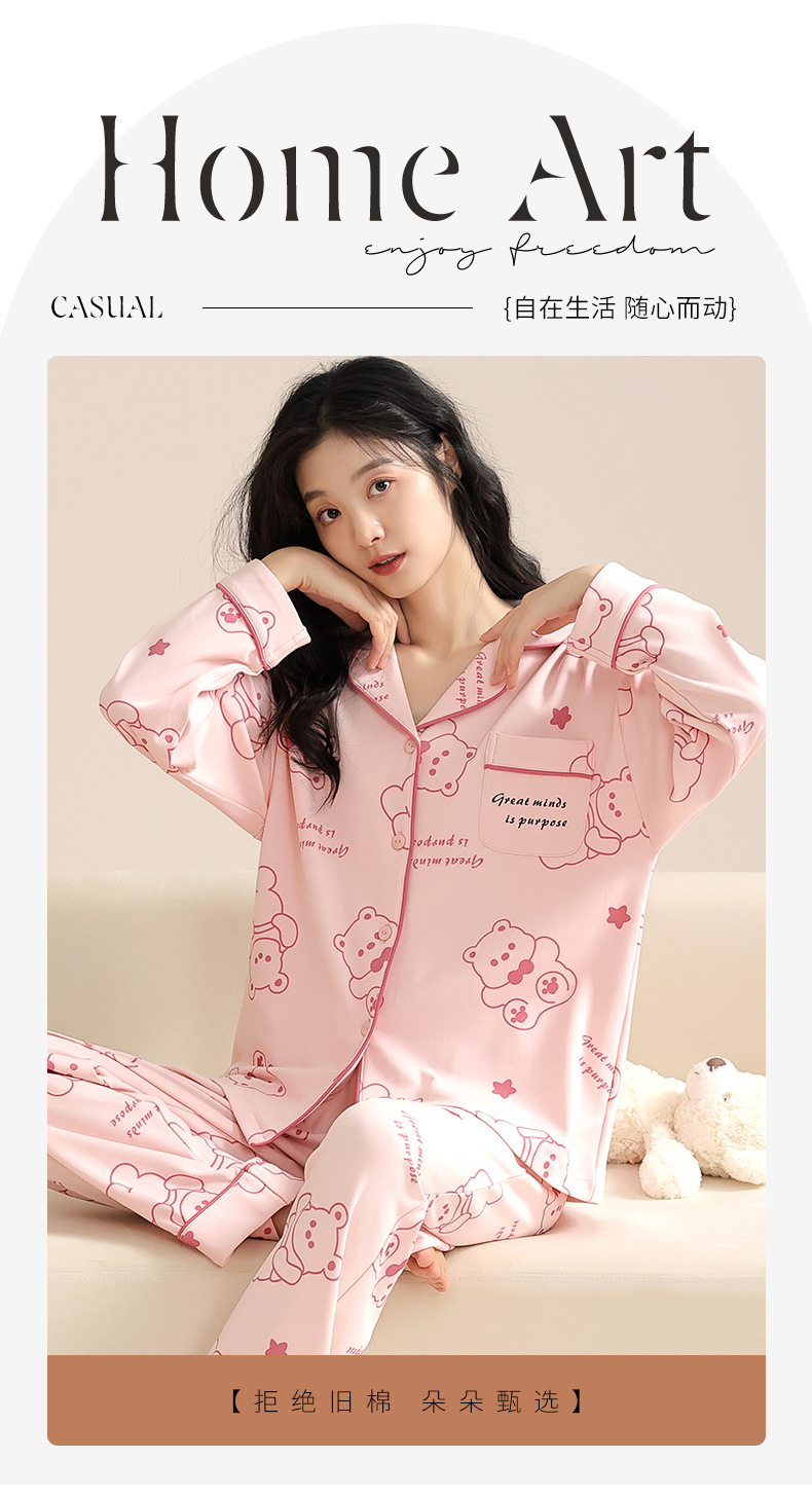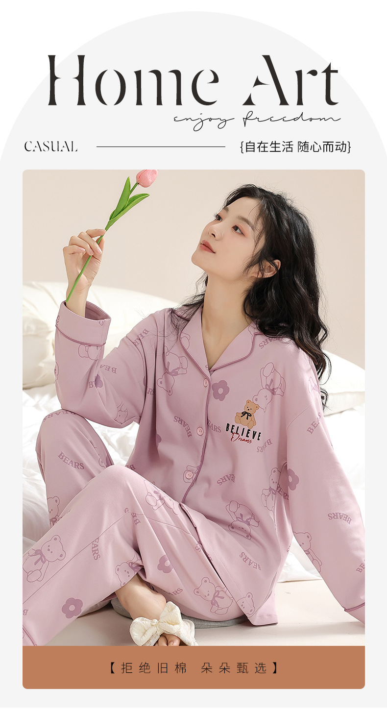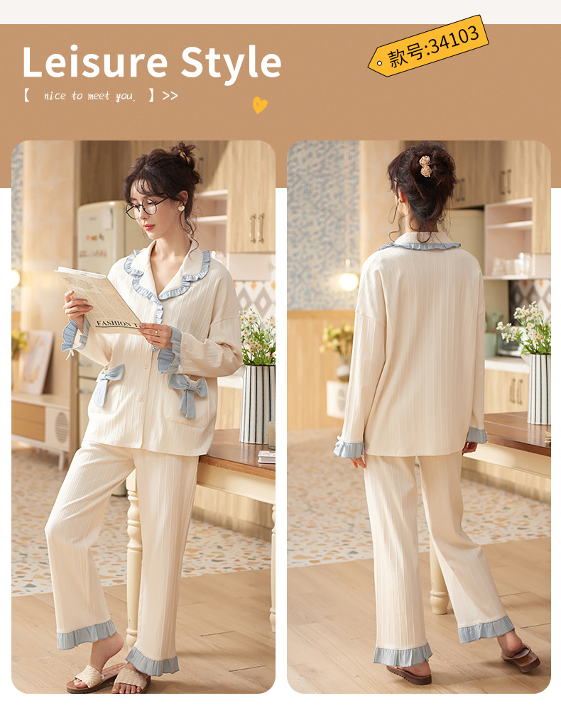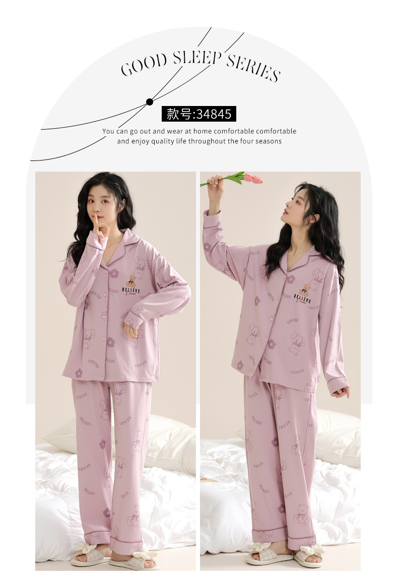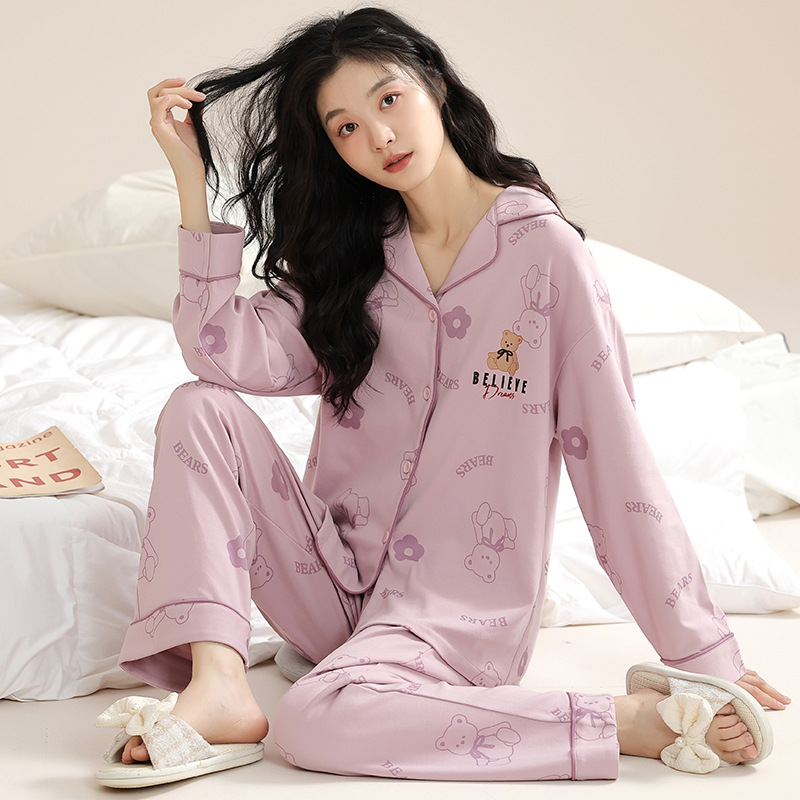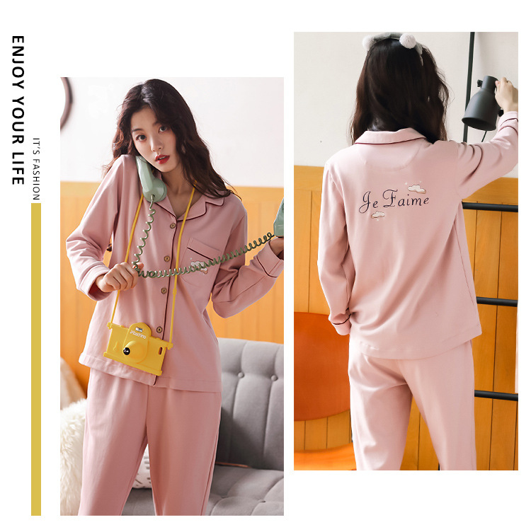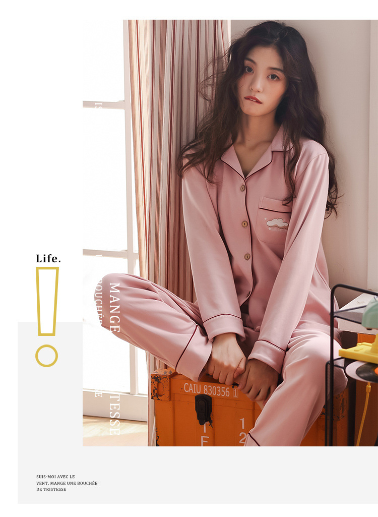 봄과 가을 새 잠옷 여성 긴 소매 바지 면 홈 착용 달콤한 한국 단색 세트 라이브 폭발스토어 가기