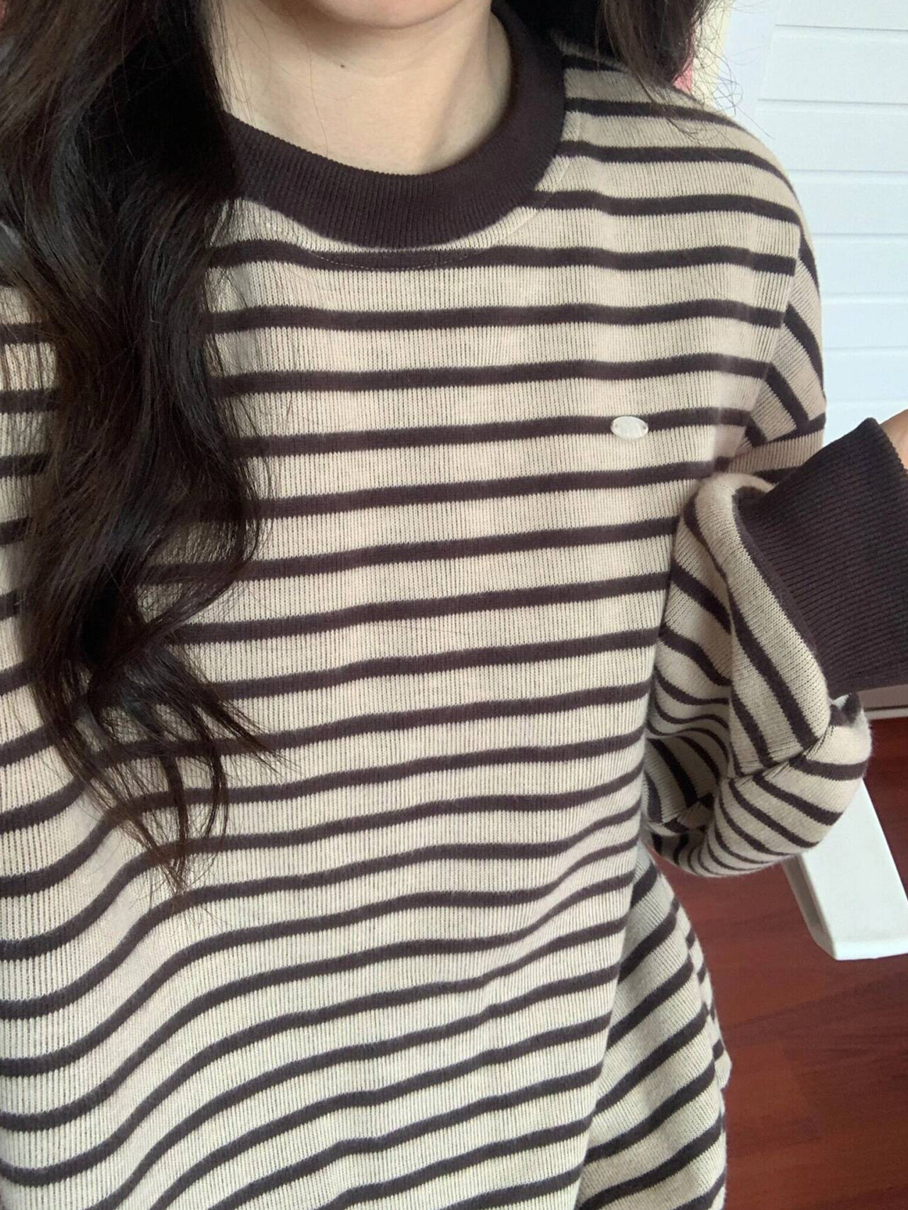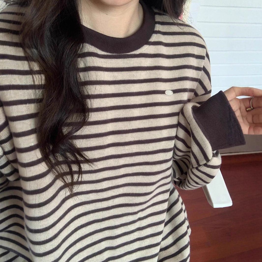 가을과 겨울 복고풍 홍콩 풍미의 세대 느슨한 플러스 사이즈 줄무늬 세련된 긴팔 티셔츠 스웨터 여성의 게으른 윈드 코트