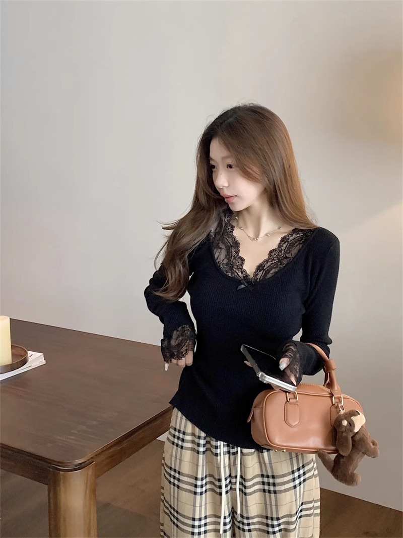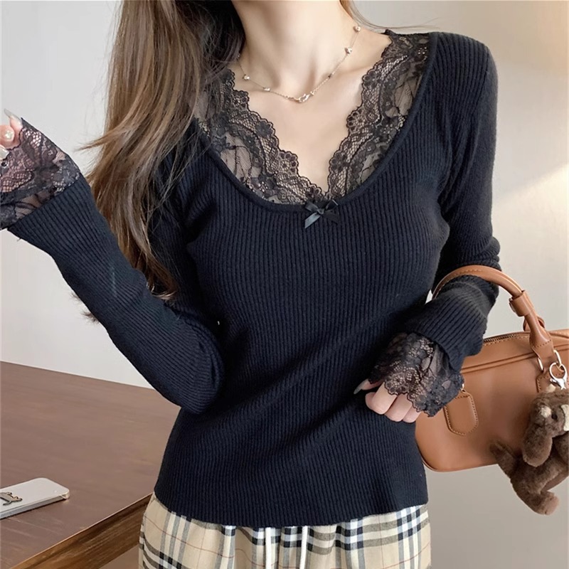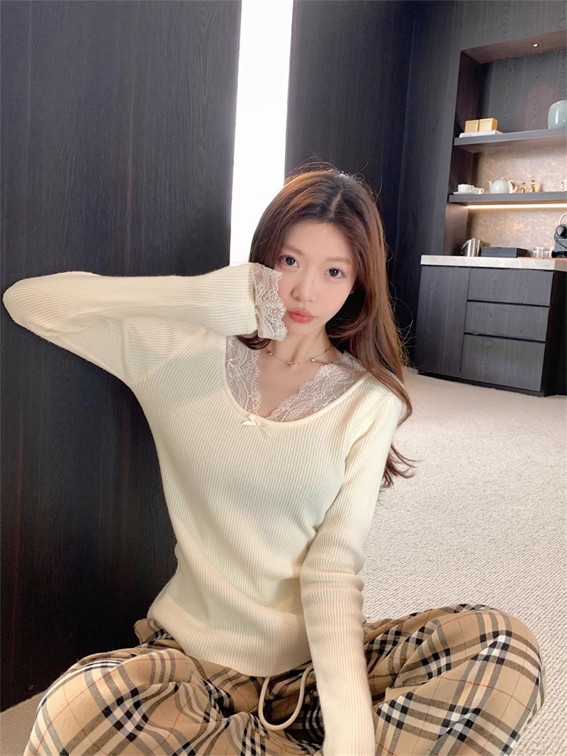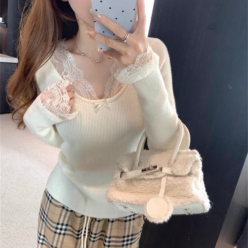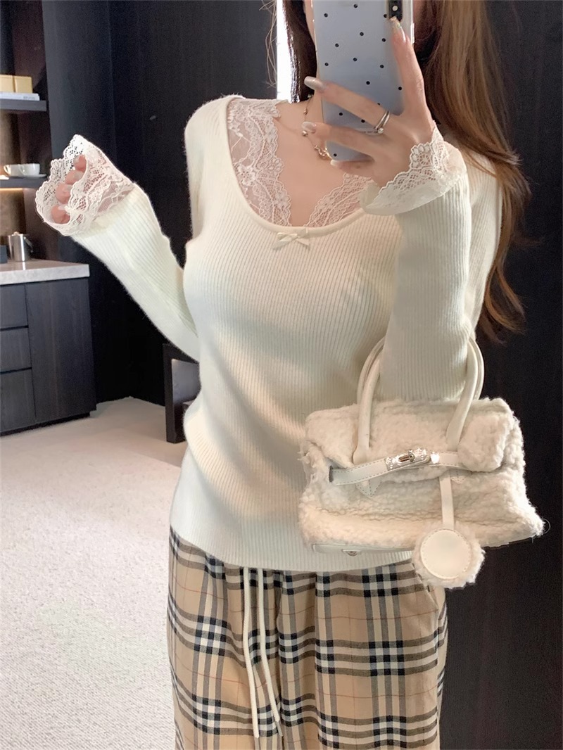 달콤하고 매운 화이트 레이스 V 넥 스웨터 여성의 2024 가을 및 겨울 고급 샤넬 스타일 내부 니트 베이스 긴팔 탑