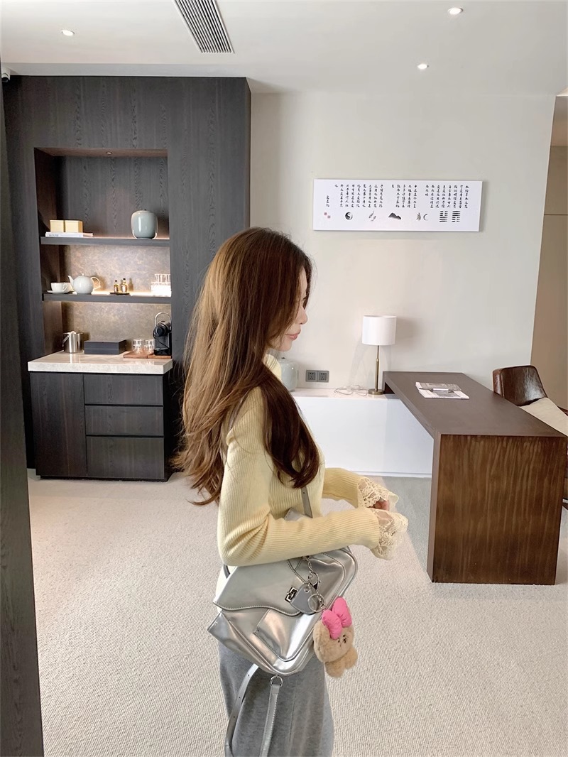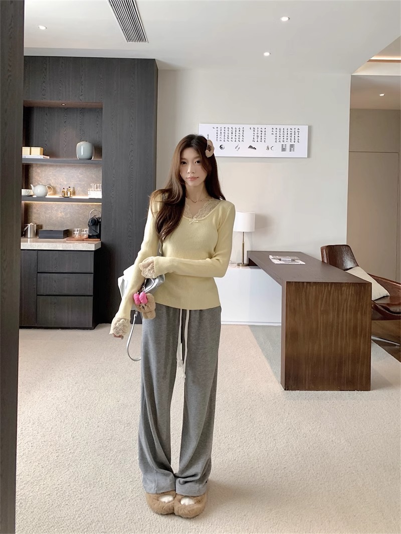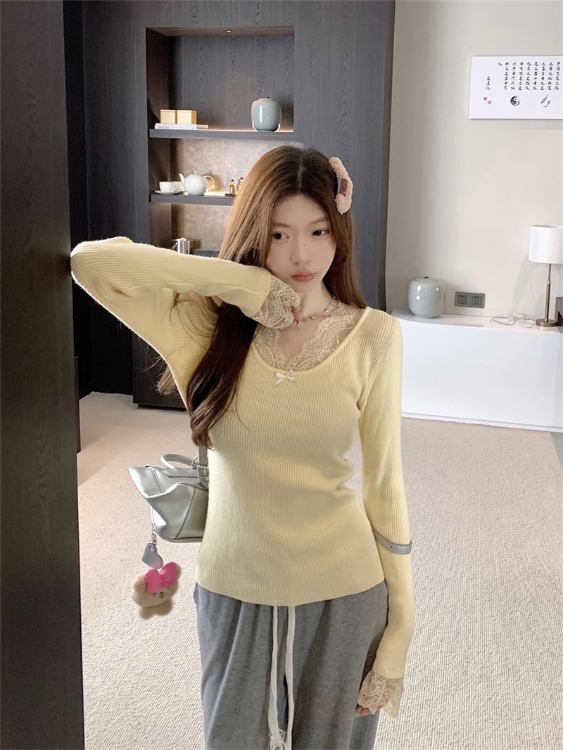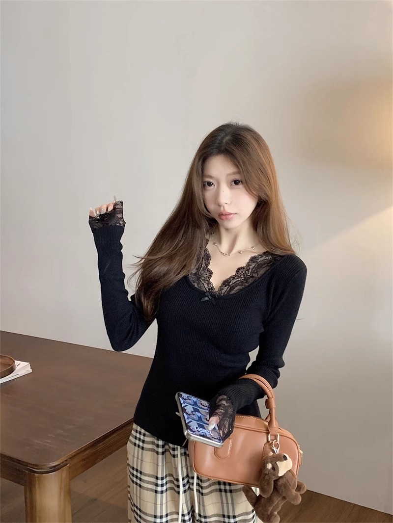 달콤하고 매운 화이트 레이스 V 넥 스웨터 여성의 2024 가을 및 겨울 고급 샤넬 스타일 내부 니트 베이스 긴팔 탑