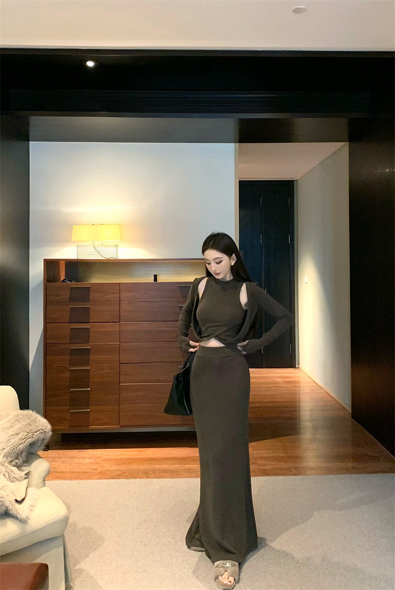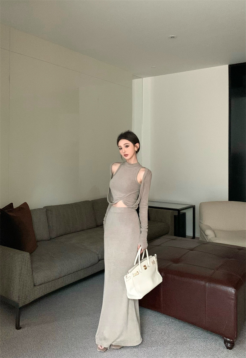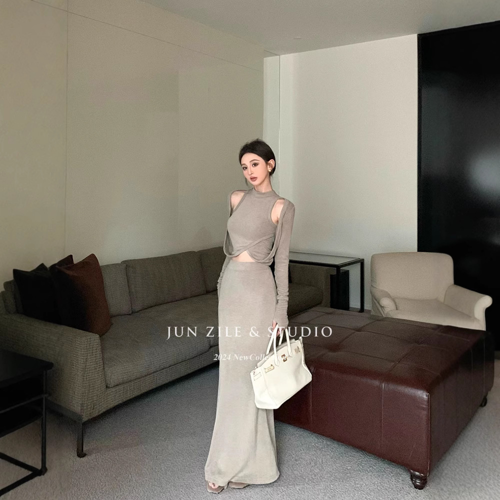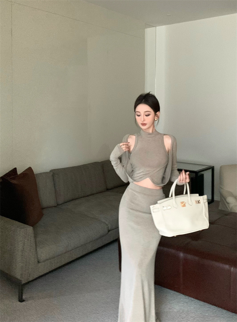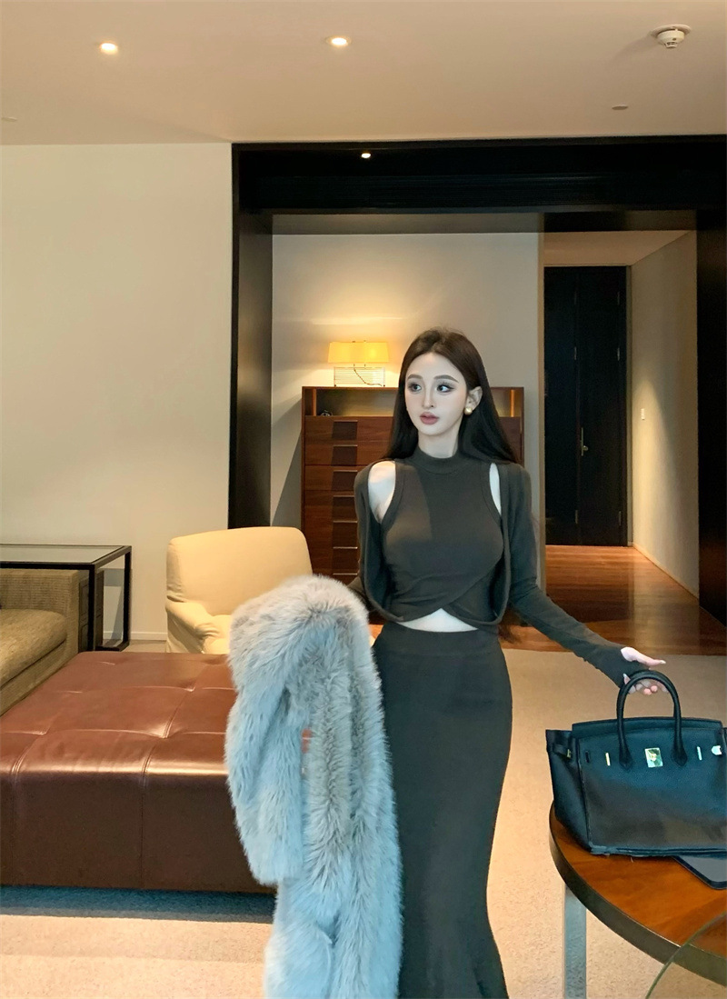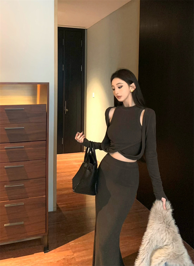 여성을위한 디자인 핫 소녀 탑 2025 가을 새로운 스타일 중공 스웨터 힙 스커트 여성을위한 패션 정장스토어 가기