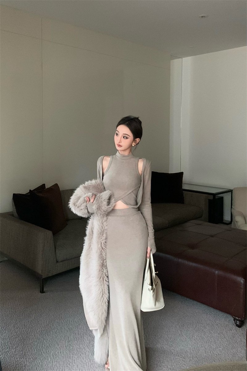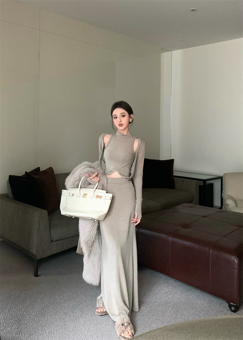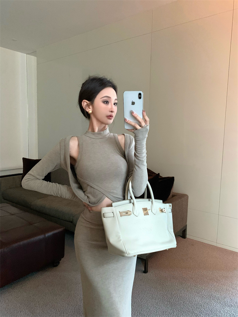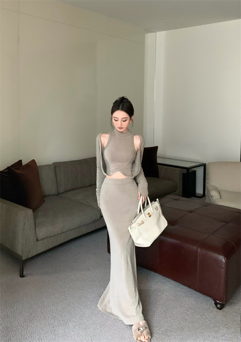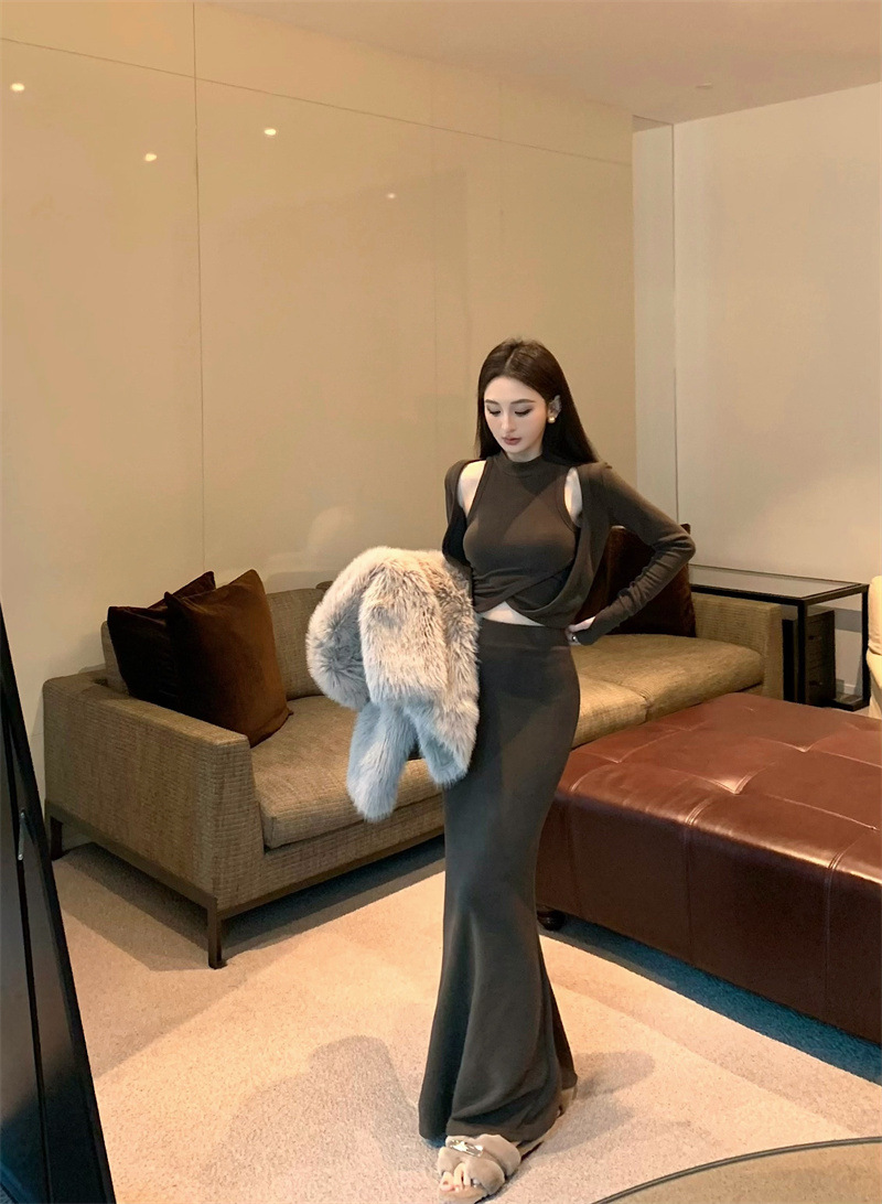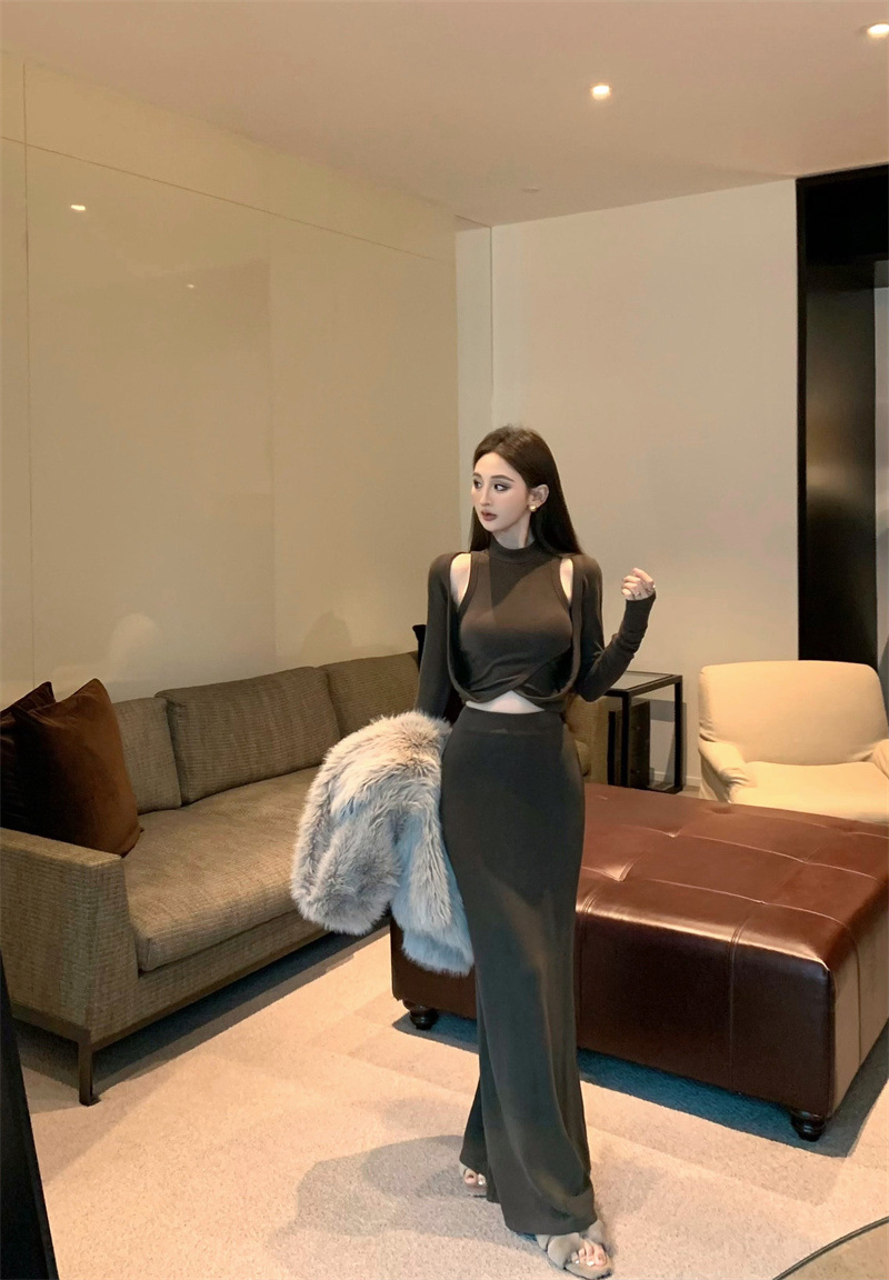 여성을위한 디자인 핫 소녀 탑 2025 가을 새로운 스타일 중공 스웨터 힙 스커트 여성을위한 패션 정장스토어 가기