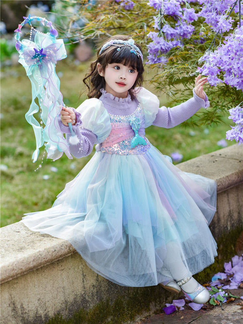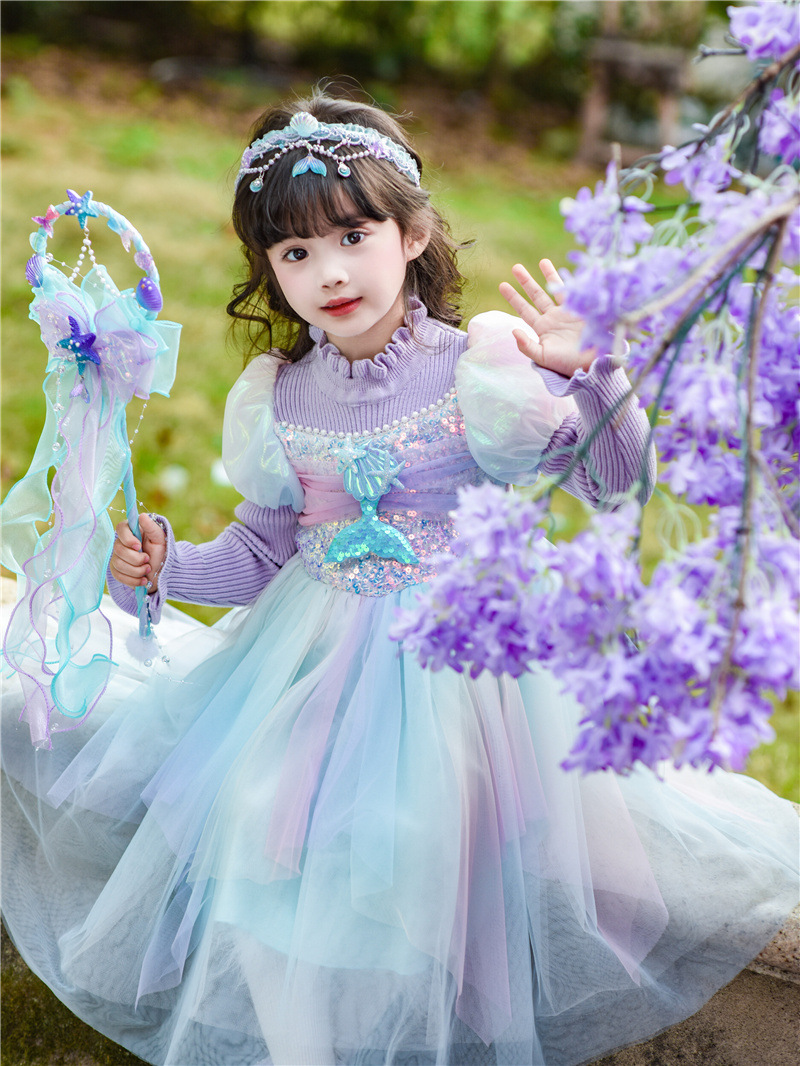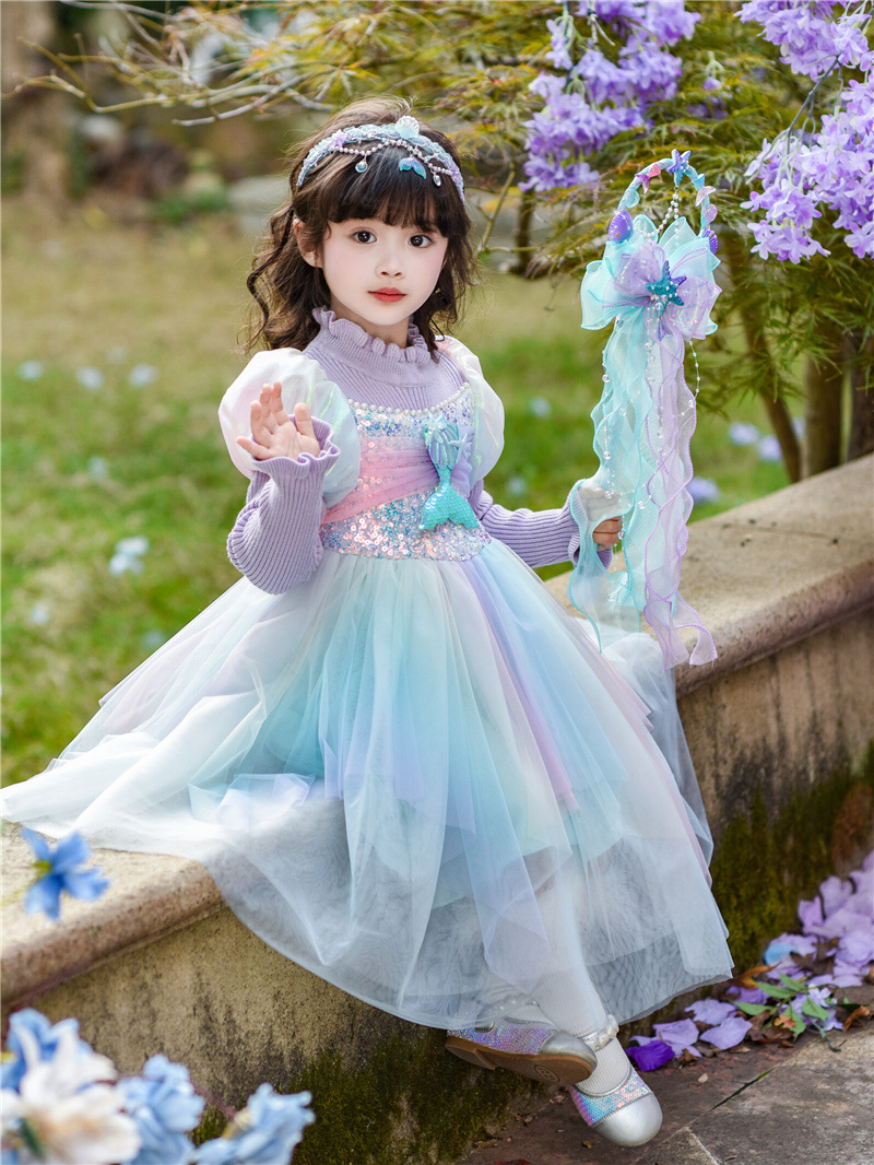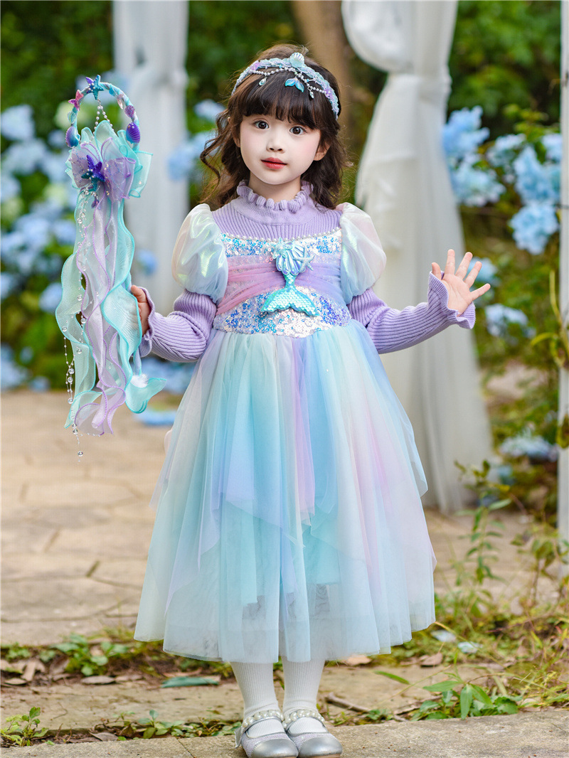 공주 드레스 여아 2024 가을 겨울 어린이 니트 화려한 인어 드레스 생일 드레스 스웨터 망사 드레스 여아용스토어 가기