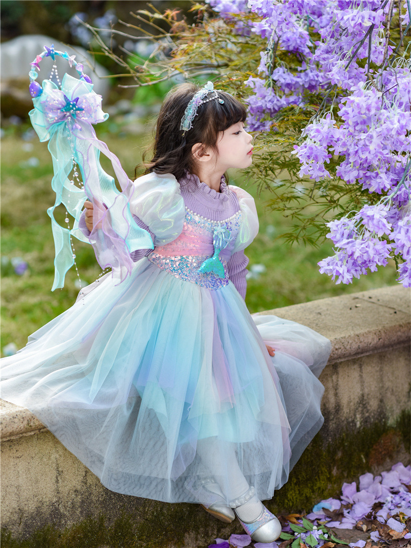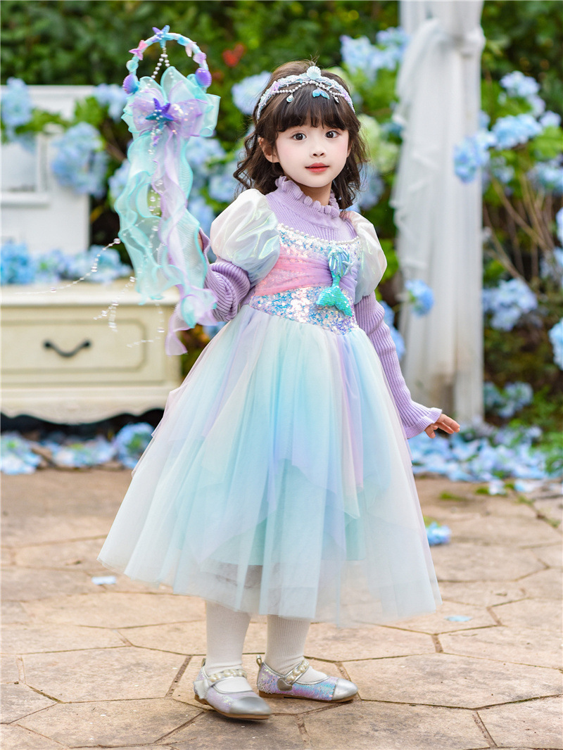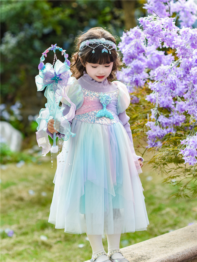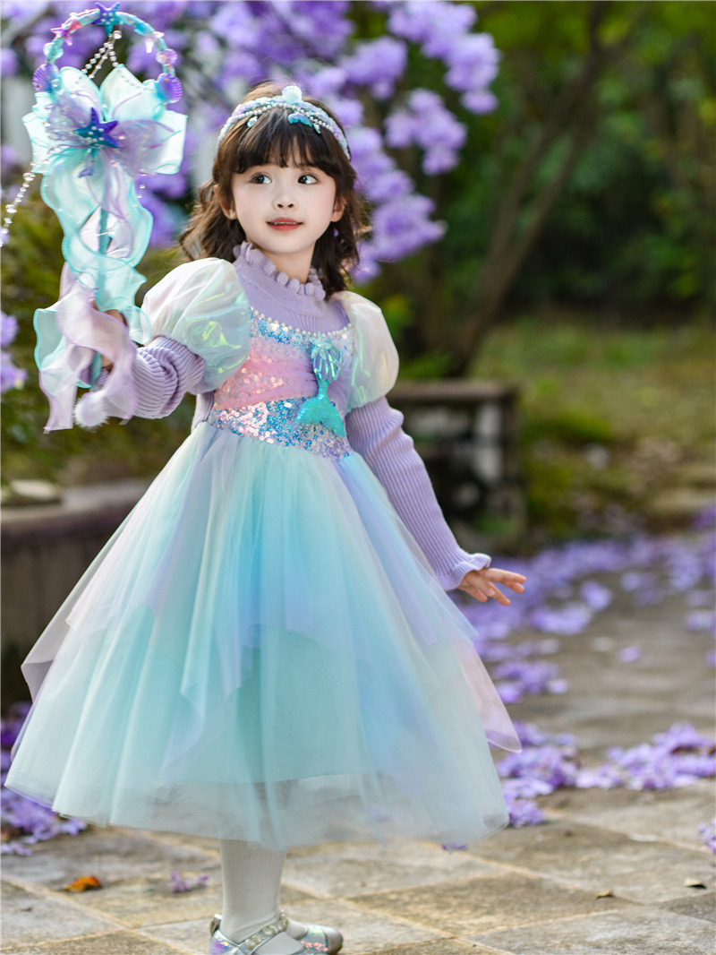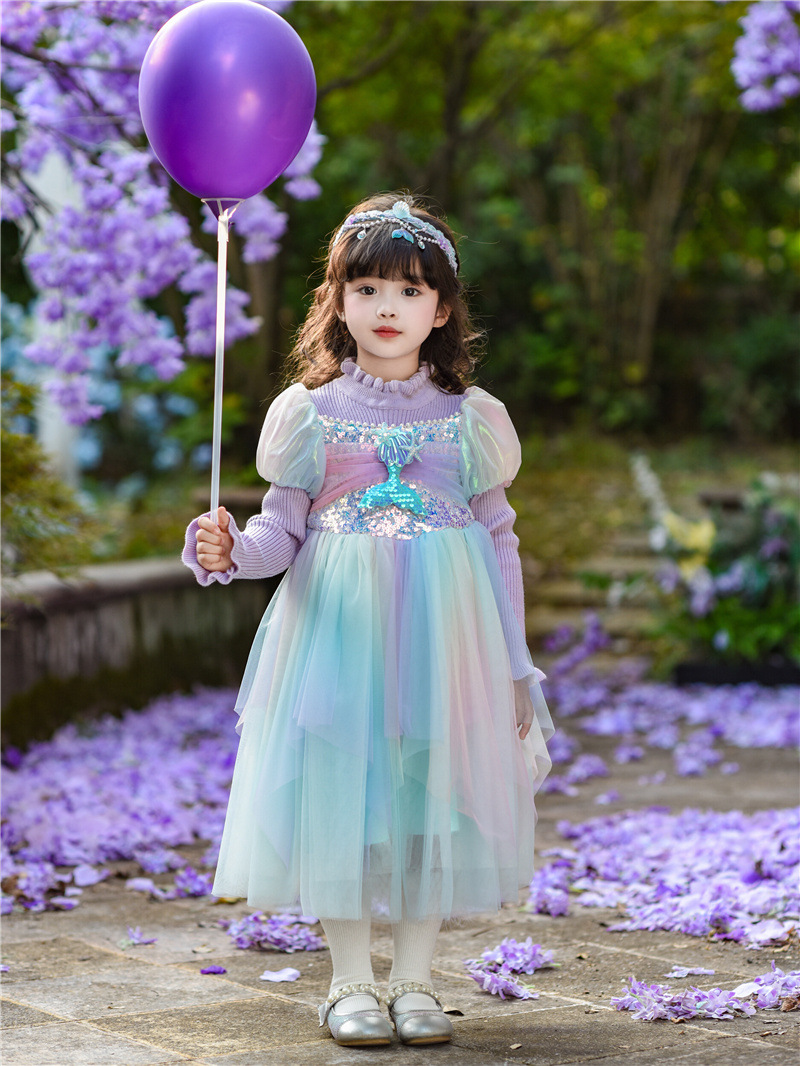 공주 드레스 여아 2024 가을 겨울 어린이 니트 화려한 인어 드레스 생일 드레스 스웨터 망사 드레스 여아용스토어 가기