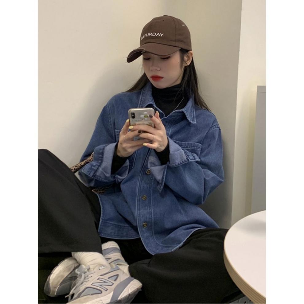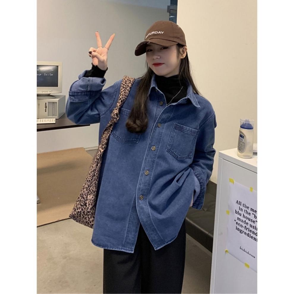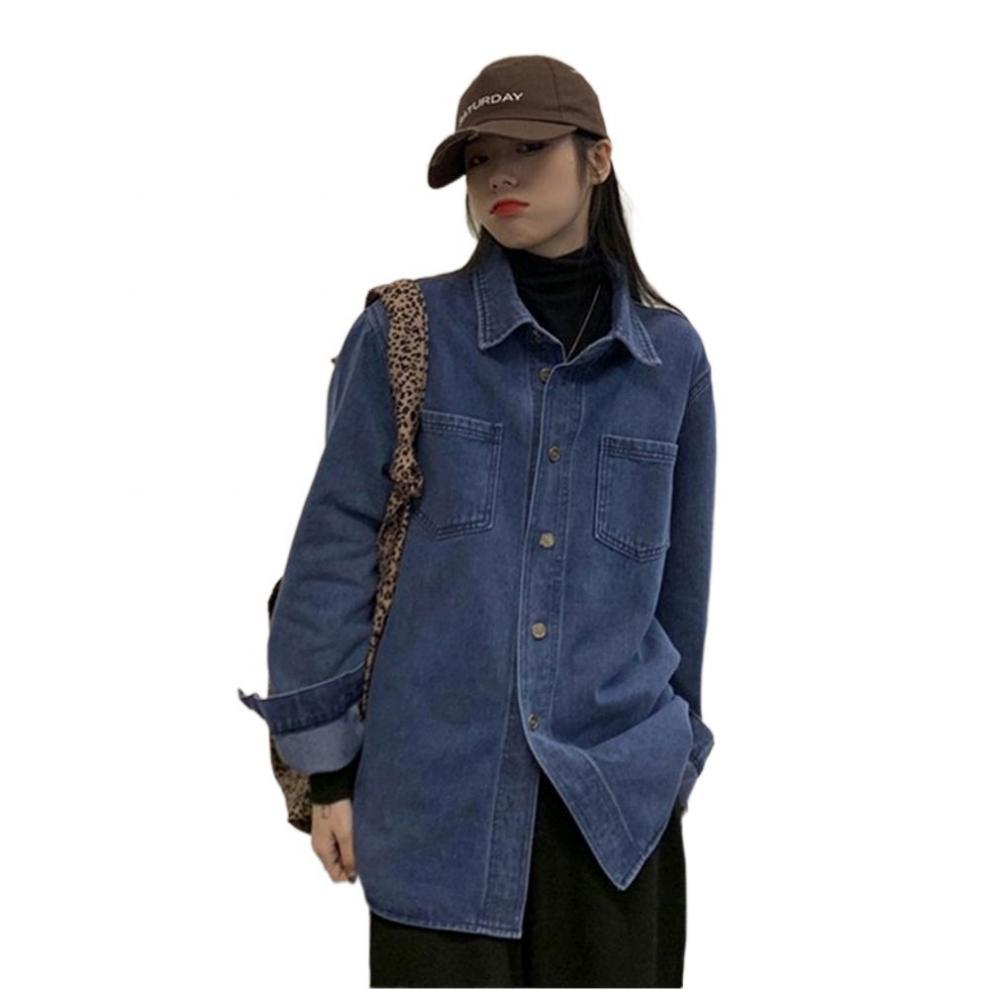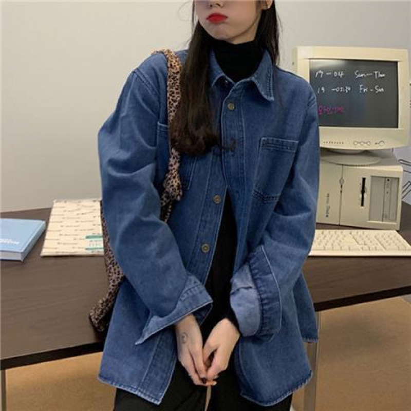 빈티지 홍콩 스타일 데님 셔츠 코트 여성의 봄과 가을 느슨한 슬리밍 캐주얼 올 매치 카디건 탑 긴팔 셔츠