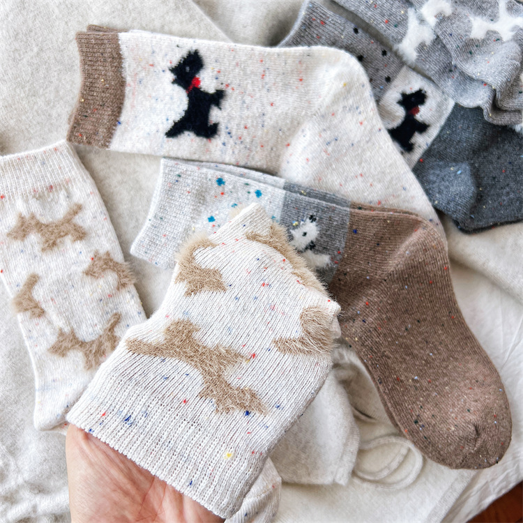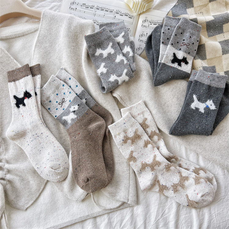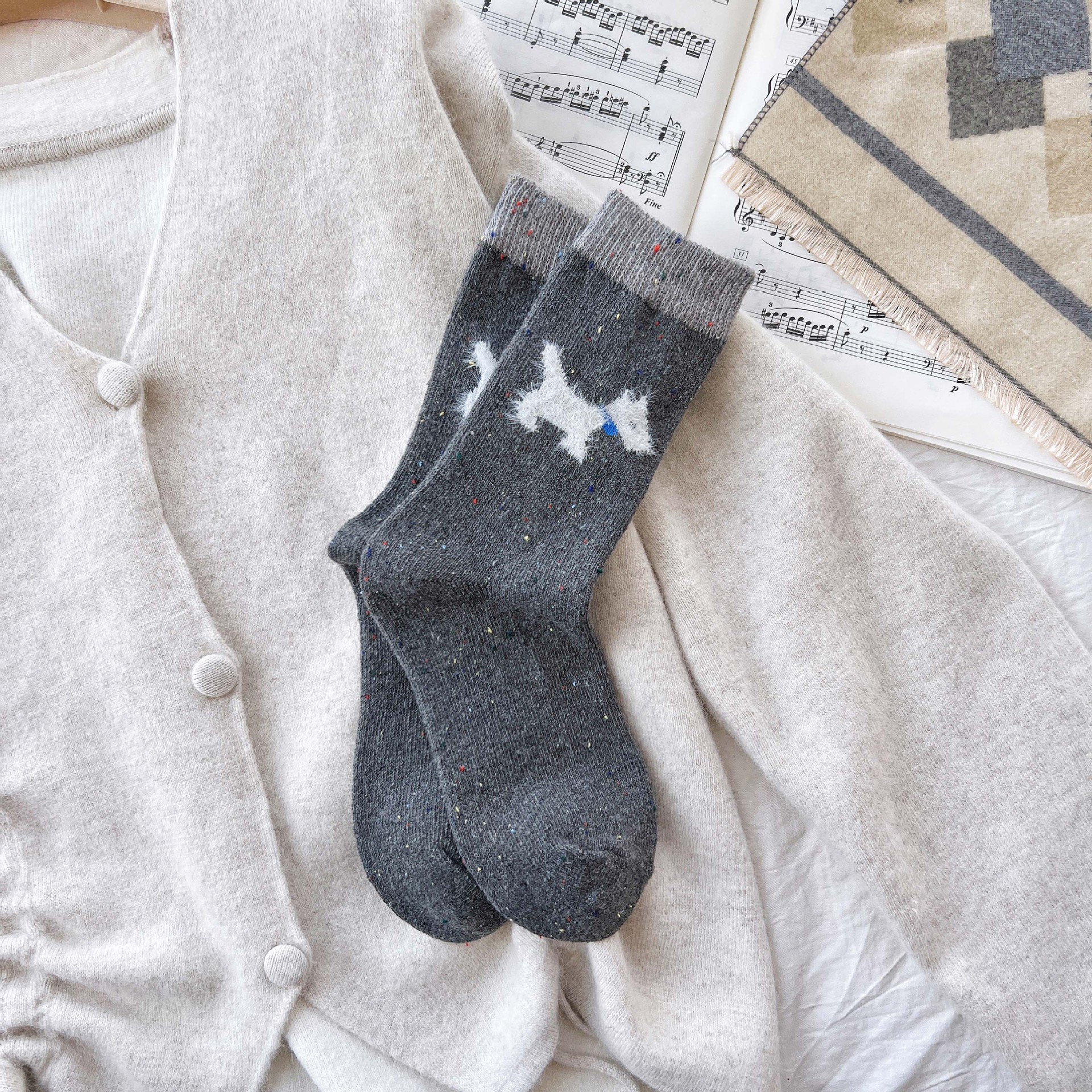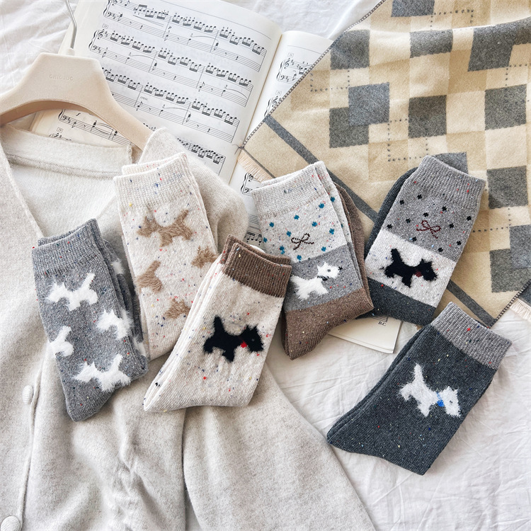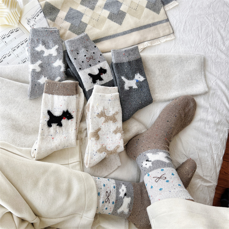 가을과 겨울 양모 양말 한국식 포인트 원사 보우 양말 여성 두꺼운 따뜻한 미드 양말 귀여운 강아지 더미 양말
