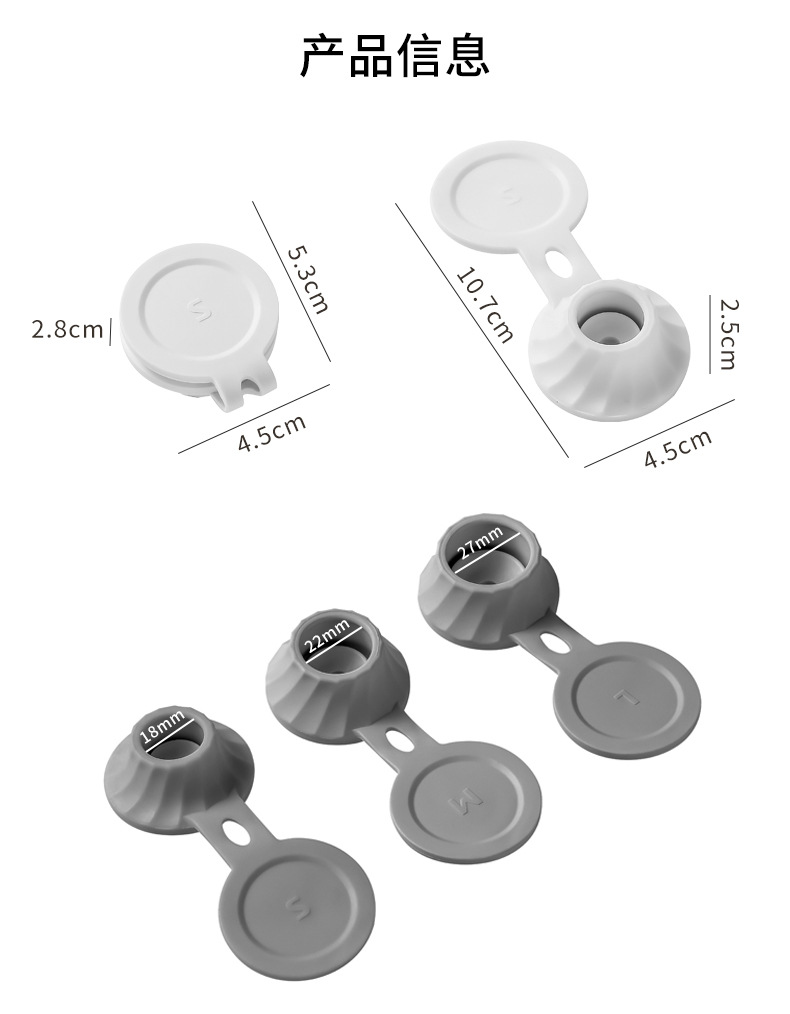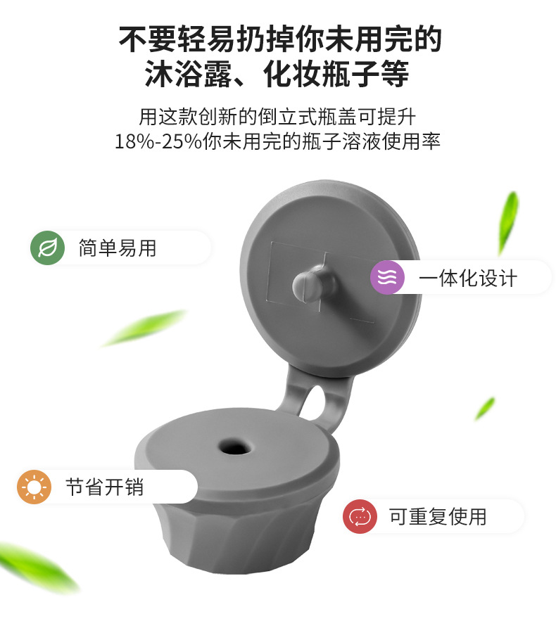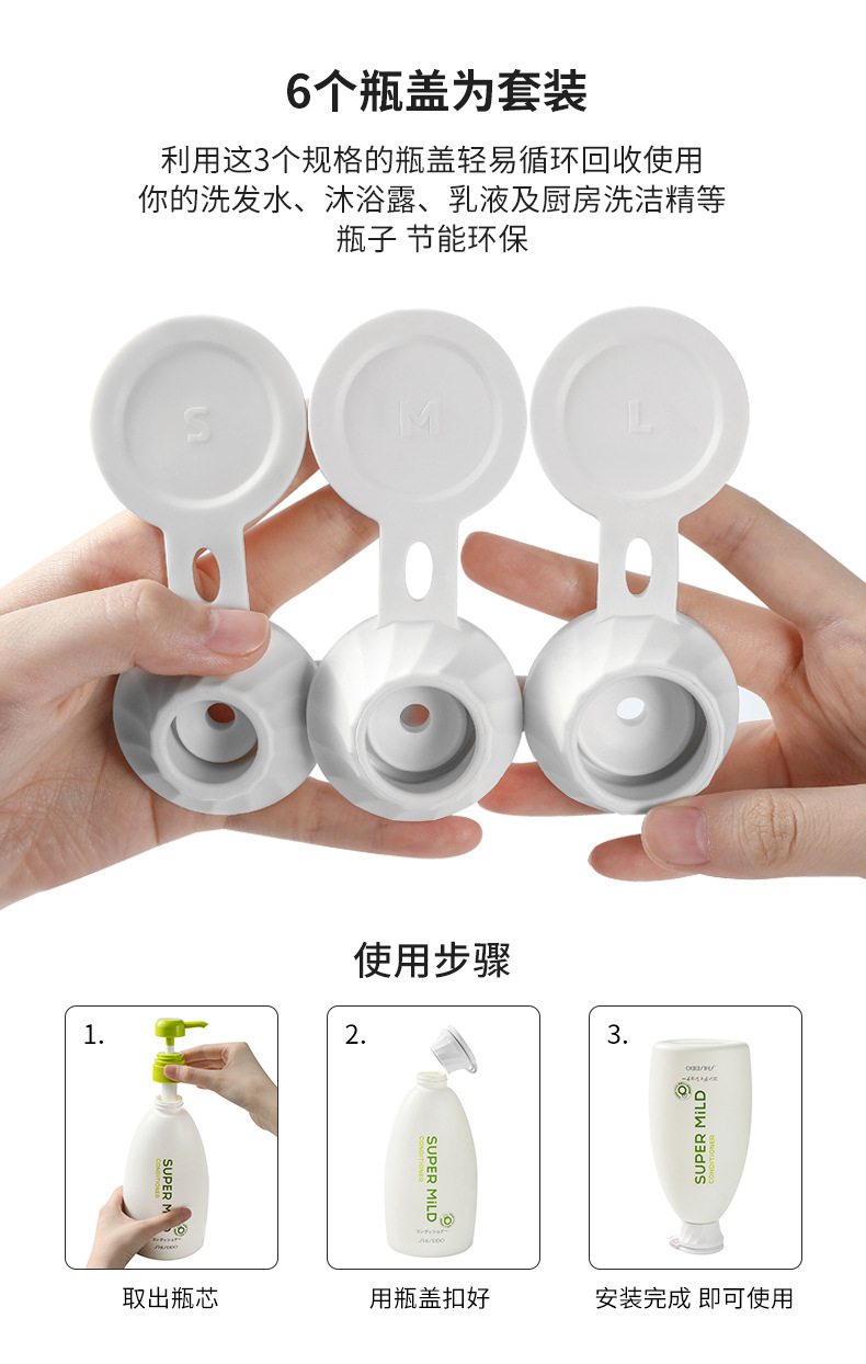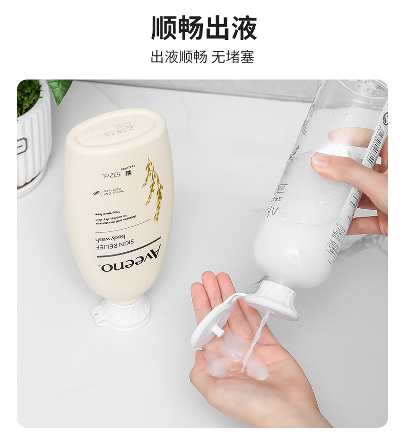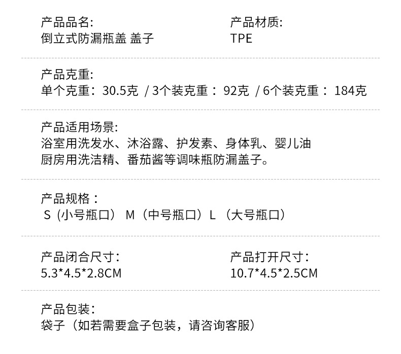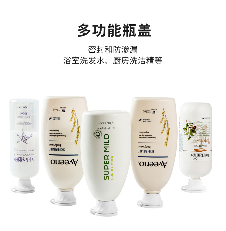 产品适用场景:浴室用洗发水、沐浴露、护发素、身体乳、婴儿油;厨房用洗洁精、番茄酱等调味瓶防漏盖子。