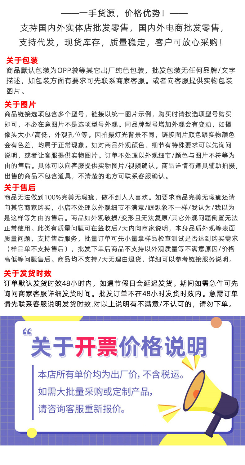 1.起订量要求:本链接一个型号一个颜色1个起订。散批混批直接拍下付款的正常24-48小时发货,请恕代发或急单请联系质询是否可以安排发出。
