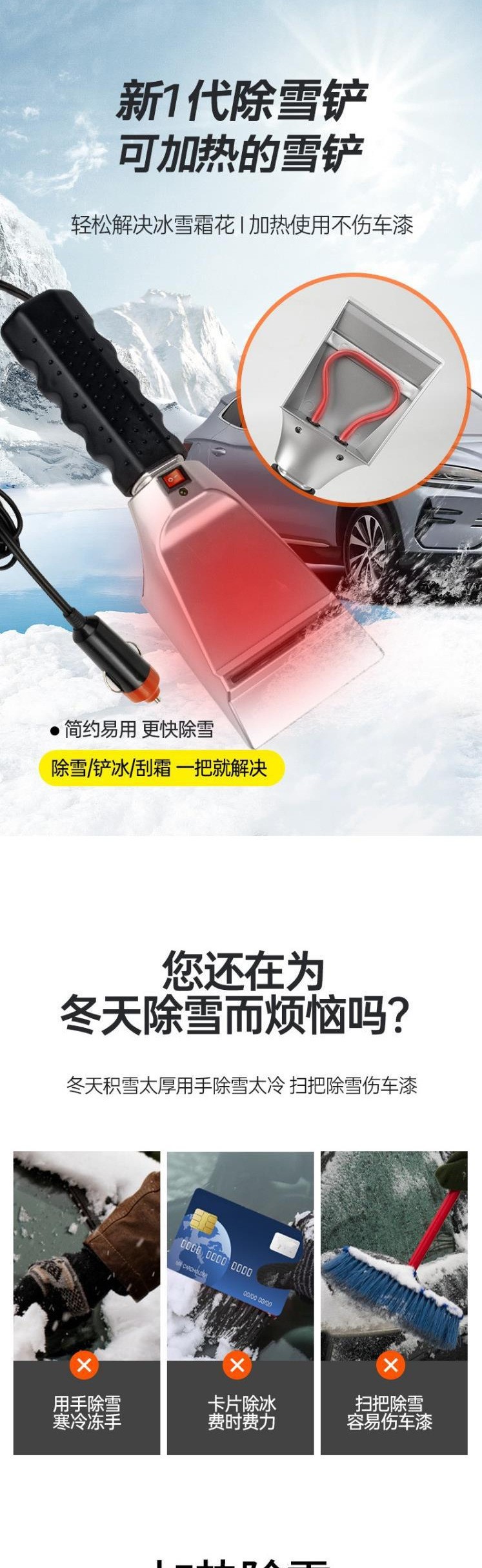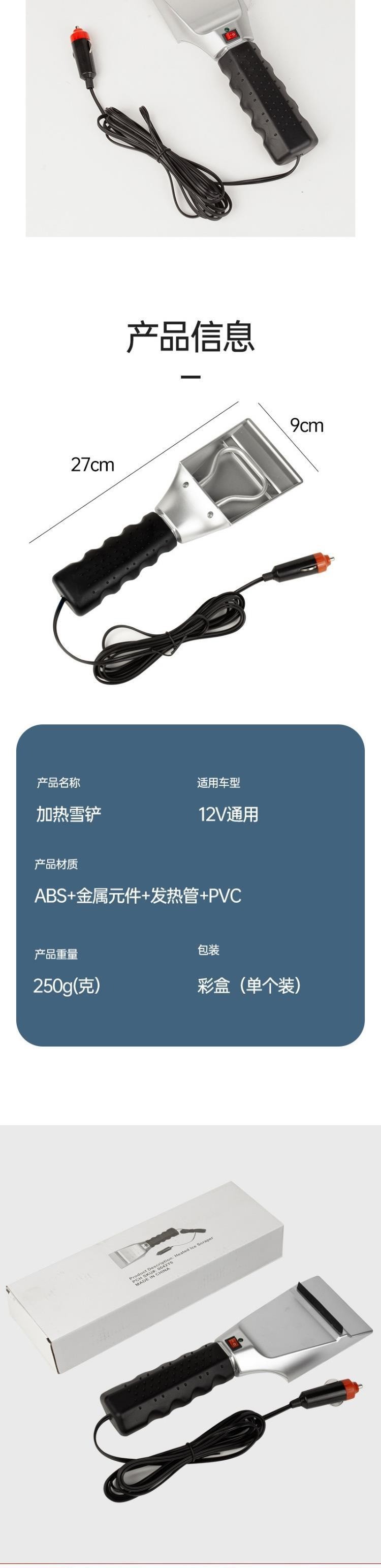 【产品特点】:车载加热雪铲,启动之后3秒左右温度开始上升提高温度在70°C左右,线长:2.7m