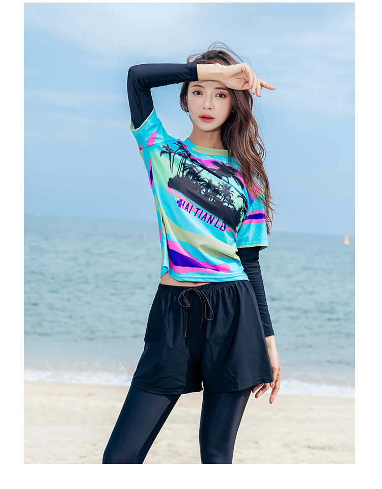 2025 여자 스플릿 4 피스 세트 온천 수영 여자 나무 풍경 외국식 반소매 디자이너 인쇄